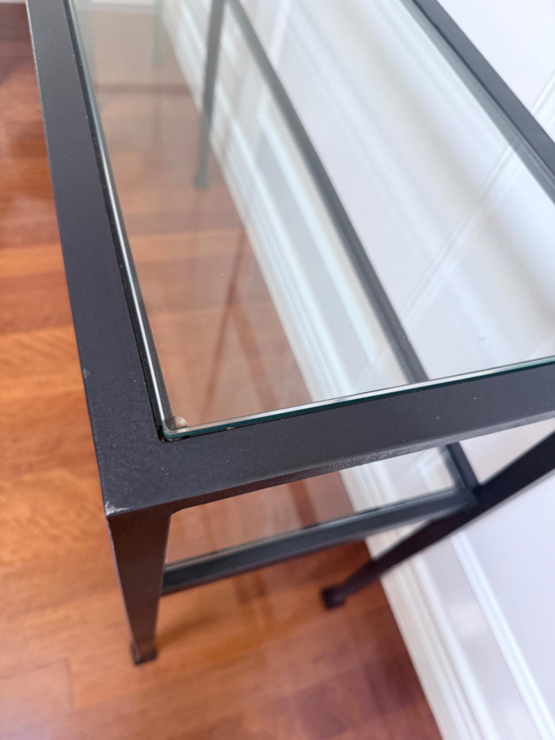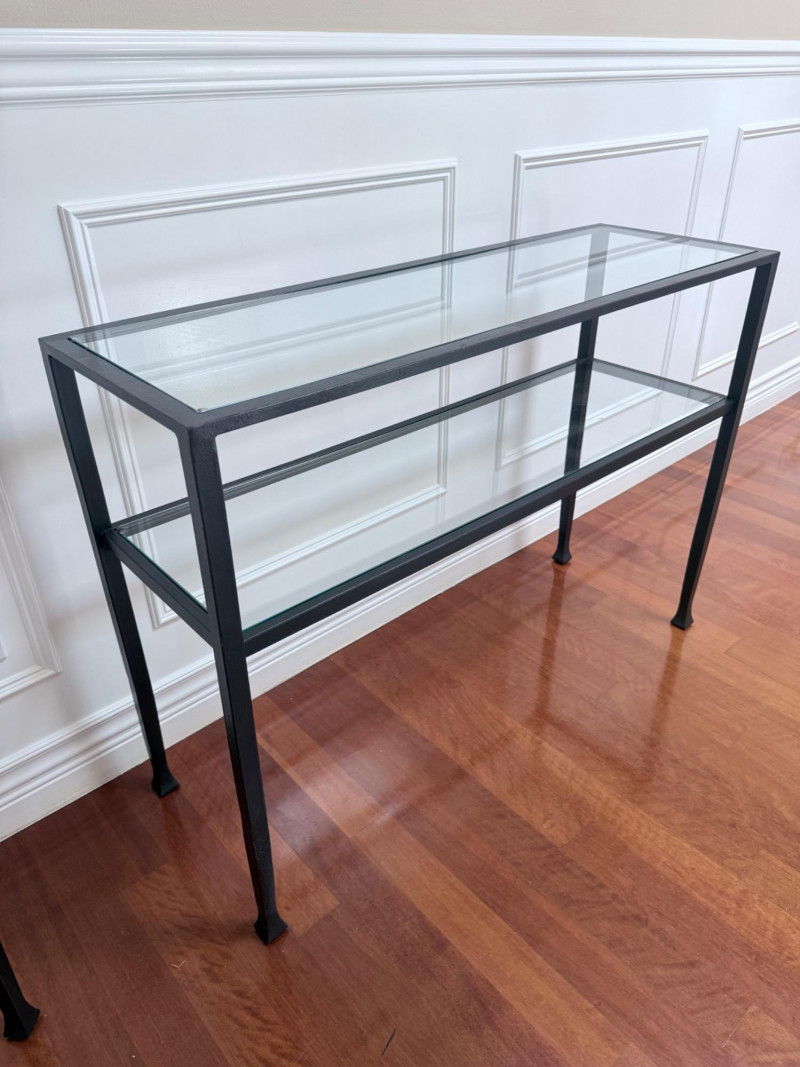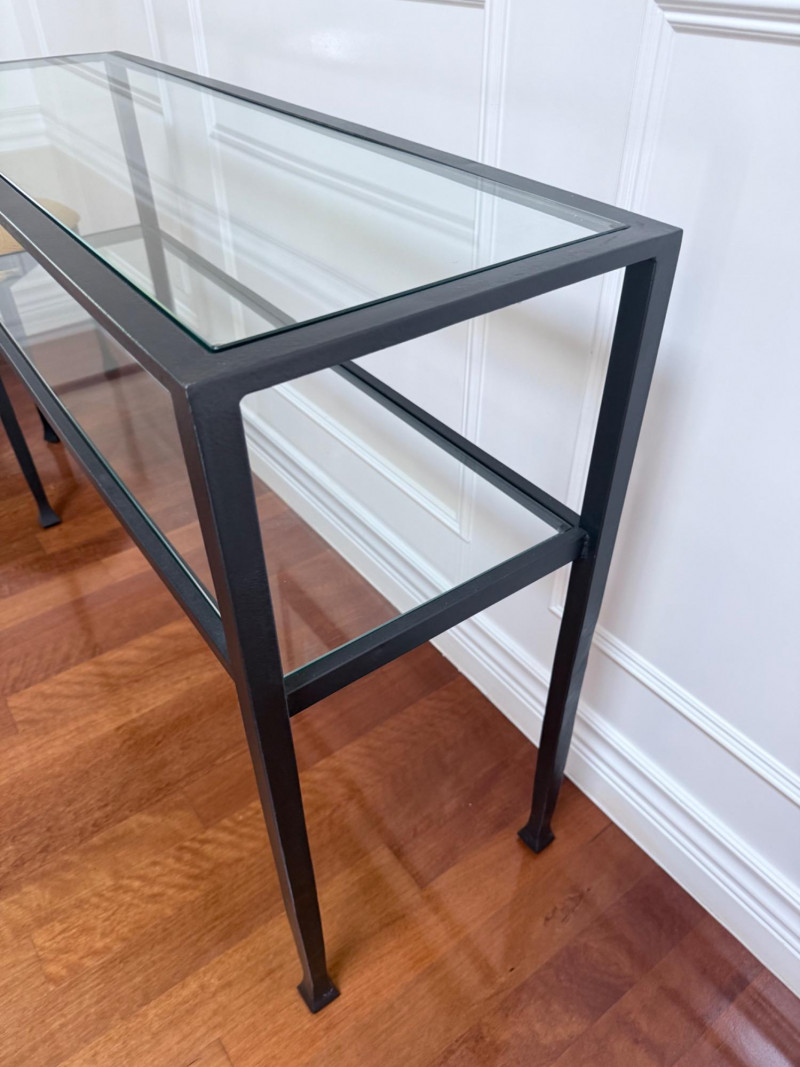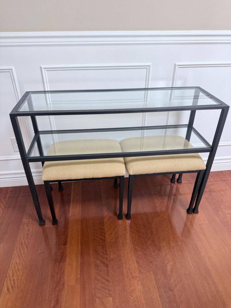 Glass Metal Console Table with Two Stools Console table constructed with a black metal frame and two-tier glass shelving. The upper and lower shelves are inset and supported at each corner by the rectangular frame. Beneath the lower shelf, two square stools with upholstered seats and matching metal legs are positioned for compact storage. Dimensions: