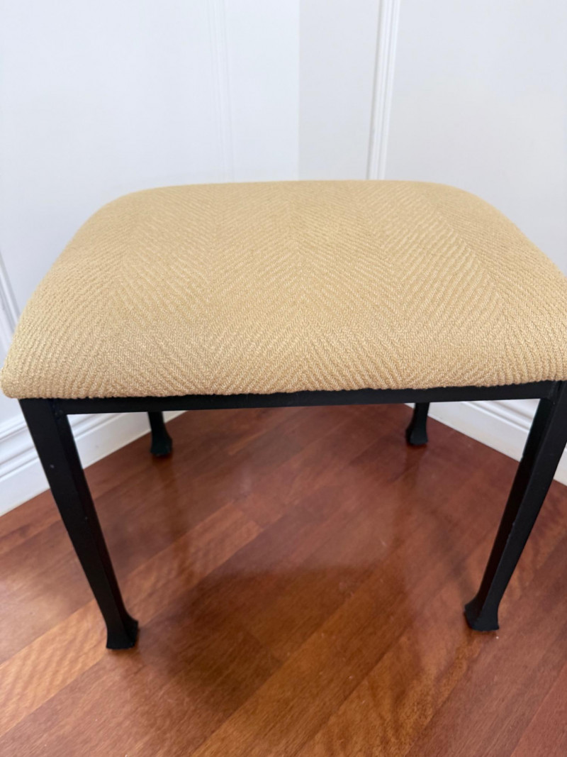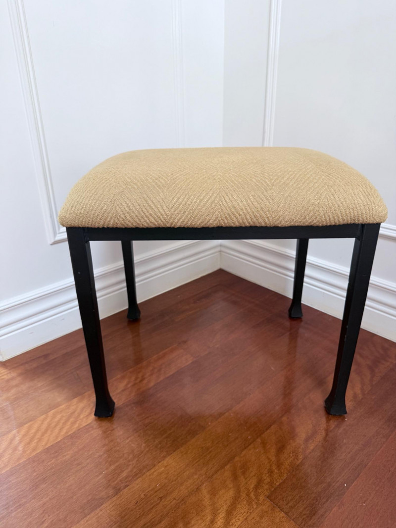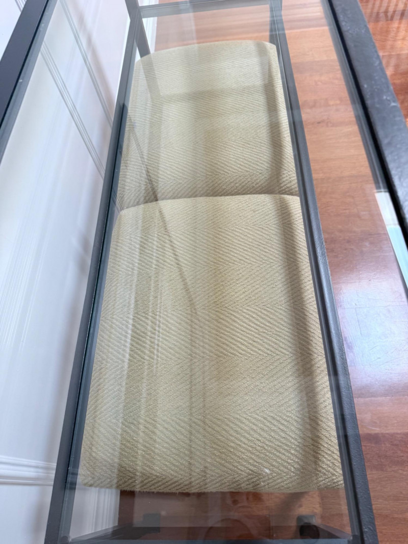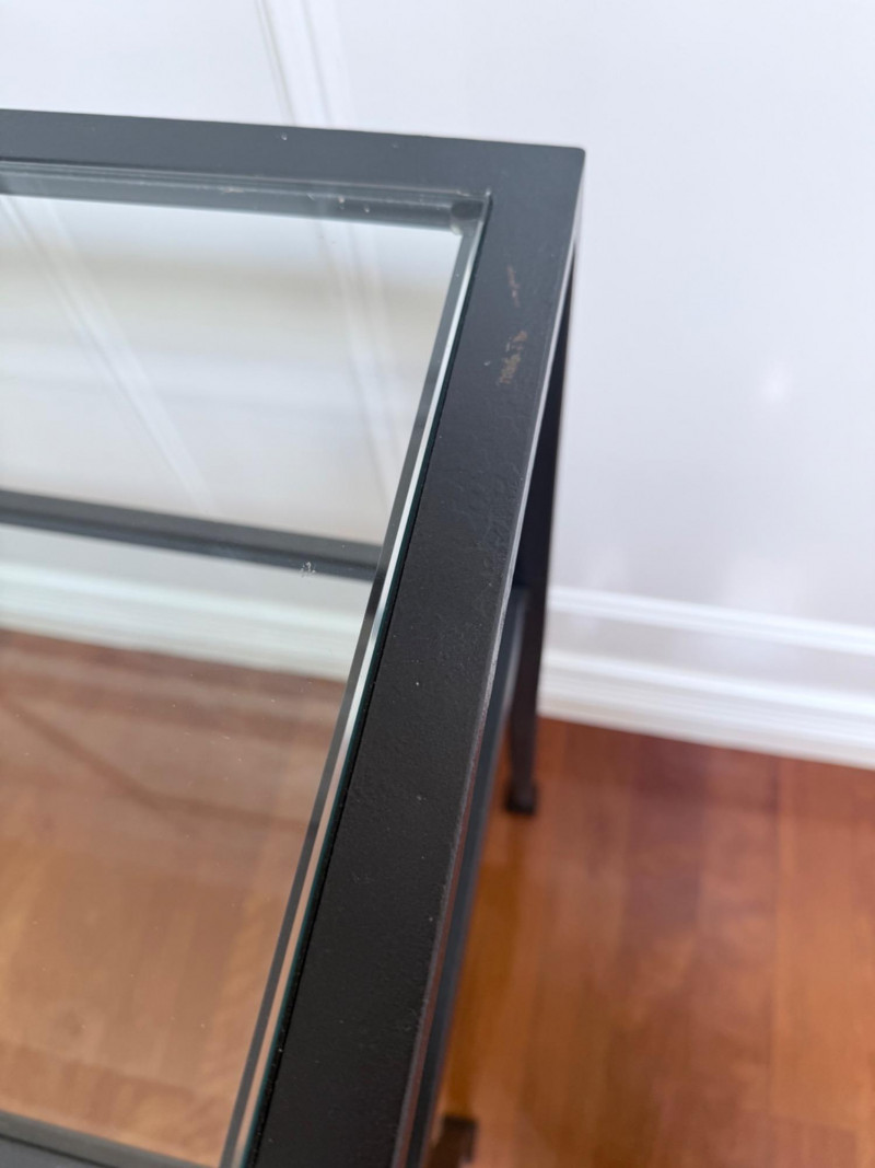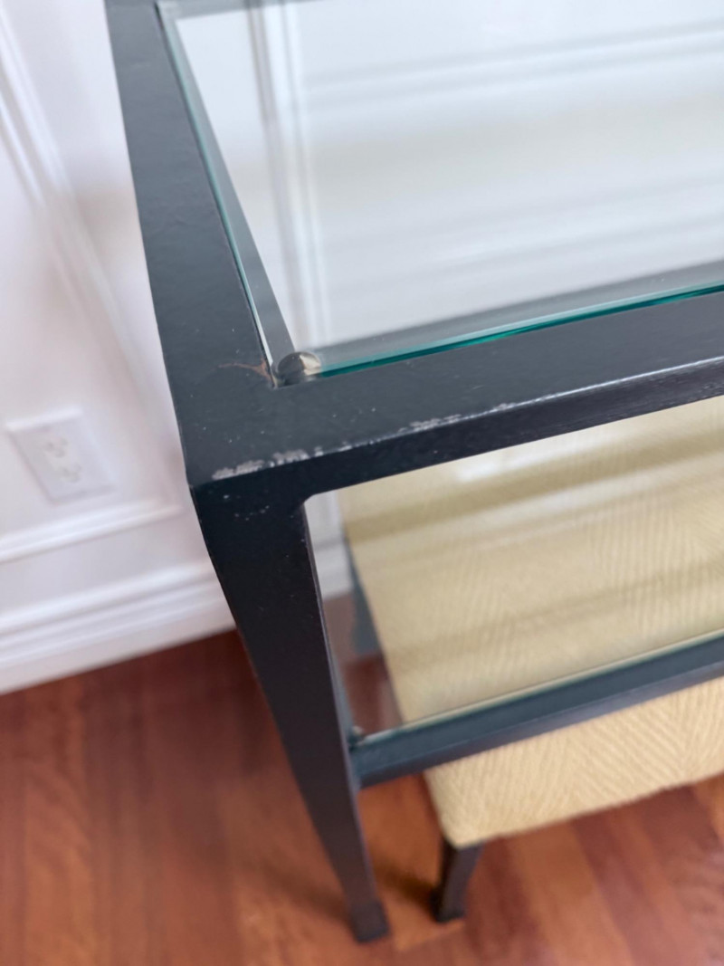 Glass Metal Console Table with Two Stools Console table constructed with a black metal frame and two-tier glass shelving. The upper and lower shelves are inset and supported at each corner by the rectangular frame. Beneath the lower shelf, two square stools with upholstered seats and matching metal legs are positioned for compact storage. Dimensions: