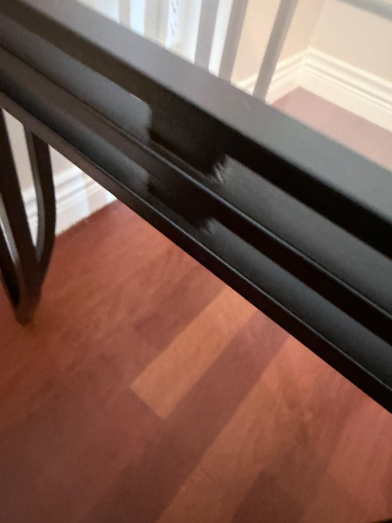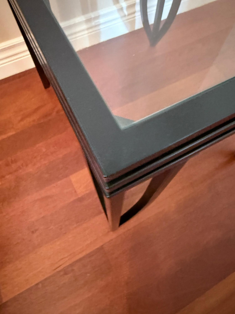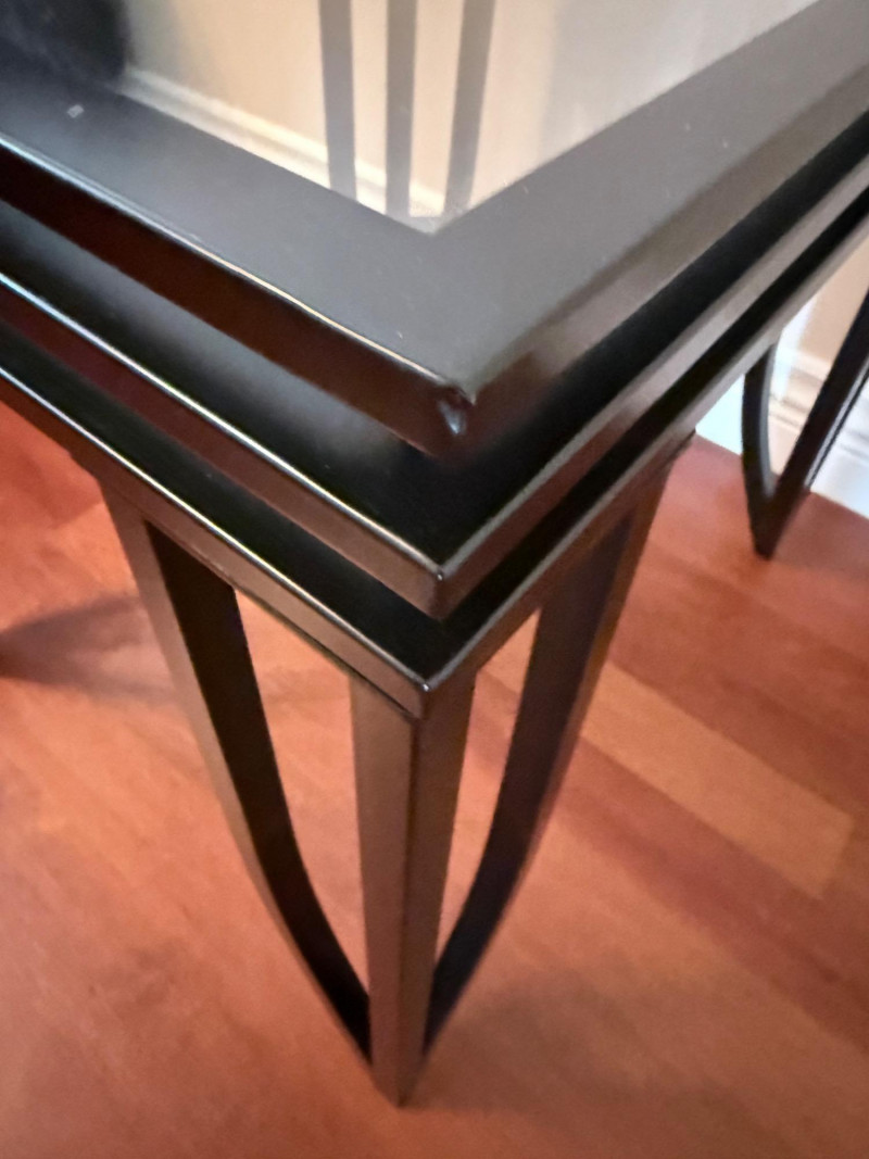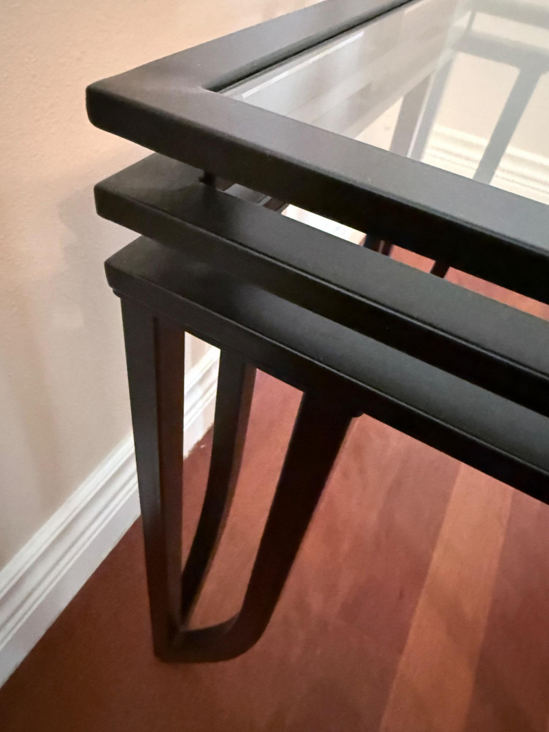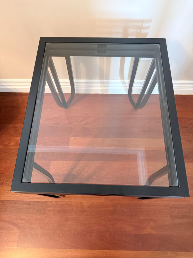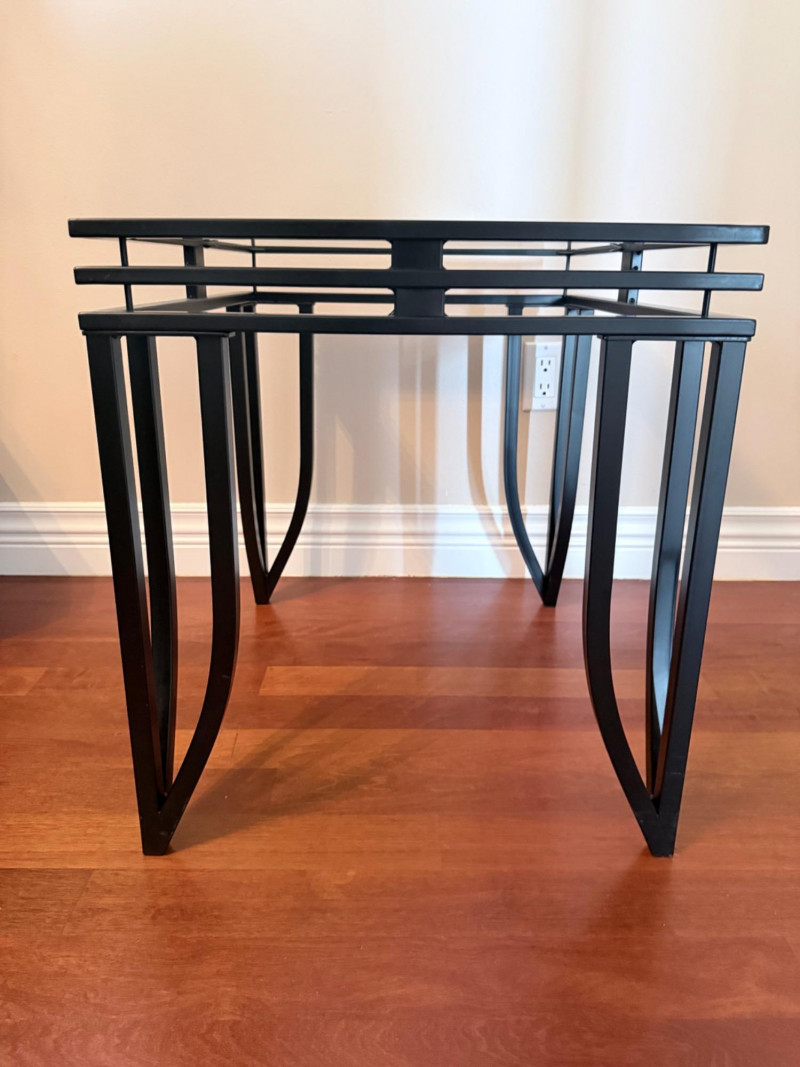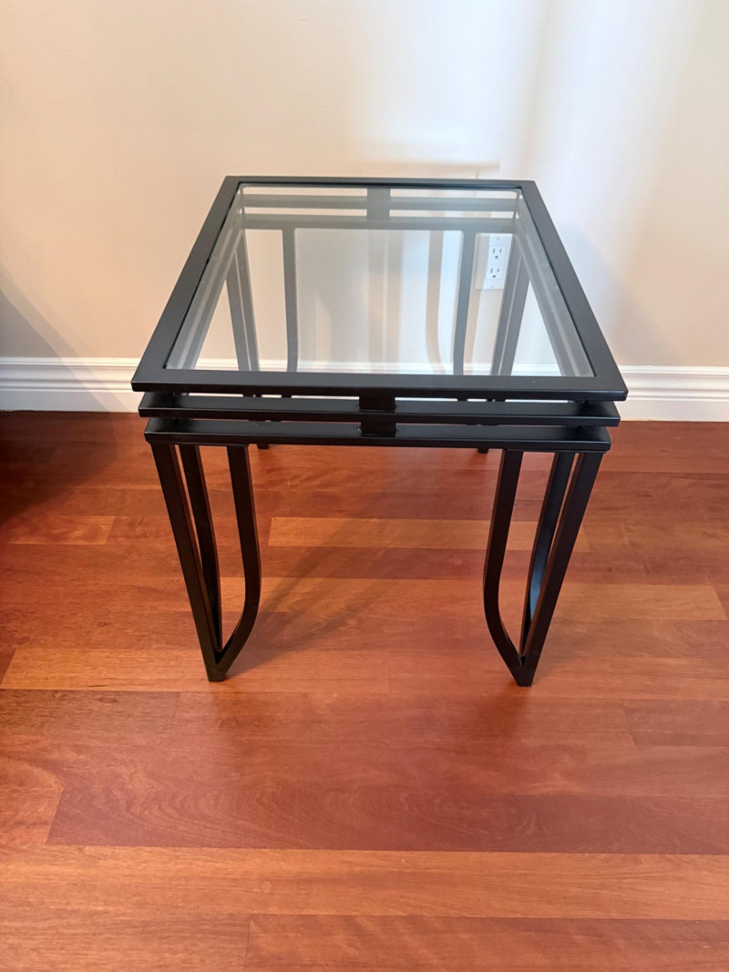 Metal End Table with Glass Top – 22" H- Comes with 2 of the Same table End table constructed with a black metal frame and a clear glass top. The upper frame includes two stacked horizontal bars supported by a set of four legs that taper downward and curve inward before flaring out at the base. The legs are joined in pairs by vertical supports that mirror the outer contour. Dimensions: 20" W x 24" D x 22" H