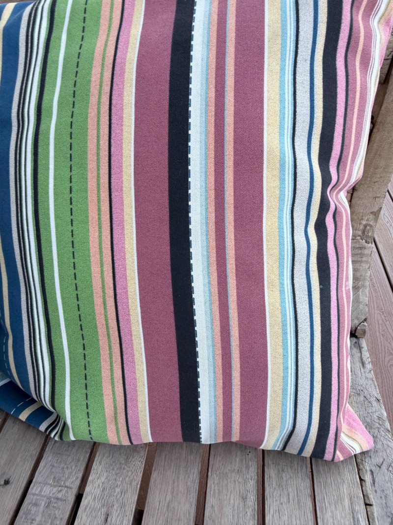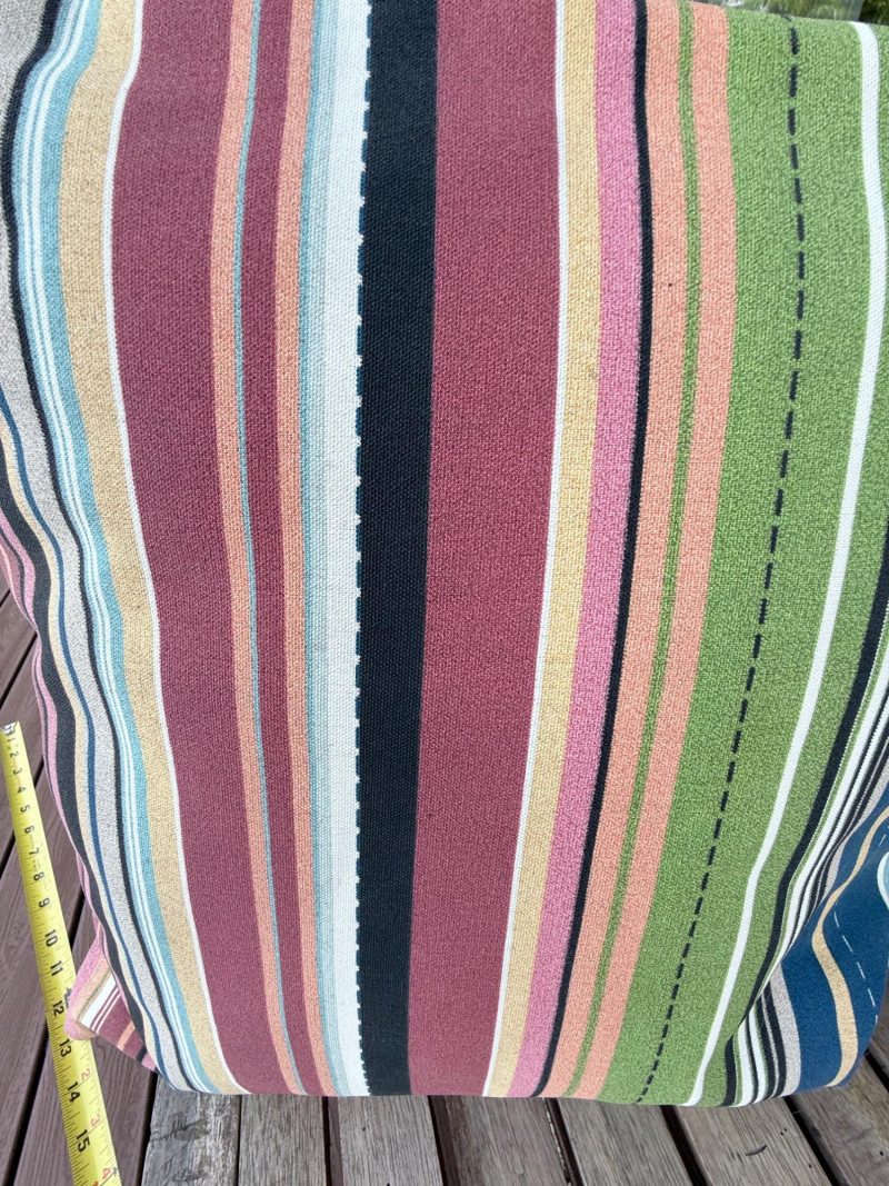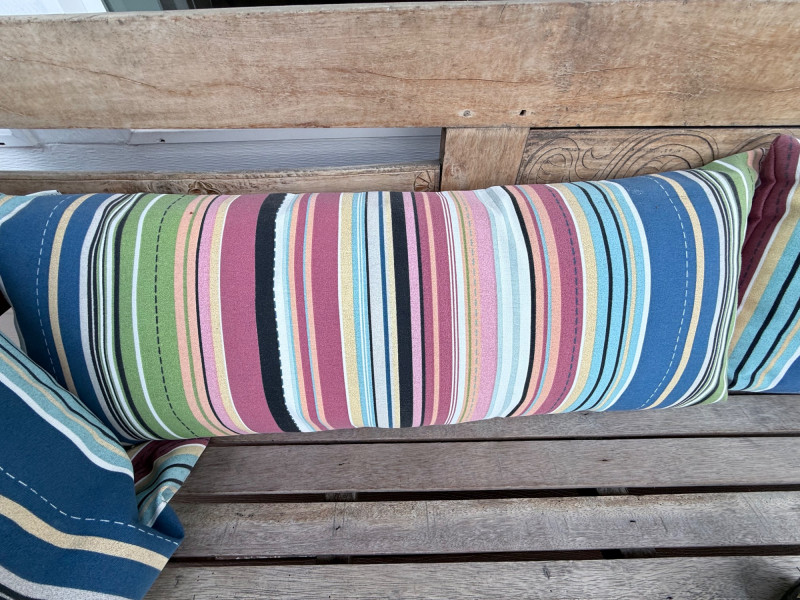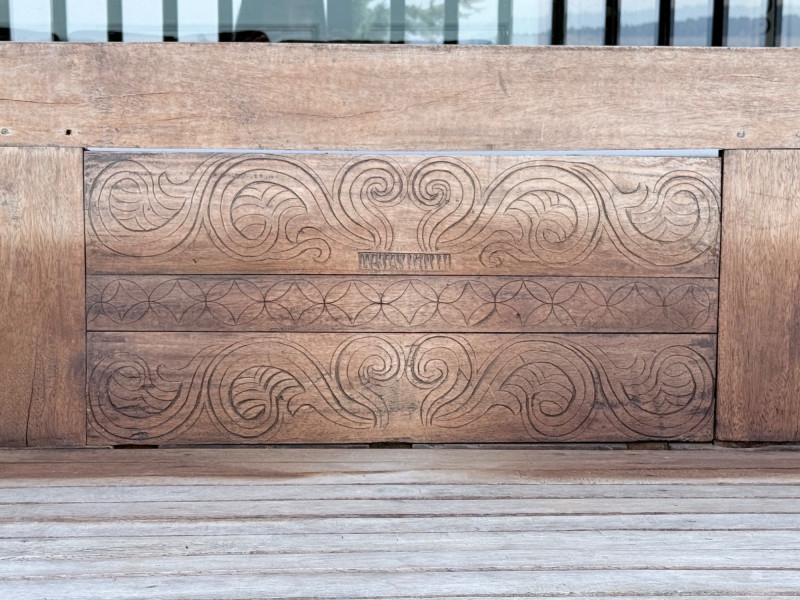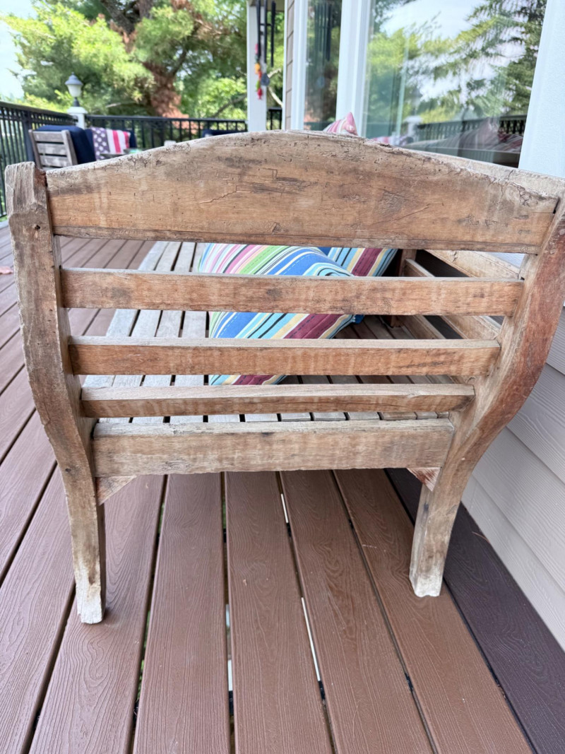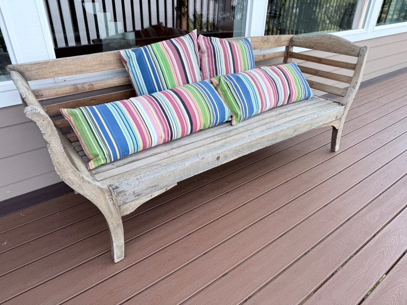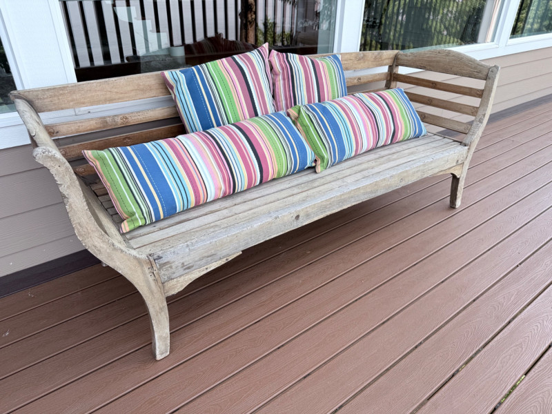Carved Wood Outdoor Slatted Bench with Pottery Barn Cushions Outdoor bench constructed with a wide seat and slatted backrest and arms. The frame features a central back panel with carved scroll and geometric motifs. The panel includes an inscription that is partially worn and unreadable. The armrests and legs are shaped in continuous curves. The slats are joined with exposed hardware across the frame. Possibly teak wood. 82" W x 27.5 D x 31" H