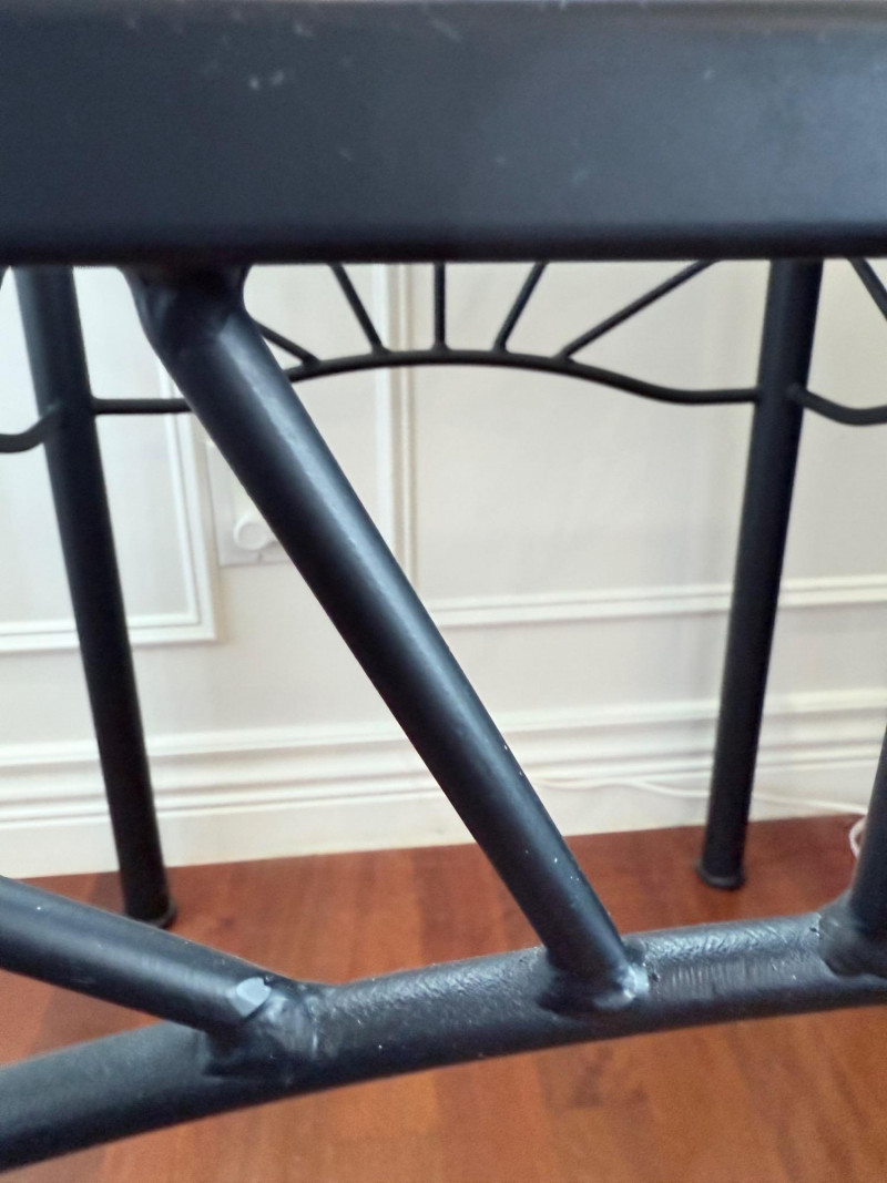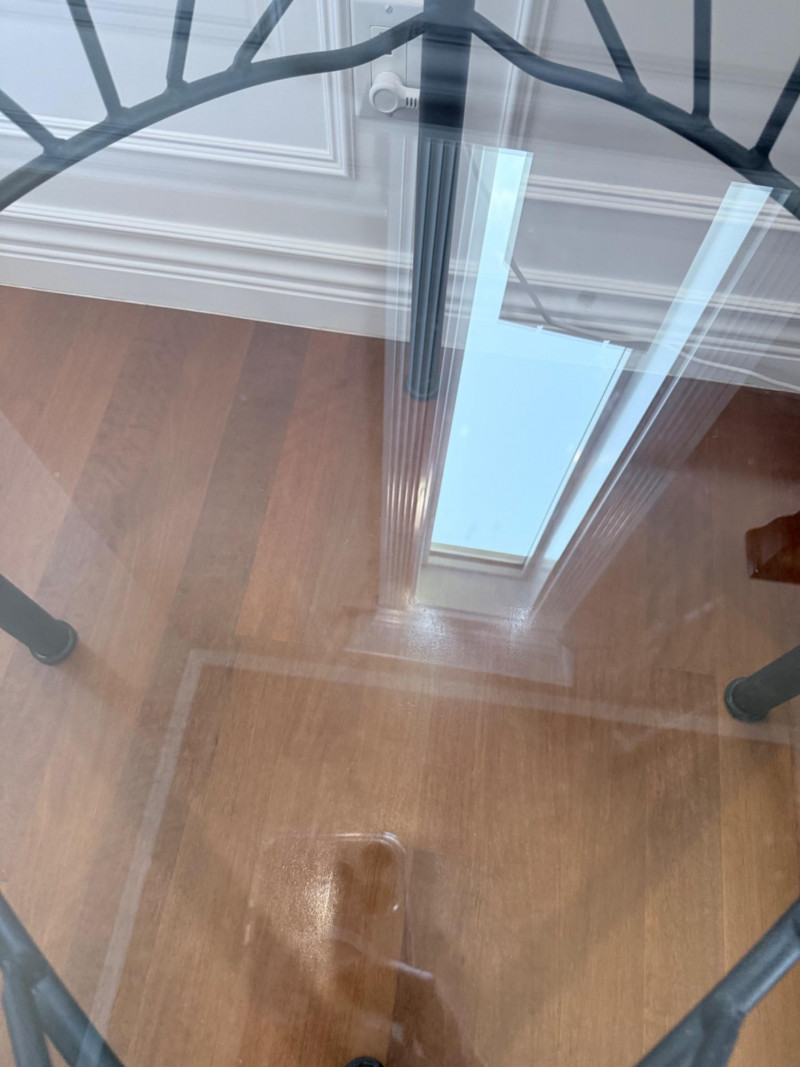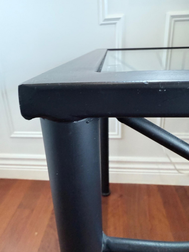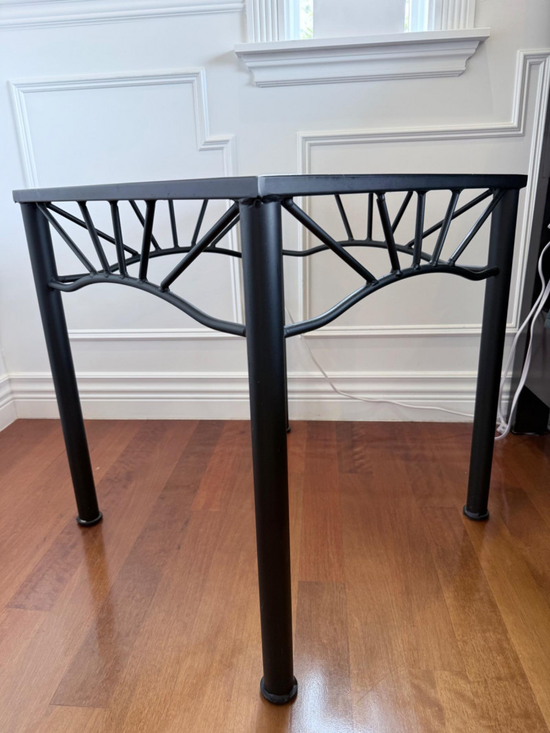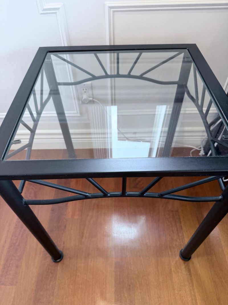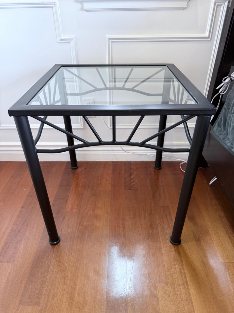 Metal End Table with Glass Top – 24" Tall Square metal end table with a recessed glass panel set into the top frame. Supported by cylindrical legs, each side features an arched brace with angled inner bars forming a geometric pattern. Dimensions: 23" W x 23" D x 24" H