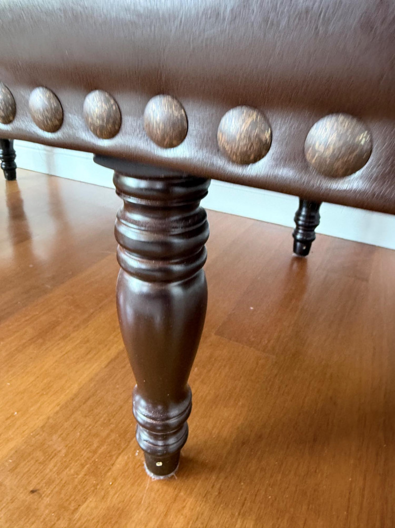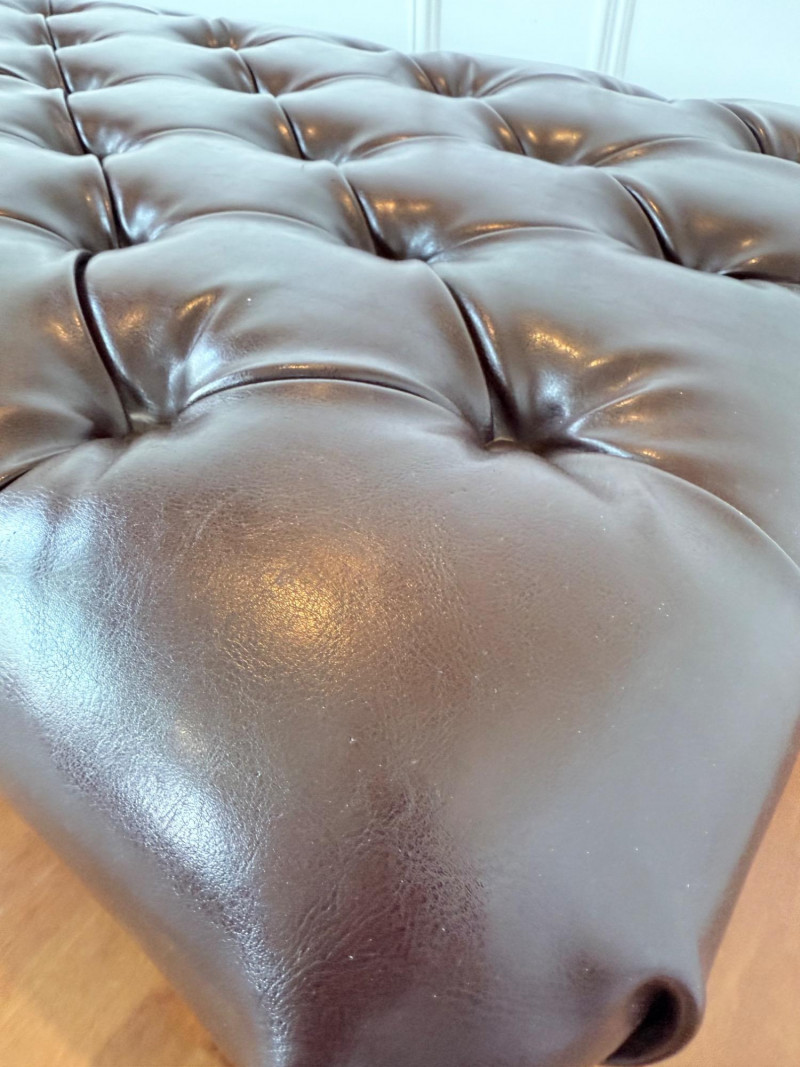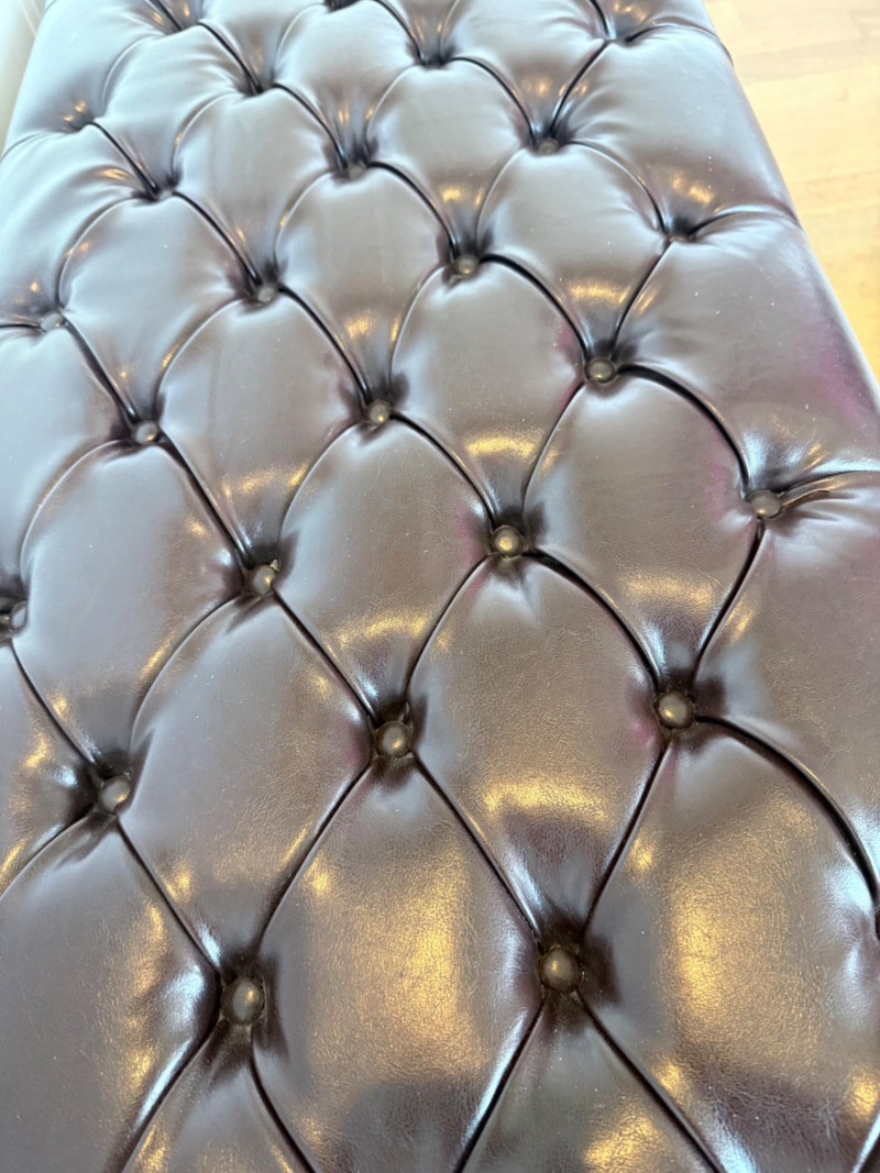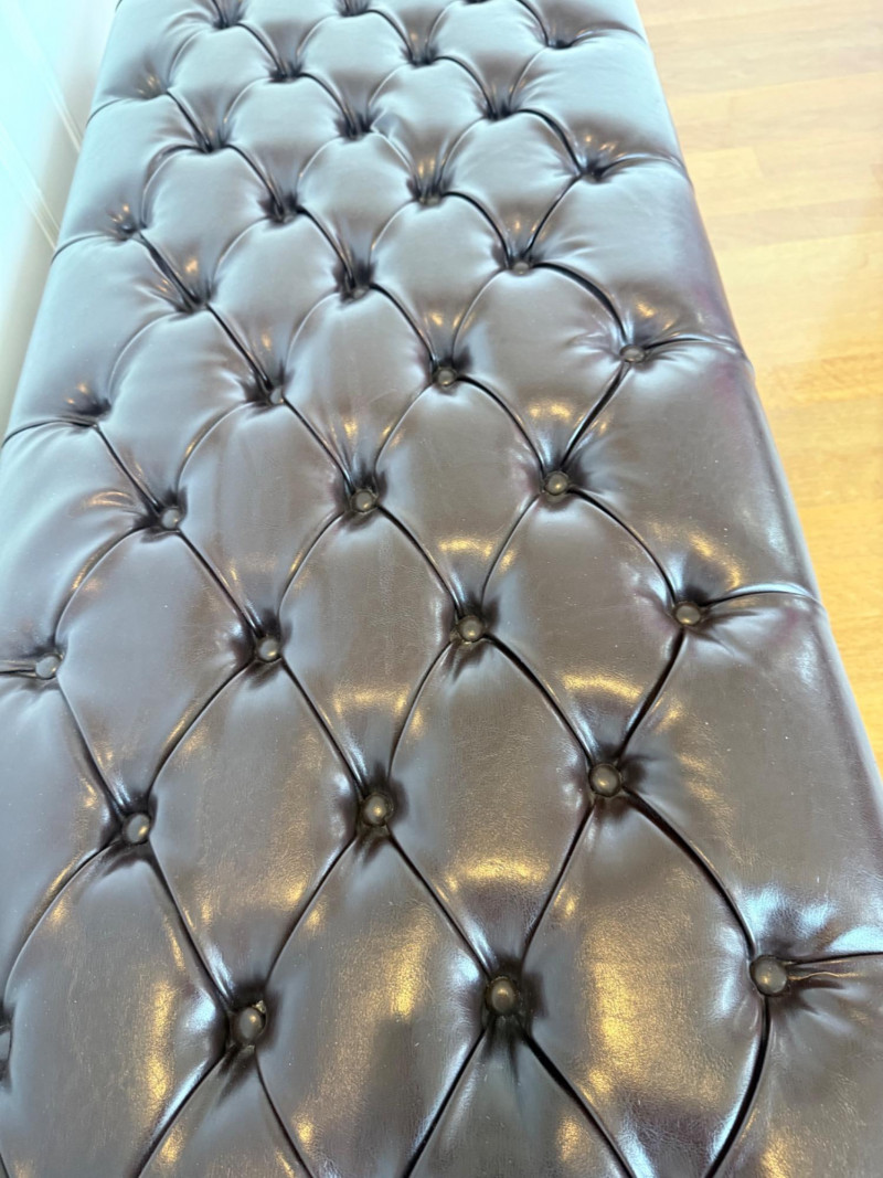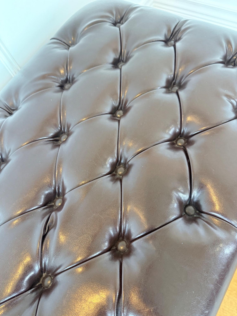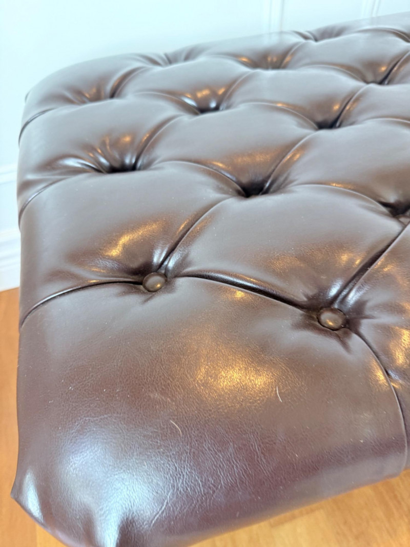 Chesterfield Upholstered Bench – 64" Wide Rectangular bench with a tufted seat upholstered in a leather-like synthetic material (not leather). The surface features a grid of deep button tufts. A row of metal nailhead trim runs along the lower edge. The bench stands on six turned wooden legs. No rips or tears are present. Dimensions: 64" W x 22" D x 17" H