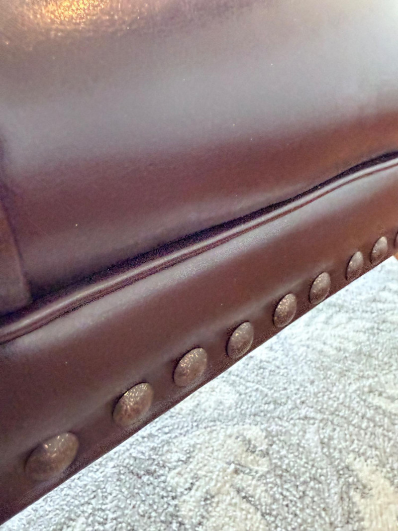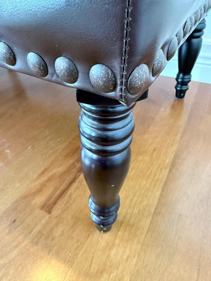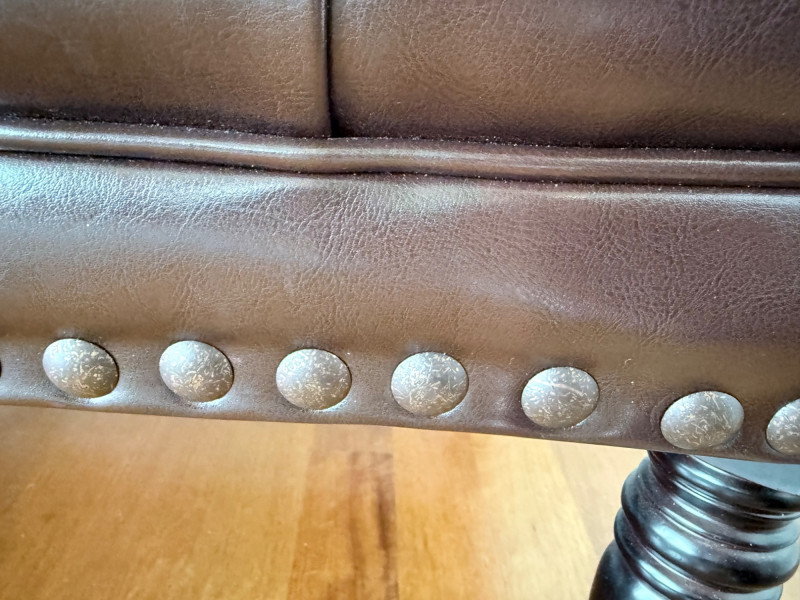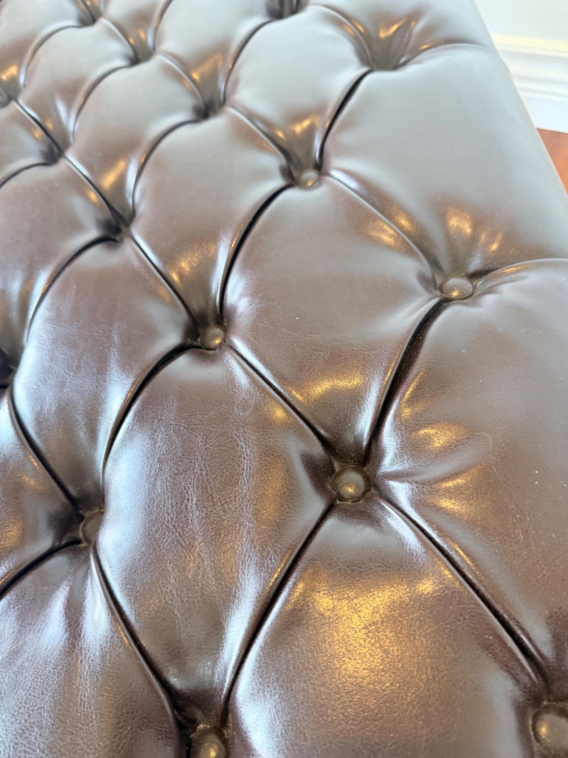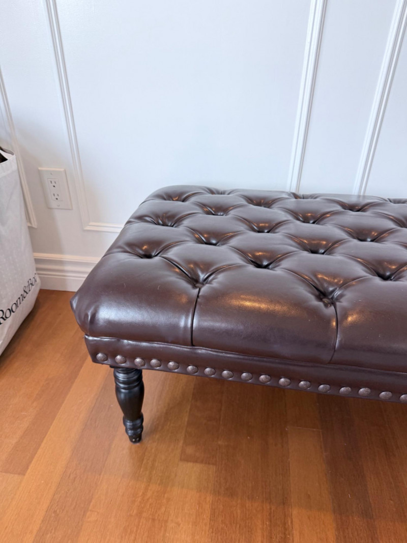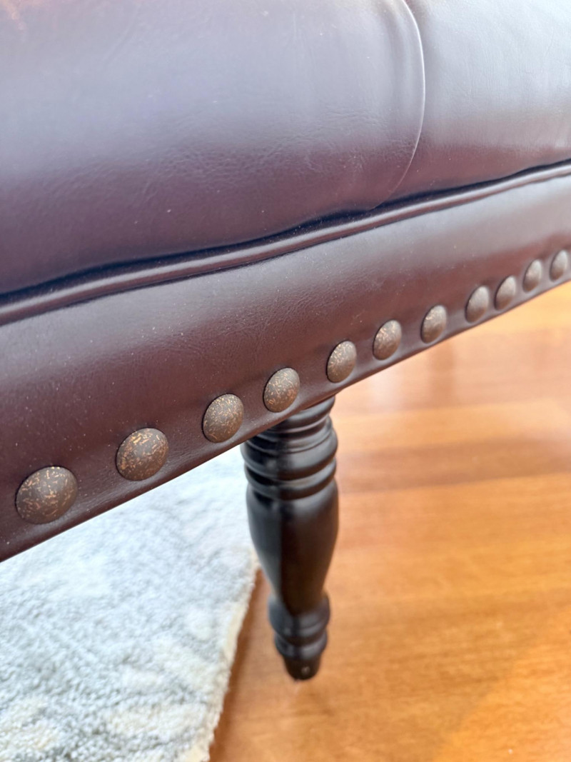 Chesterfield Upholstered Bench – 64" Wide Rectangular bench with a tufted seat upholstered in a leather-like synthetic material (not leather). The surface features a grid of deep button tufts. A row of metal nailhead trim runs along the lower edge. The bench stands on six turned wooden legs. No rips or tears are present. Dimensions: 64" W x 22" D x 17" H