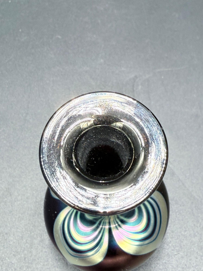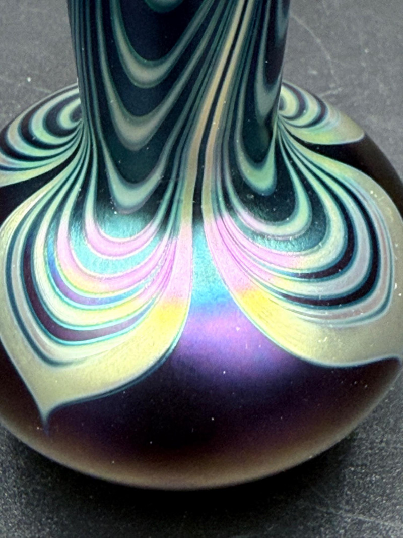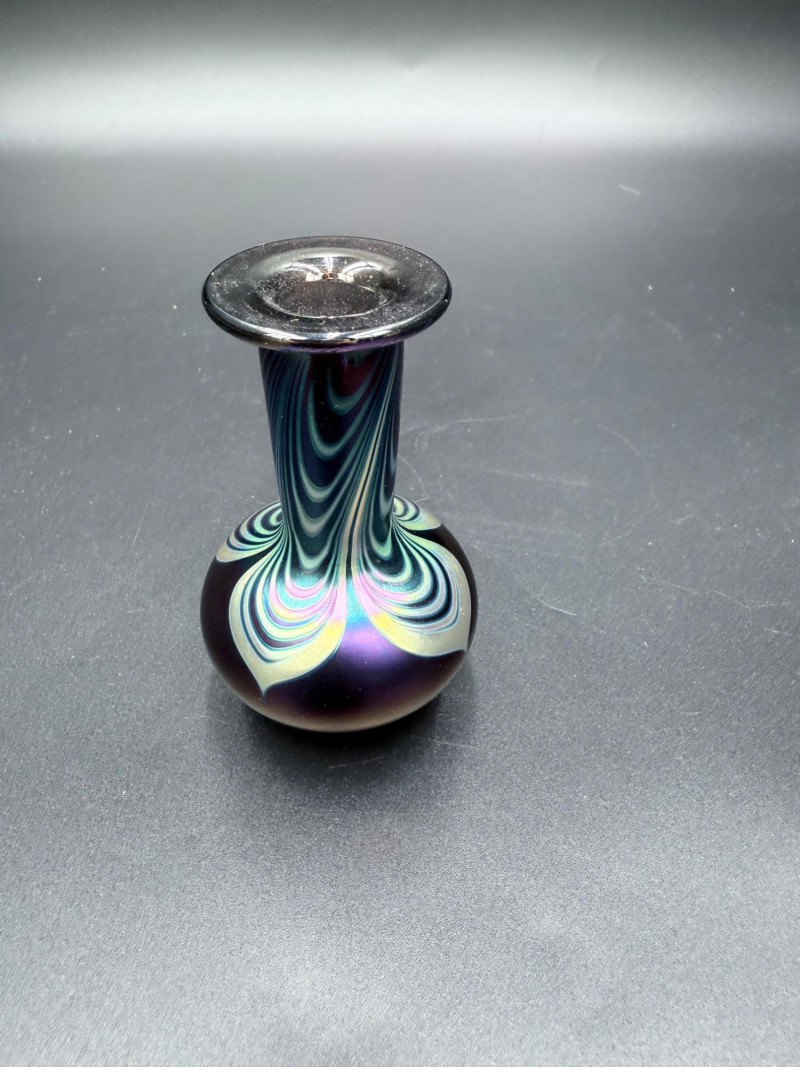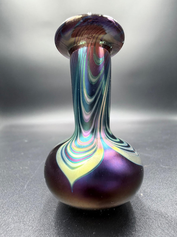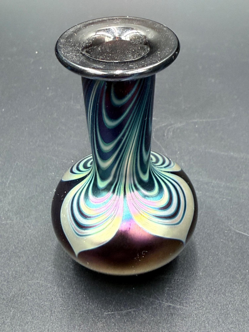 Small glass vase with multicolor swirl pattern and narrow flared rim. Signed “Abelmann 1985–93” on the base.