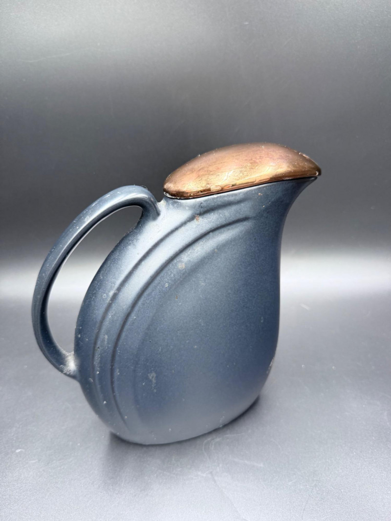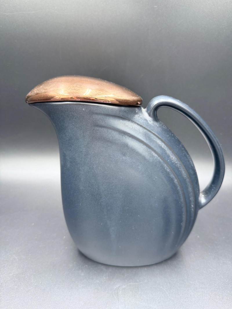 Lidded pitcher with curved handle and spout. Features smooth body and fitted top.