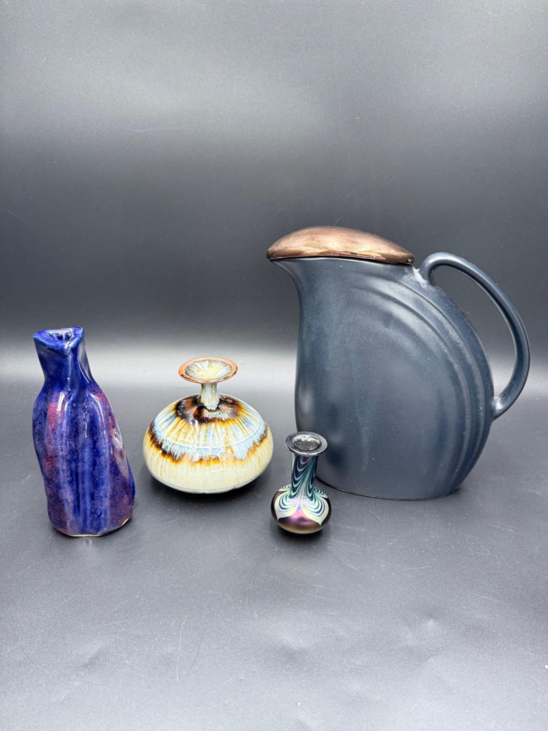 Studio Vessel and Art Glass Collection – 4 Pieces Group of four handmade vessels including signed and studio-marked works. The selection includes one art glass piece and three sculptural forms with varied shaping and surface finishes. Signed Iridescent Glass Vase by Abelmann – 3.25" H Studio Vessel Marked “Jewell” – 4.5" H x 4.5" Dia Studio Vessel Marked “JSS” – 6" H x 3" Dia Studio Pitcher with Lid – 9" L x 9" H x 4" W