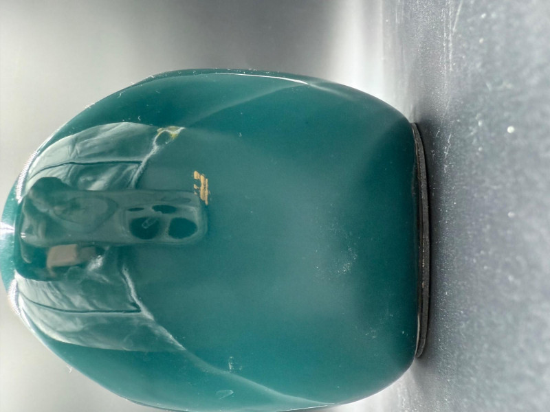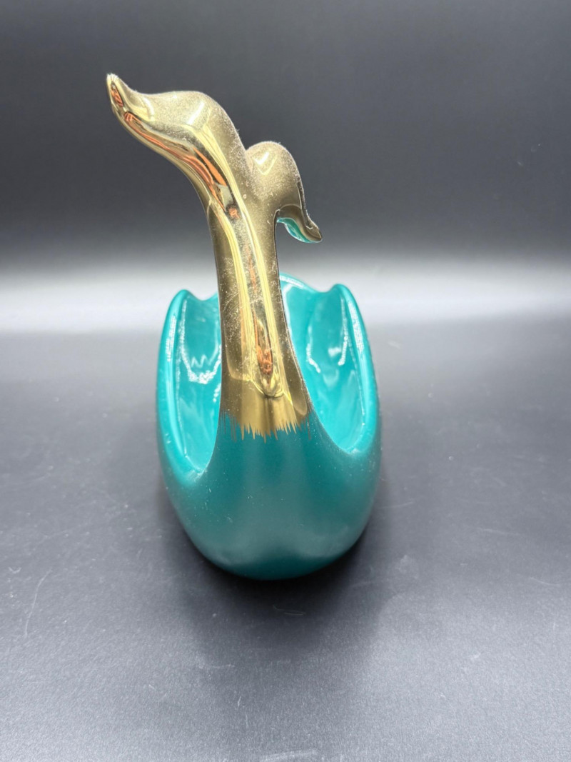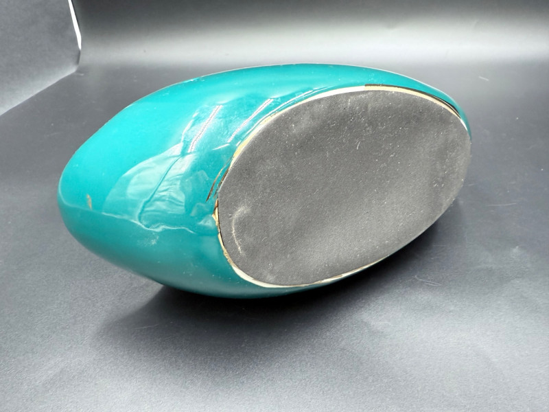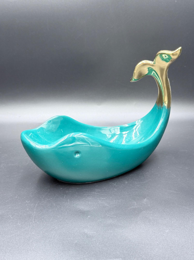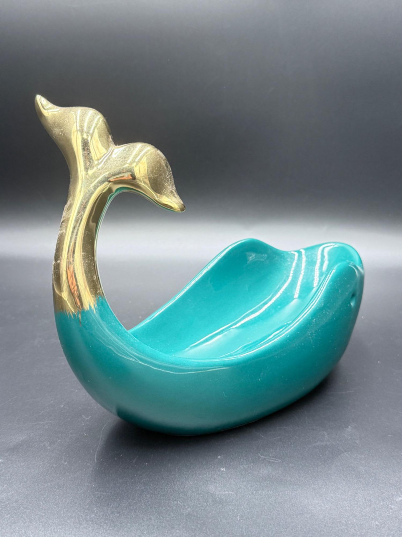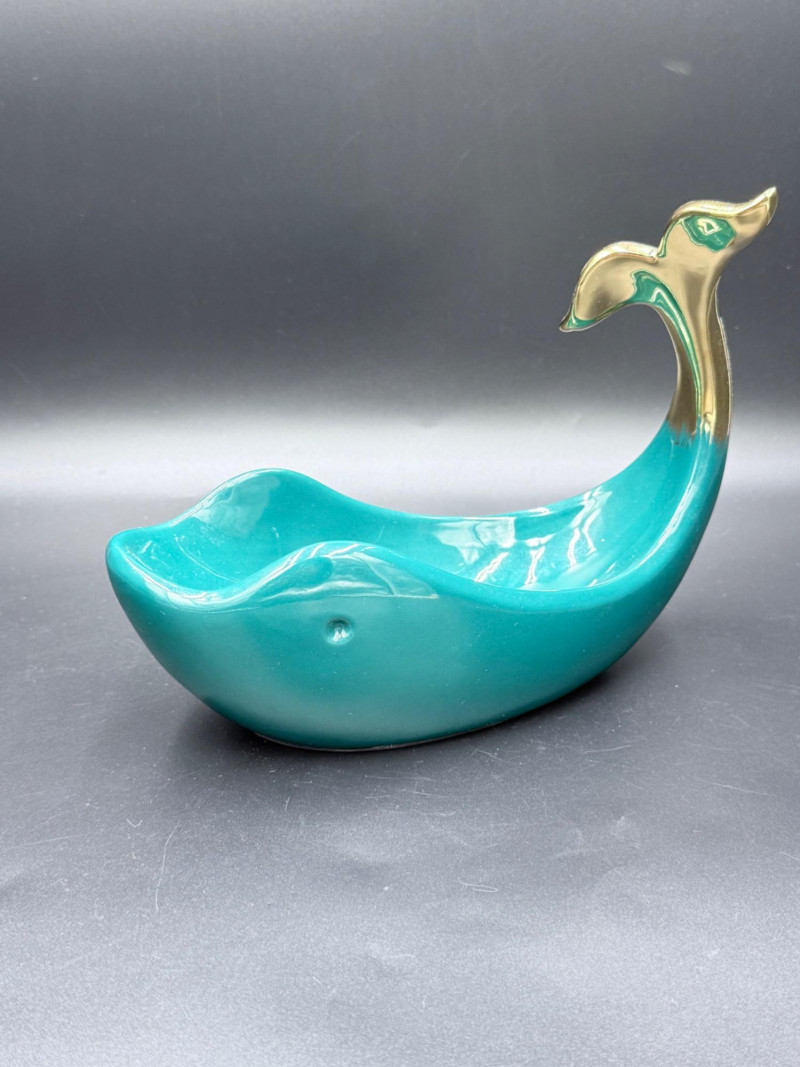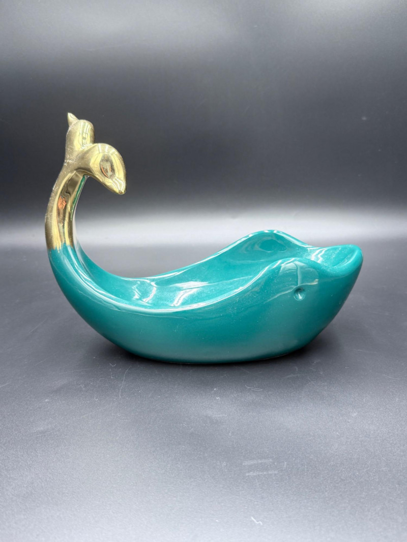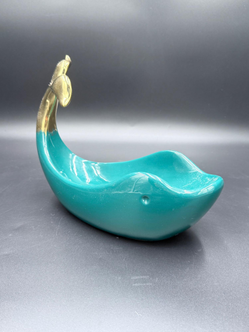 Teal Whale Dish with Gold-Tone Tail Sculptural dish shaped as a whale with a gold-tone tail and a recessed interior suited for holding small items. The piece features a smooth finish and a lined underside for surface protection.