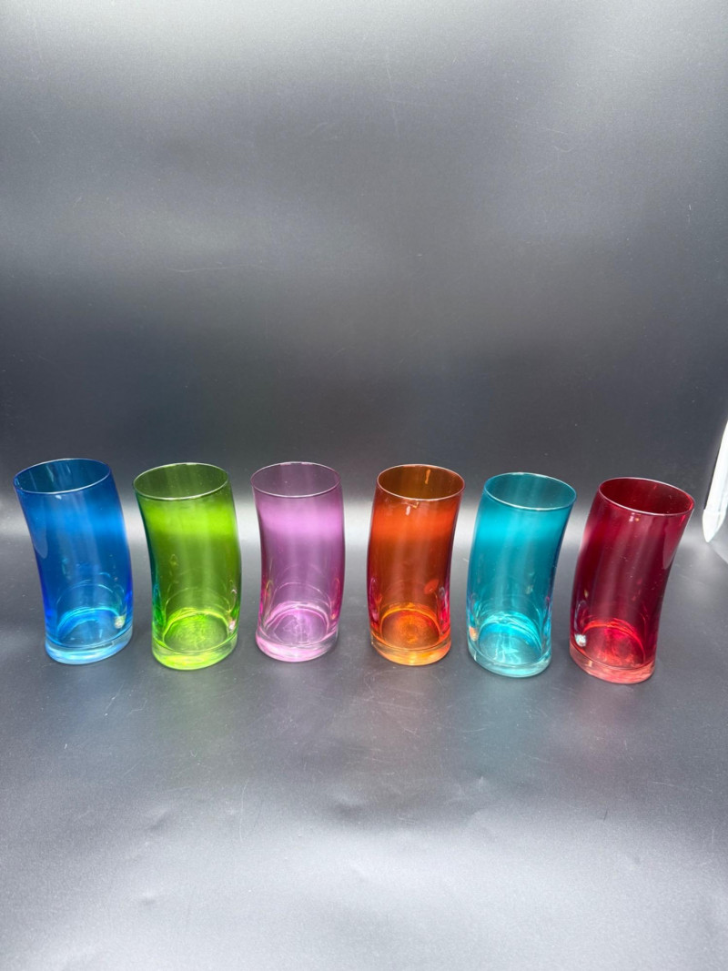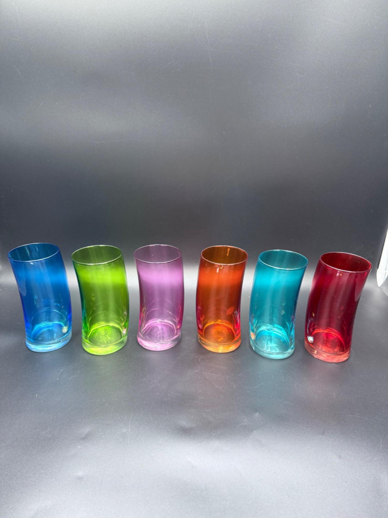 Leonardo Rainbow Swing Highball Glasses – Set of 6 Set of six curved glass tumblers in translucent colors. Each piece features a cylindrical form with a slight outward tilt and a thick flat base. Likely from the Rainbow Swing line by Leonardo. Category: Drinkware