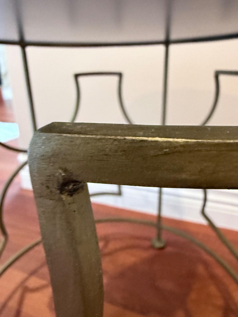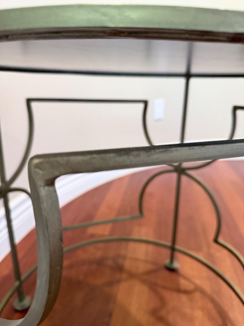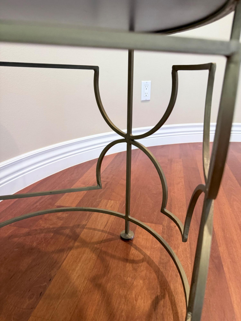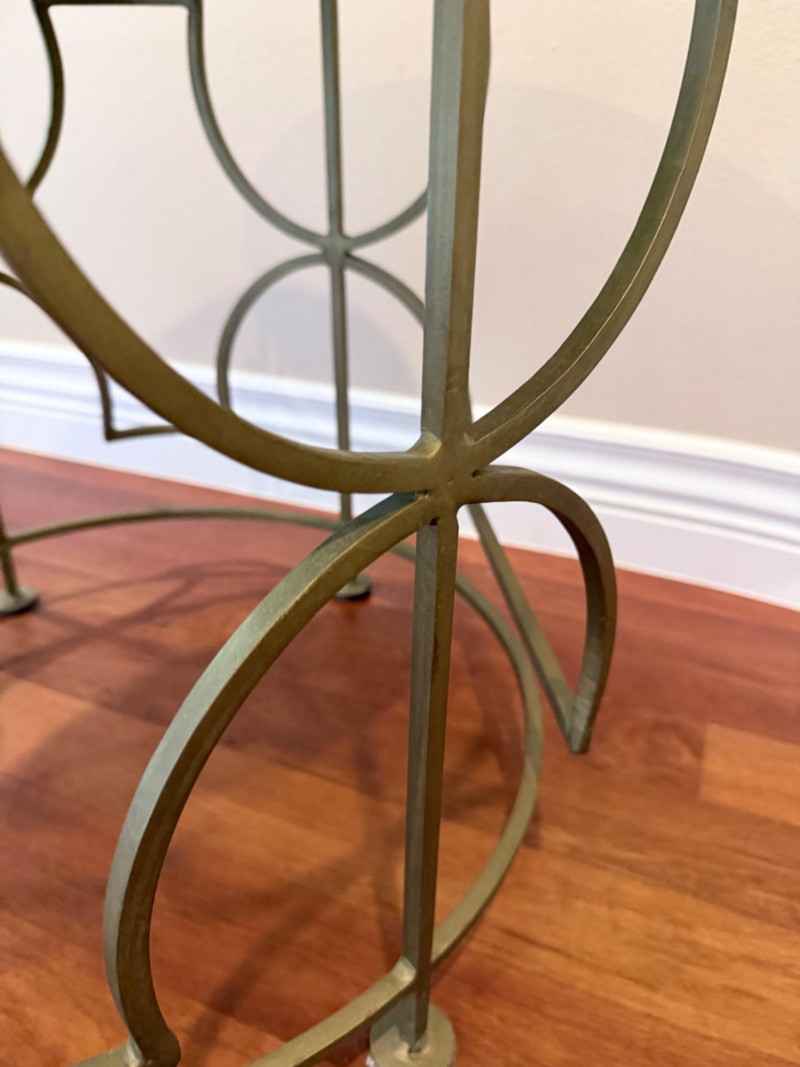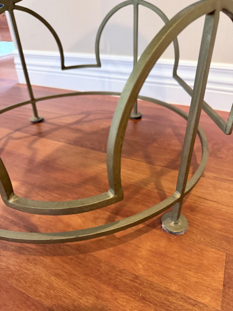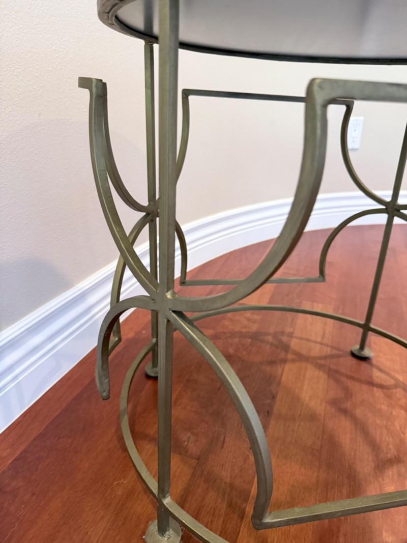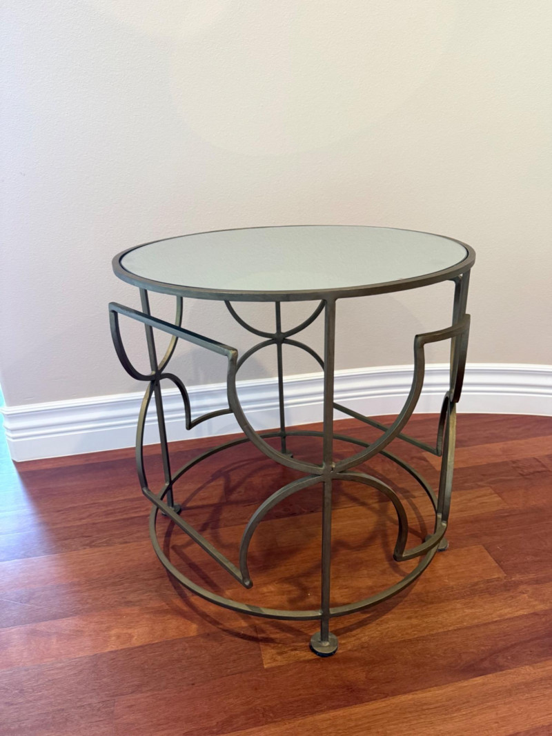 Round Gold-Tone Metal Side Table with Mirrored Top Round side table with a mirrored glass top and a gold-tone metal frame featuring curved and angular openwork designs. The structure includes a circular base ring and four upright supports connected to a raised rim that secures the top panel. Dimensions: