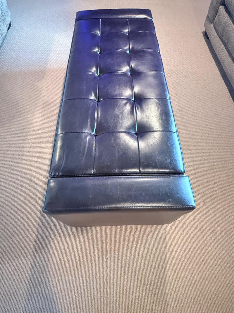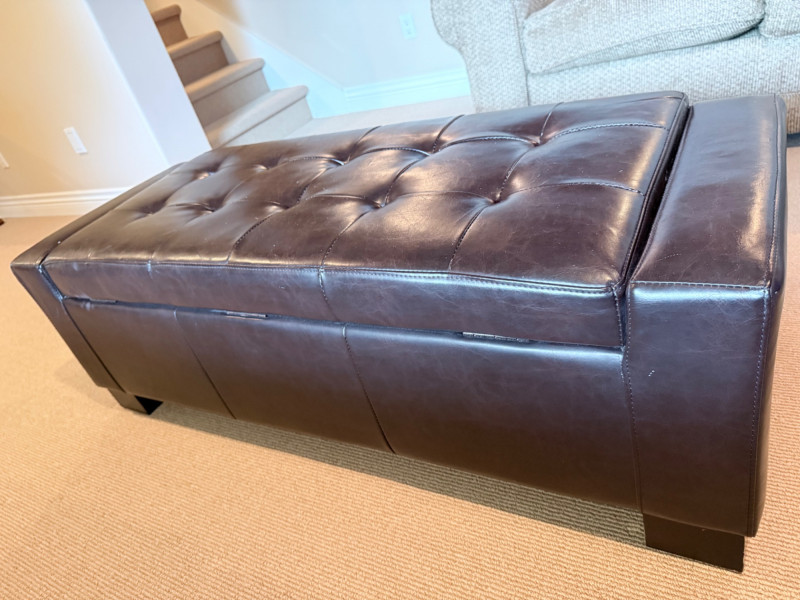 Espresso Brown Polyurethane Storage Bench – 51" Wide Rectangular storage bench with a tufted top and hinged lid that opens to an internal compartment. Upholstered in polyurethane and supported by block feet. Dimensions: