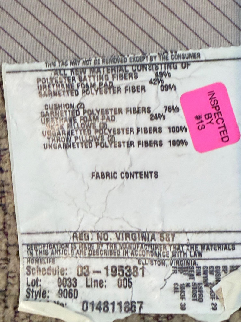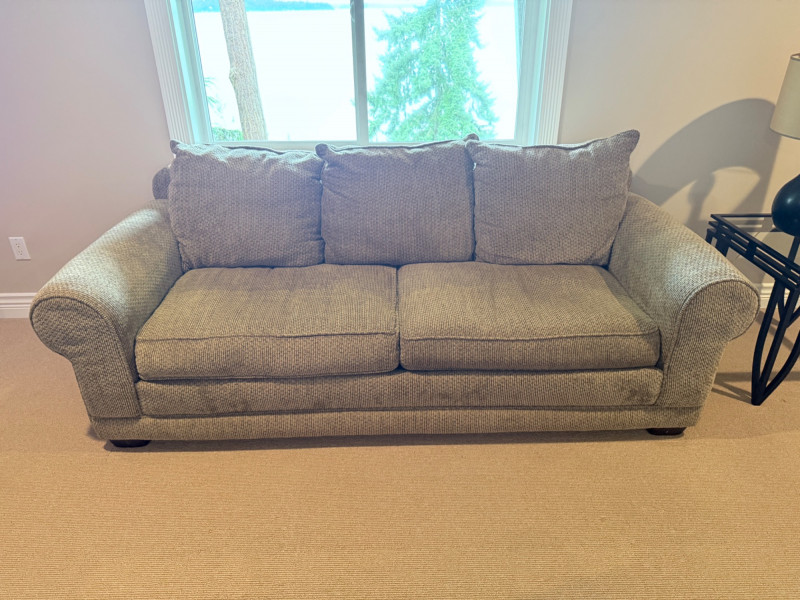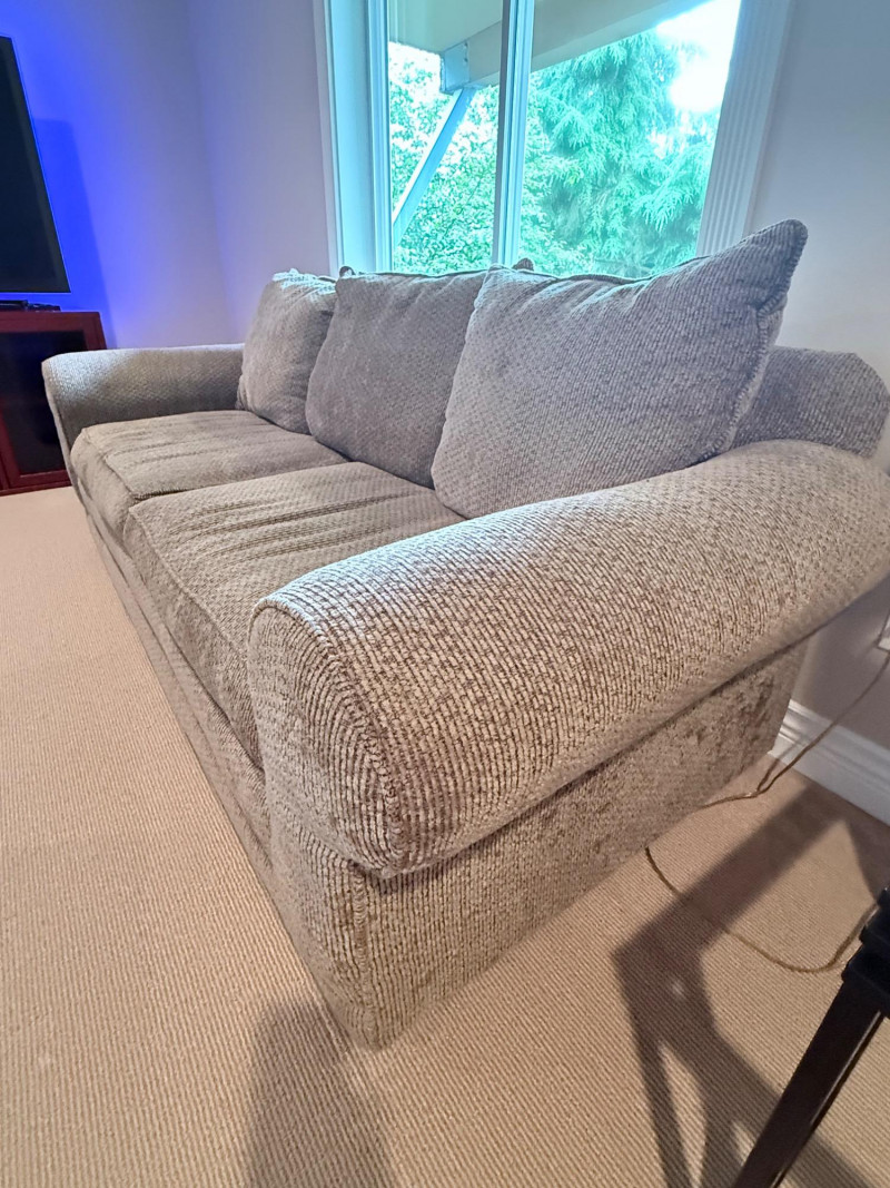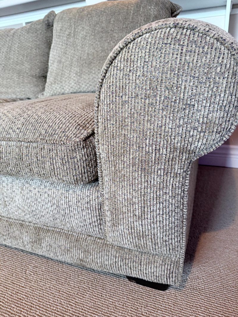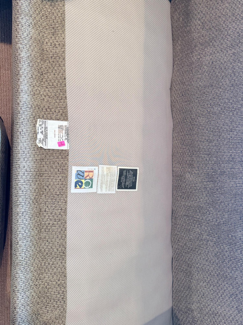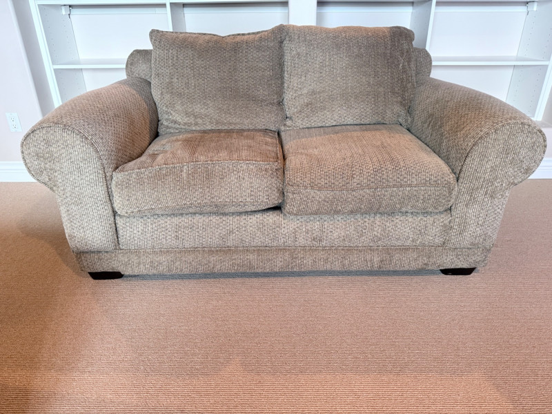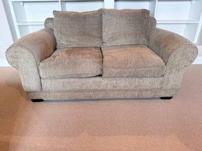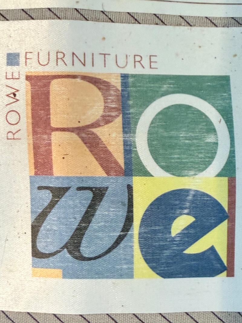 Rowe Furniture Couch and Loveseat Set Seating set by Rowe Furniture, including a three-seat couch and a two-seat loveseat. Both pieces feature rounded armrests, loose back cushions, and block feet. Upholstered in a textured polyester-blend fabric with urethane foam padding. Manufacturer’s tag and original logo label are present. Measurements: Couch: 8 ft W x 3 ft D x 2.6 ft H Loveseat: 5.6 ft W x 3 ft D x 2.6 ft H Brand: Rowe Furniture