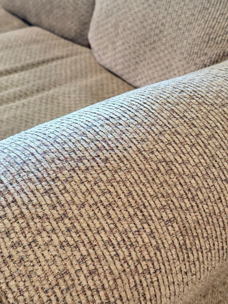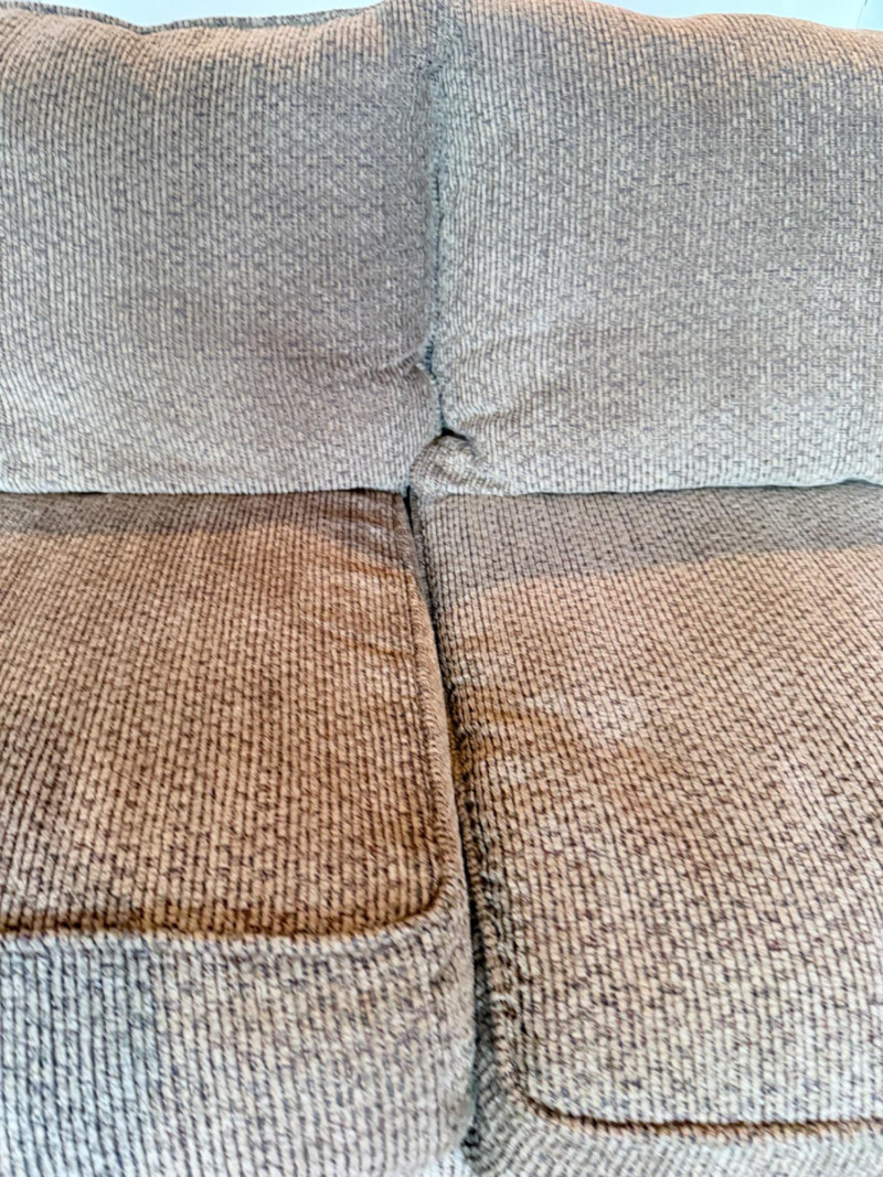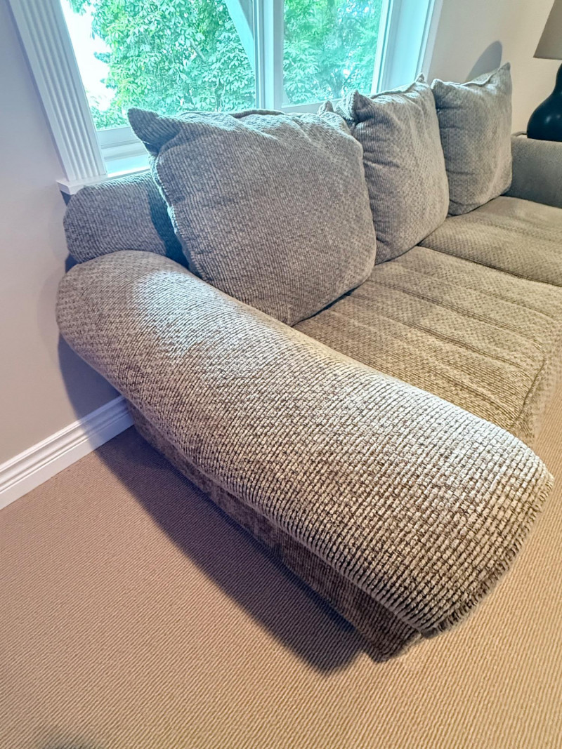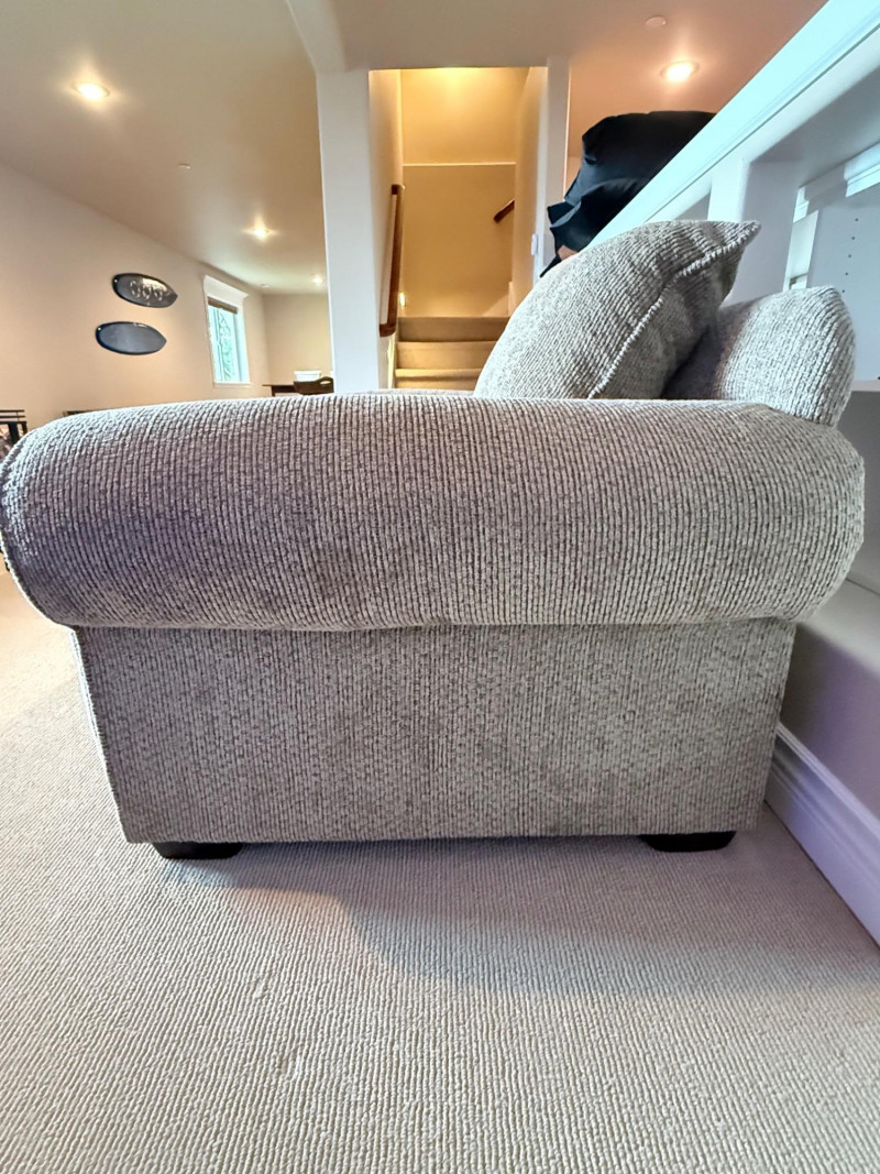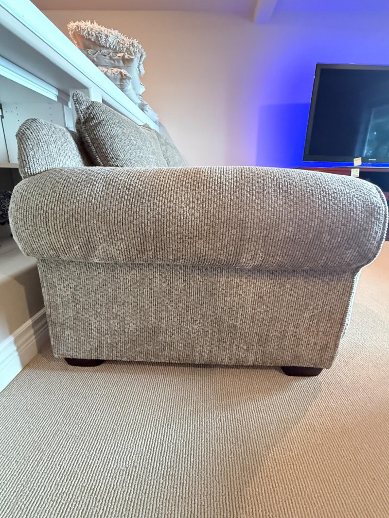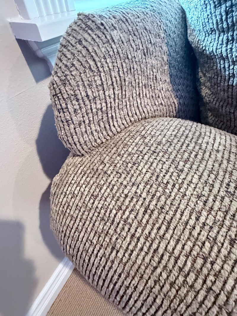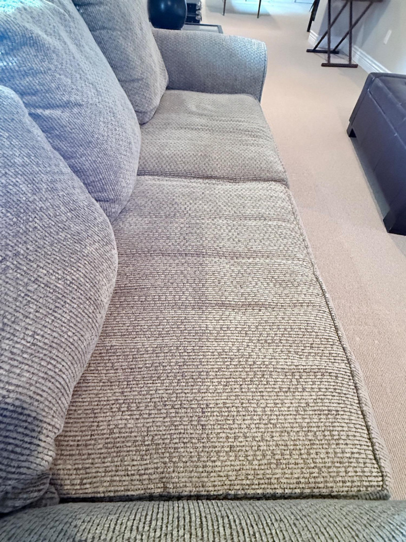 Rowe Furniture Couch and Loveseat Set Seating set by Rowe Furniture, including a three-seat couch and a two-seat loveseat. Both pieces feature rounded armrests, loose back cushions, and block feet. Upholstered in a textured polyester-blend fabric with urethane foam padding. Manufacturer’s tag and original logo label are present. Measurements: Couch: 8 ft W x 3 ft D x 2.6 ft H Loveseat: 5.6 ft W x 3 ft D x 2.6 ft H Brand: Rowe Furniture