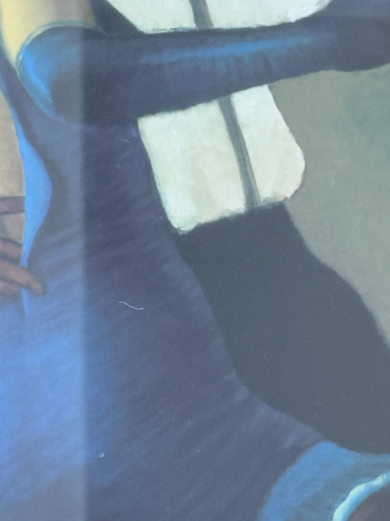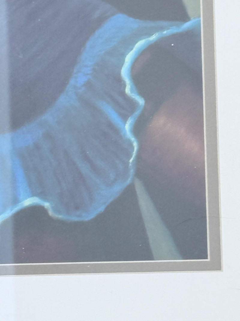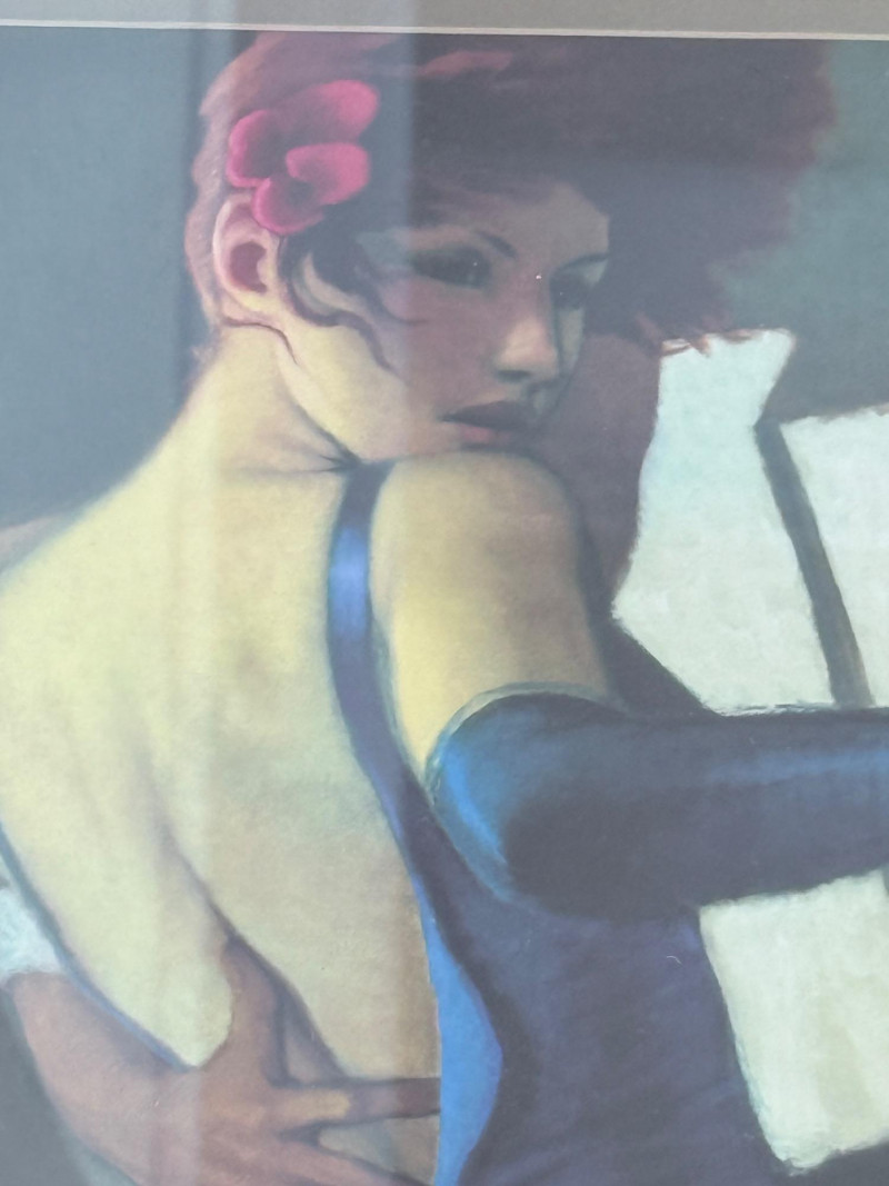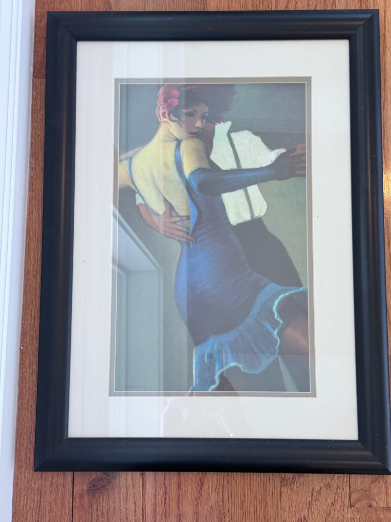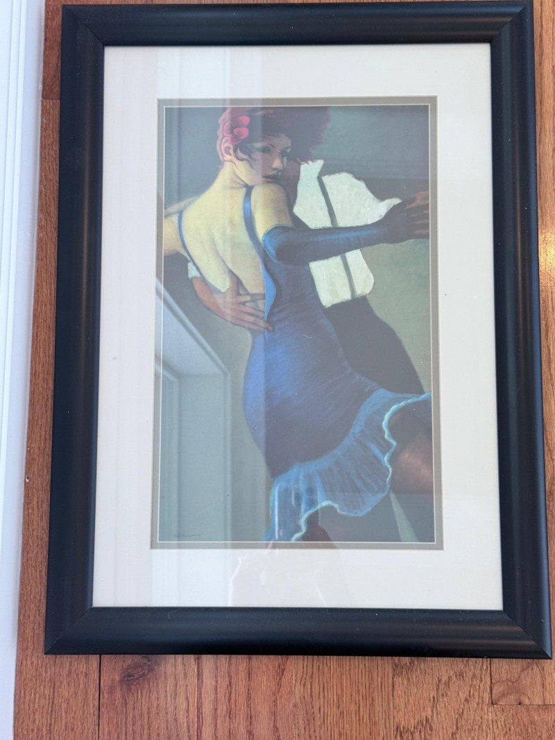 Bill Brauer “Harvest Moon” Framed Print – 16.5" x 23" Print of Bill Brauer’s “Harvest Moon” depicting a dance scene with two figures, one shown in profile with a fitted dress and flower in the hair. The artwork is double matted and set in a black wood frame with backing paper and sawtooth hanger. Dimensions: 16.5" W x 23" H
