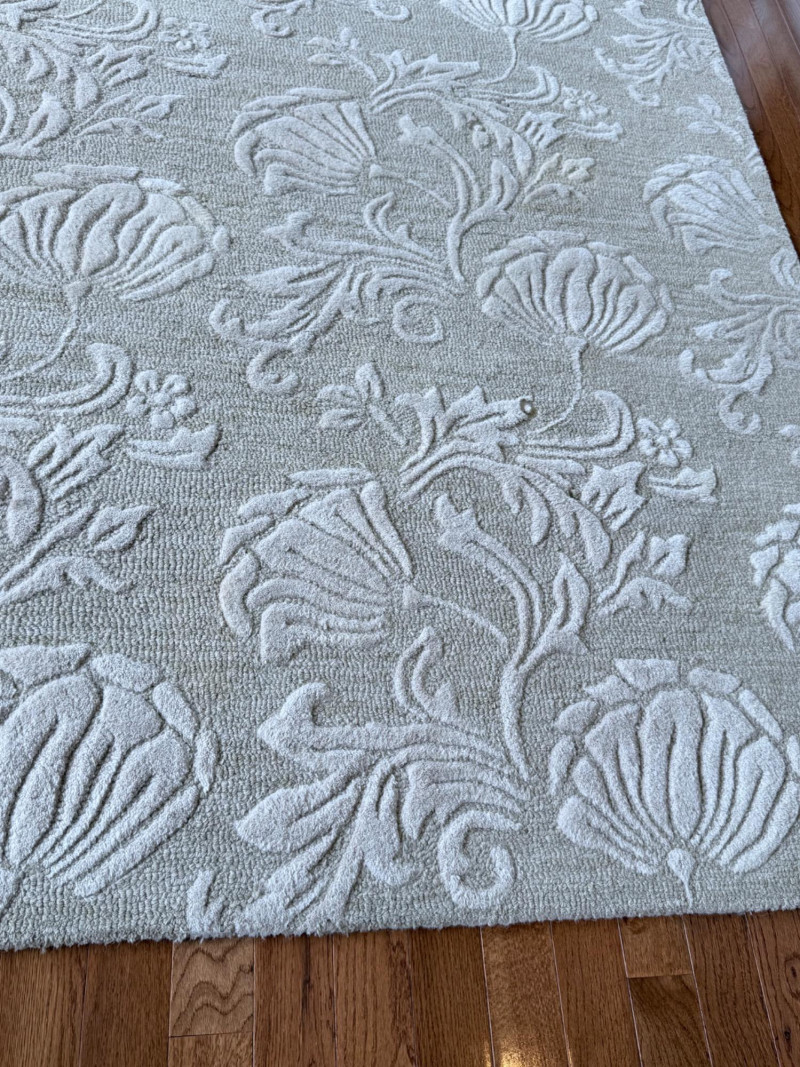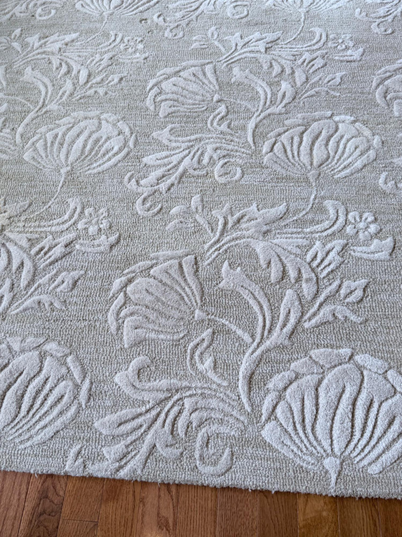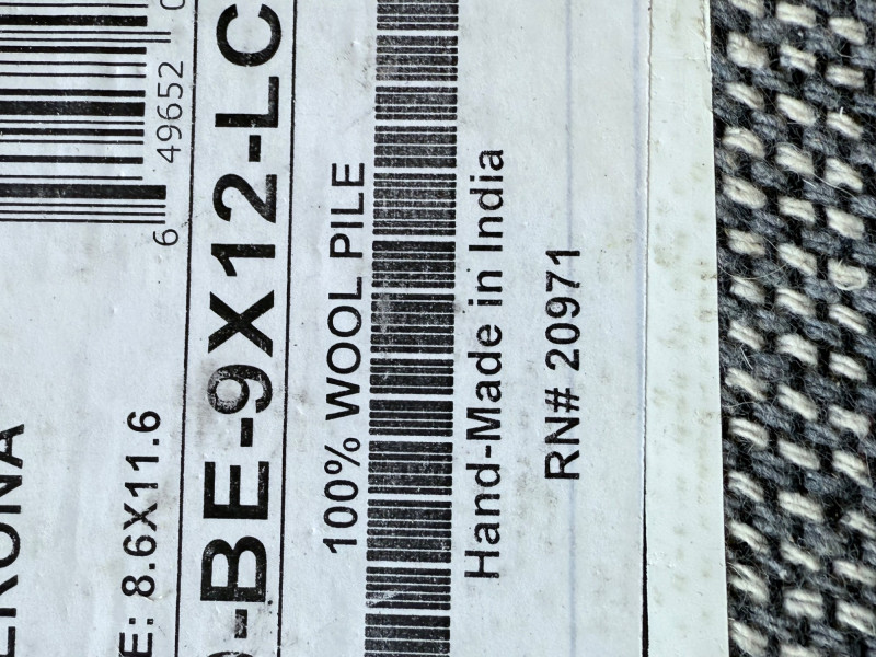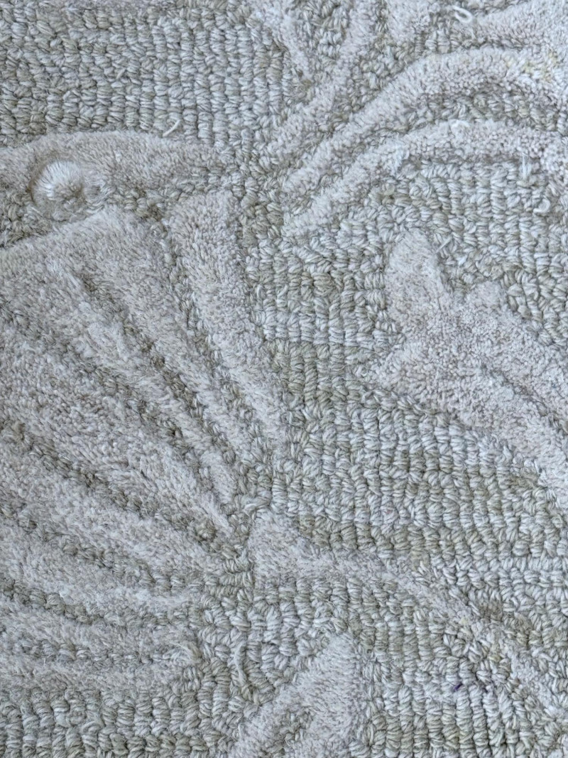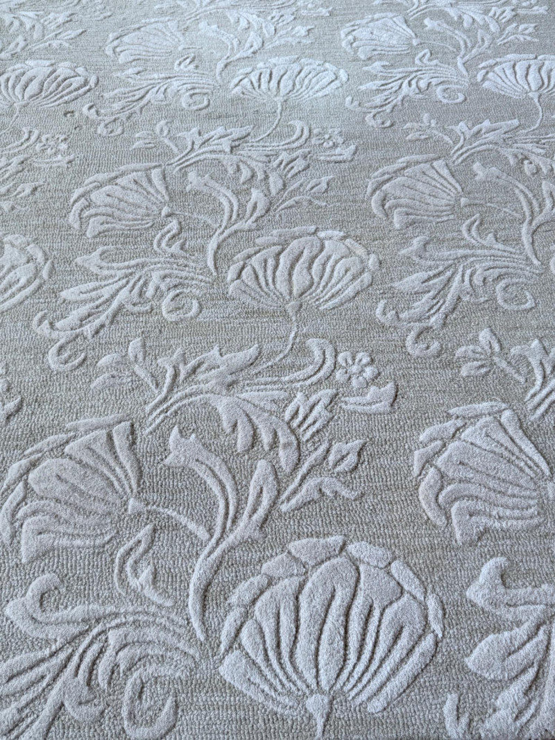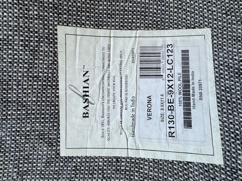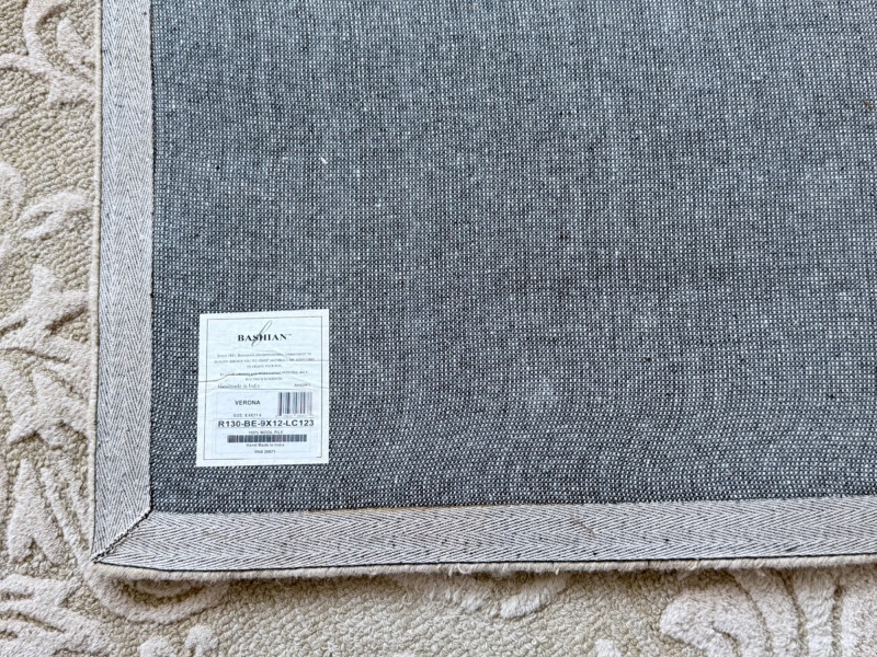 Bashian Verona Wool Rug – 8.6' x 11.6' Handmade rug woven in India with a 100% wool pile. Features a raised floral pattern over a looped base. The surface shows a mix of cut and loop textures. Reverse side is finished with a stitched edge and manufacturer’s label. Dimensions: 8.6' W x 11.6' L