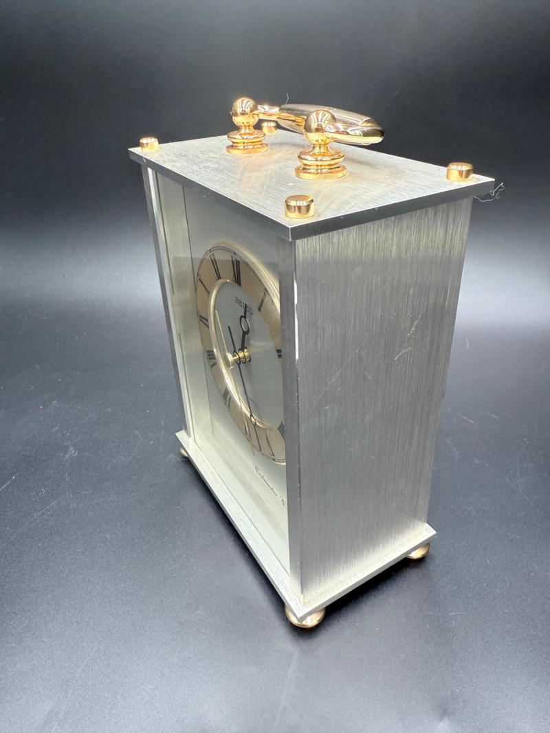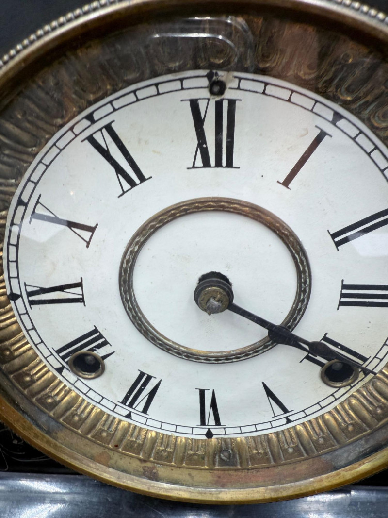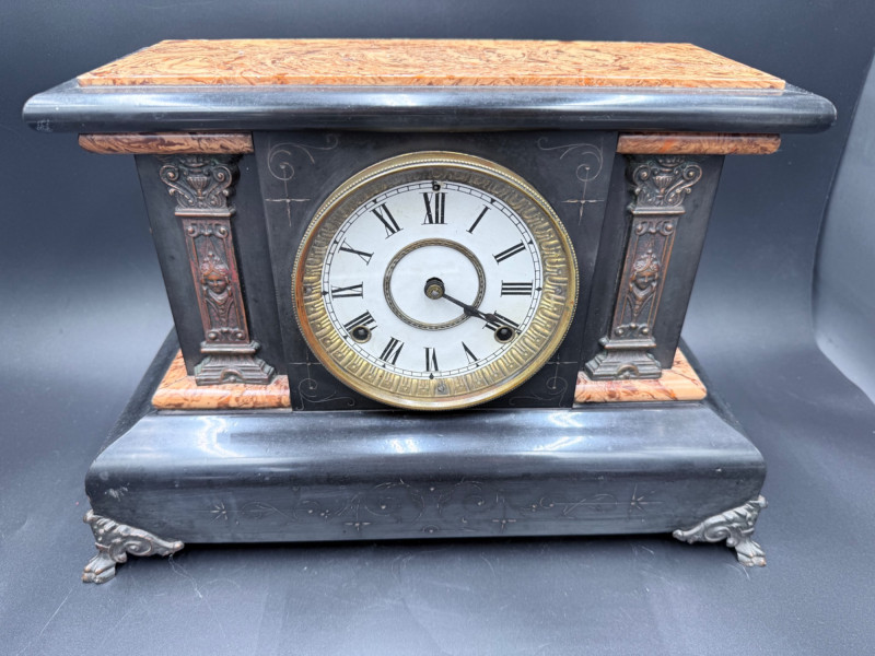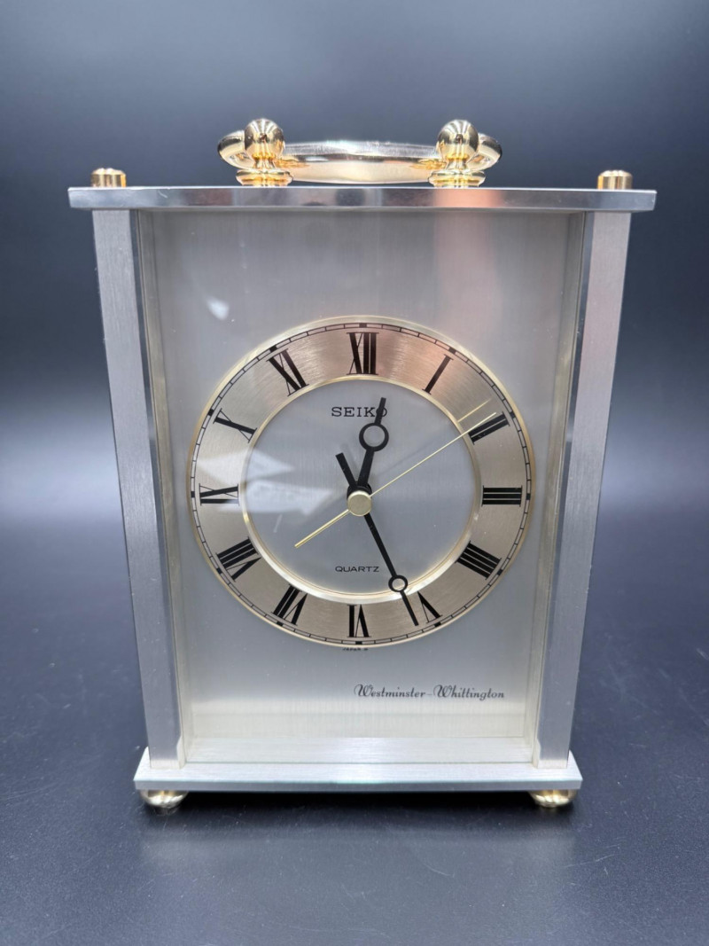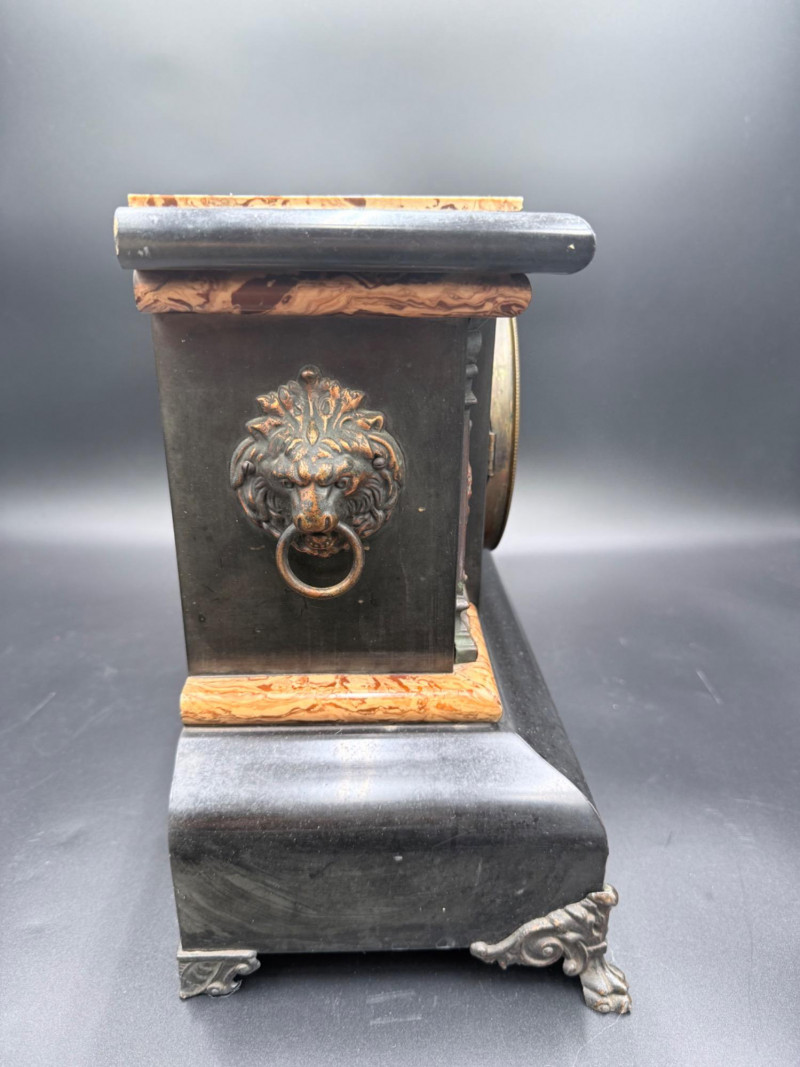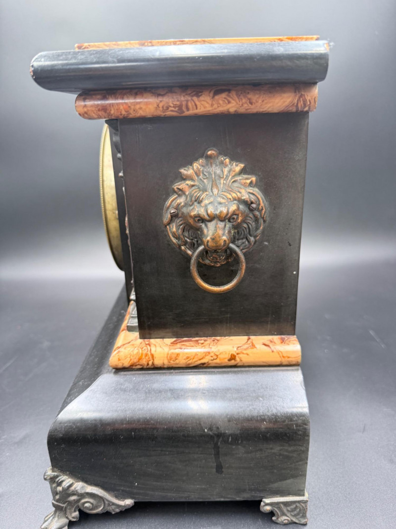 Antique Seth Thomas and SEIKO Westminster Whittington Clock The first is a likely Seth Thomas mantel clock with a black adamantine case, faux marble panels, cast metal feet, lion mask handles, and a Roman numeral dial with brass bezel. Mechanical movement is present; not tested and does not appear to function. The second is a SEIKO Westminster Whittington quartz chime clock with a brushed metal case, gold-tone handle, and Roman numeral dial marked “Japan S.” Battery-operated and marked as working. Dimensions: