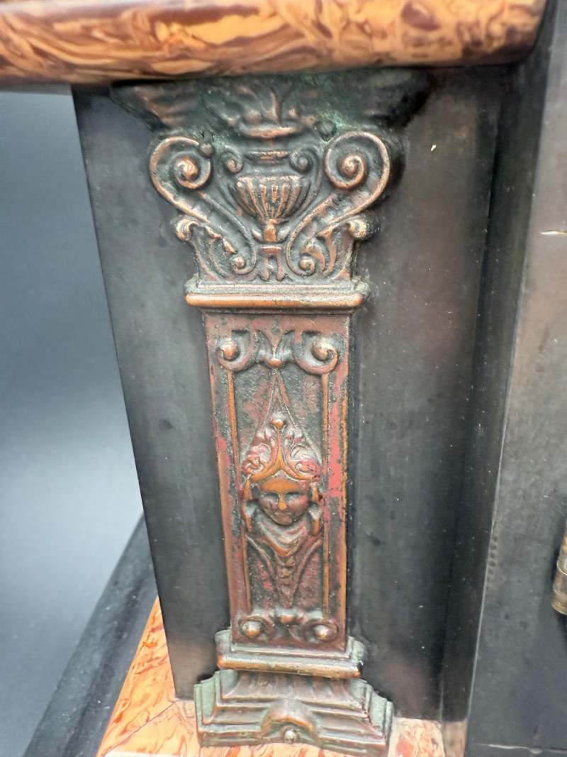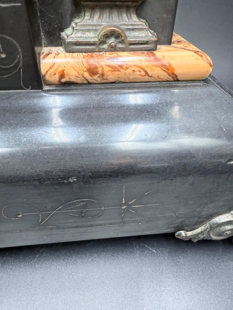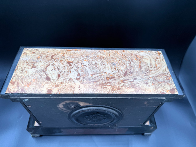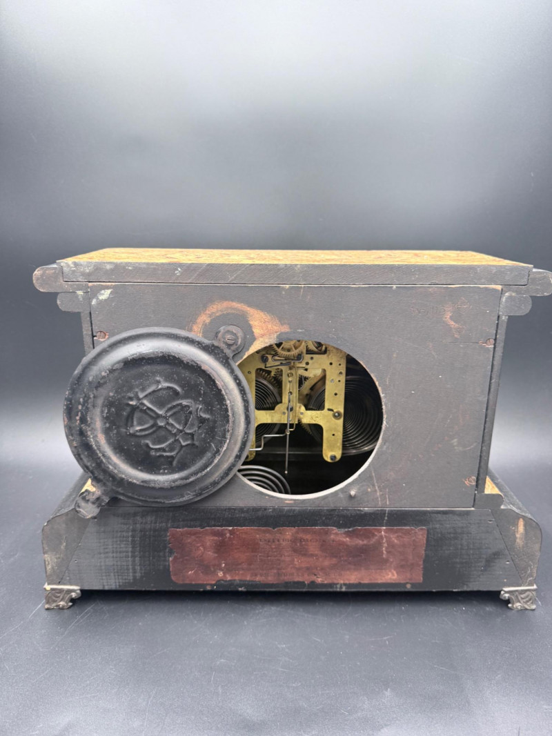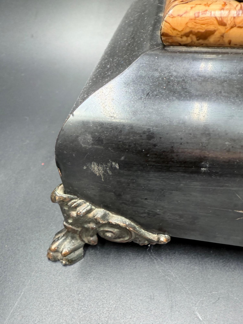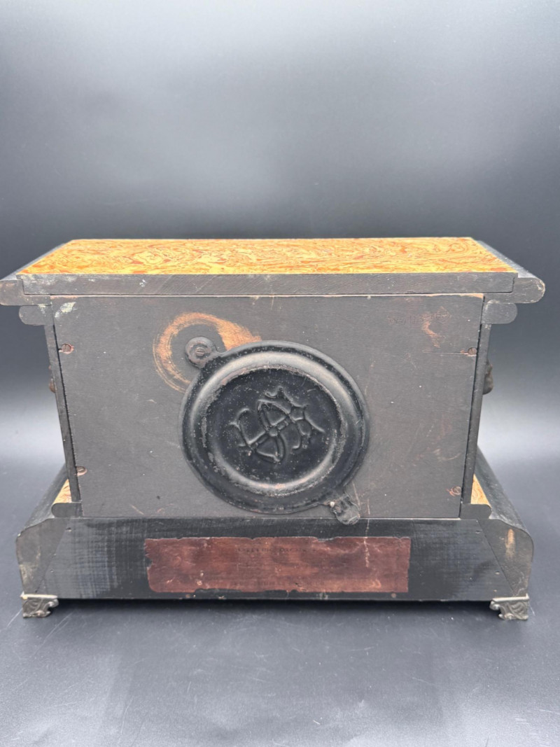 Antique Seth Thomas and SEIKO Westminster Whittington Clock The first is a likely Seth Thomas mantel clock with a black adamantine case, faux marble panels, cast metal feet, lion mask handles, and a Roman numeral dial with brass bezel. Mechanical movement is present; not tested and does not appear to function. The second is a SEIKO Westminster Whittington quartz chime clock with a brushed metal case, gold-tone handle, and Roman numeral dial marked “Japan S.” Battery-operated and marked as working. Dimensions: