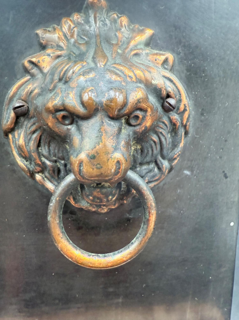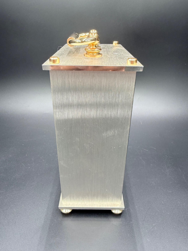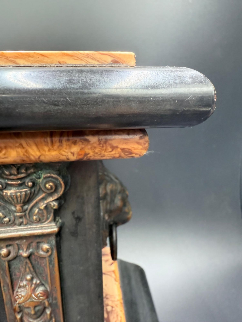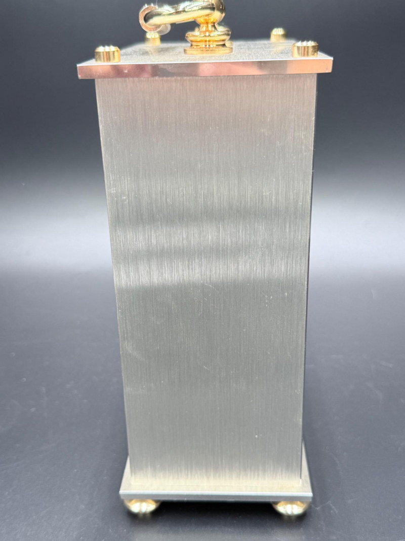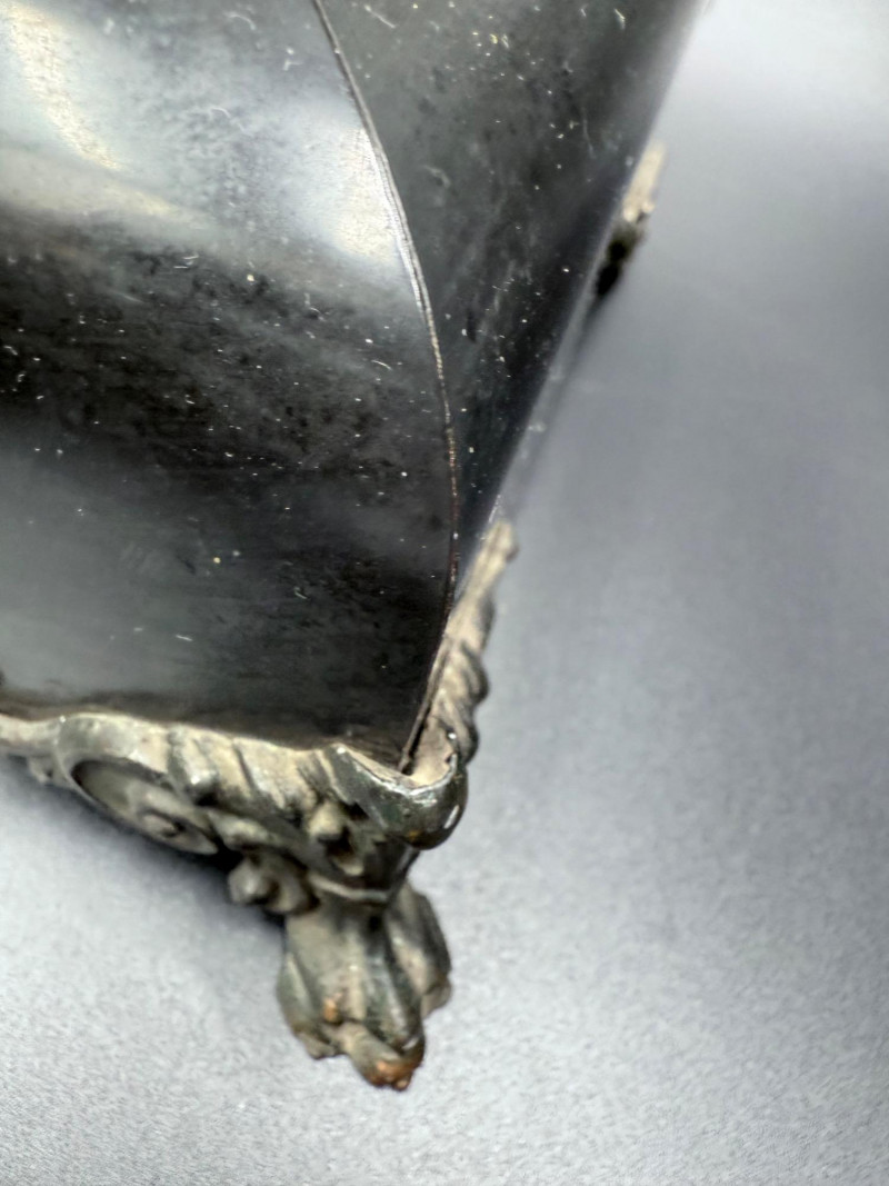 Antique Seth Thomas and SEIKO Westminster Whittington Clock The first is a likely Seth Thomas mantel clock with a black adamantine case, faux marble panels, cast metal feet, lion mask handles, and a Roman numeral dial with brass bezel. Mechanical movement is present; not tested and does not appear to function. The second is a SEIKO Westminster Whittington quartz chime clock with a brushed metal case, gold-tone handle, and Roman numeral dial marked “Japan S.” Battery-operated and marked as working. Dimensions: