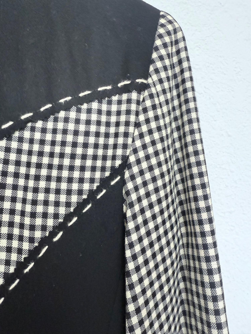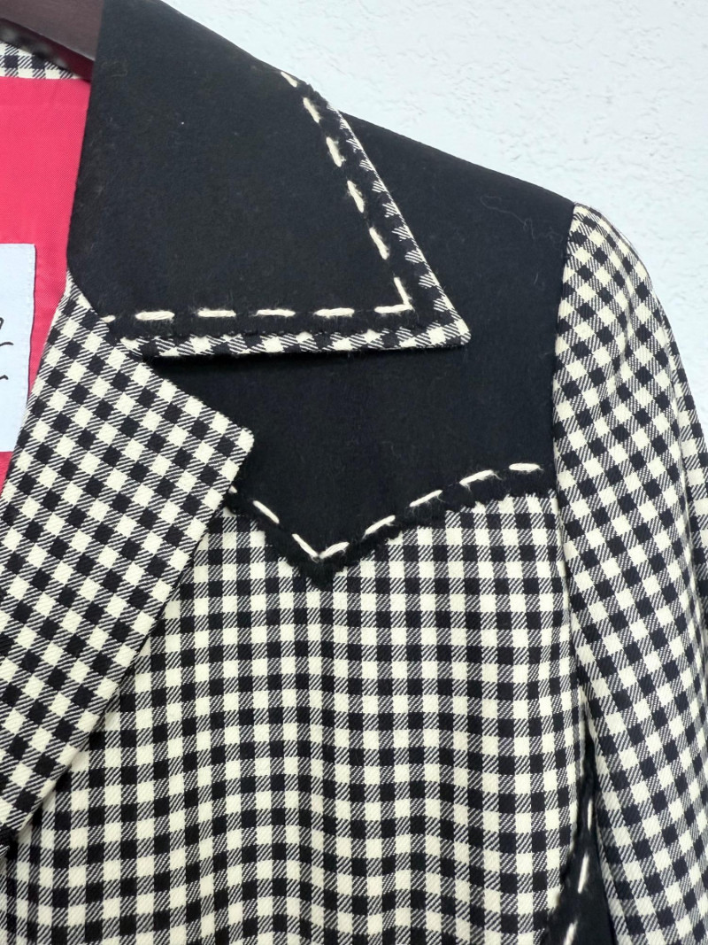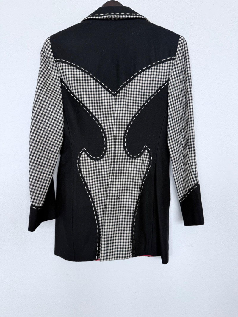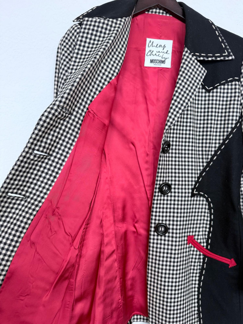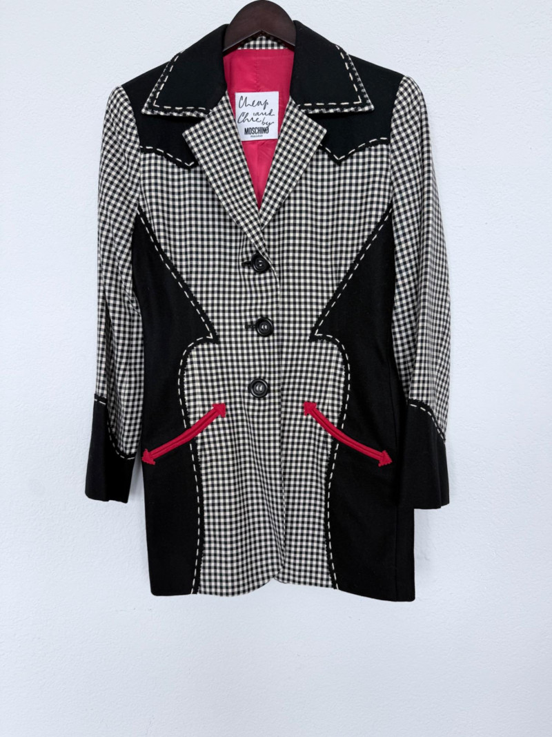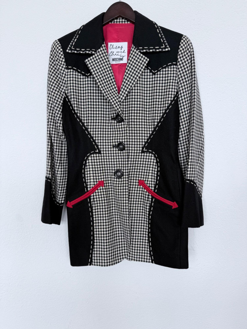 Cheap and Chic by Moschino Blazer – Size US 12 Blazer by Cheap and Chic by Moschino with black and white gingham panels and solid black sections. Designed with contrast white stitching, red arrow-shaped welt pockets, a notched lapel collar, and a three-button front closure. Fully lined in pink satin. Made in Italy. Size: