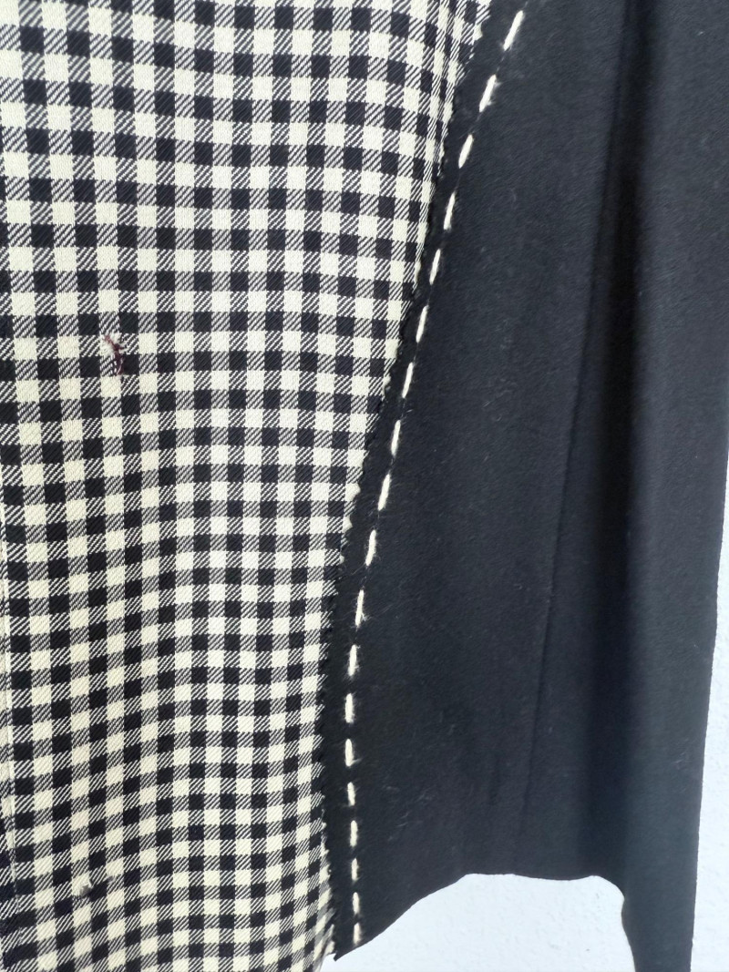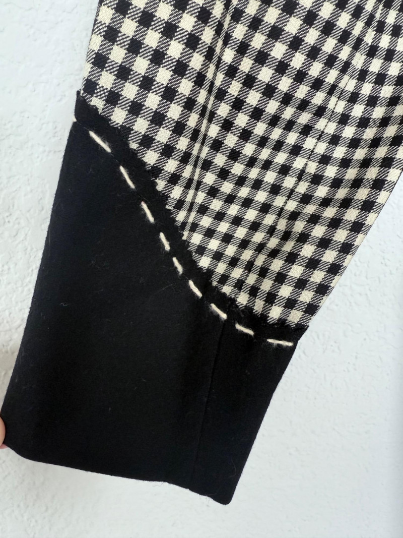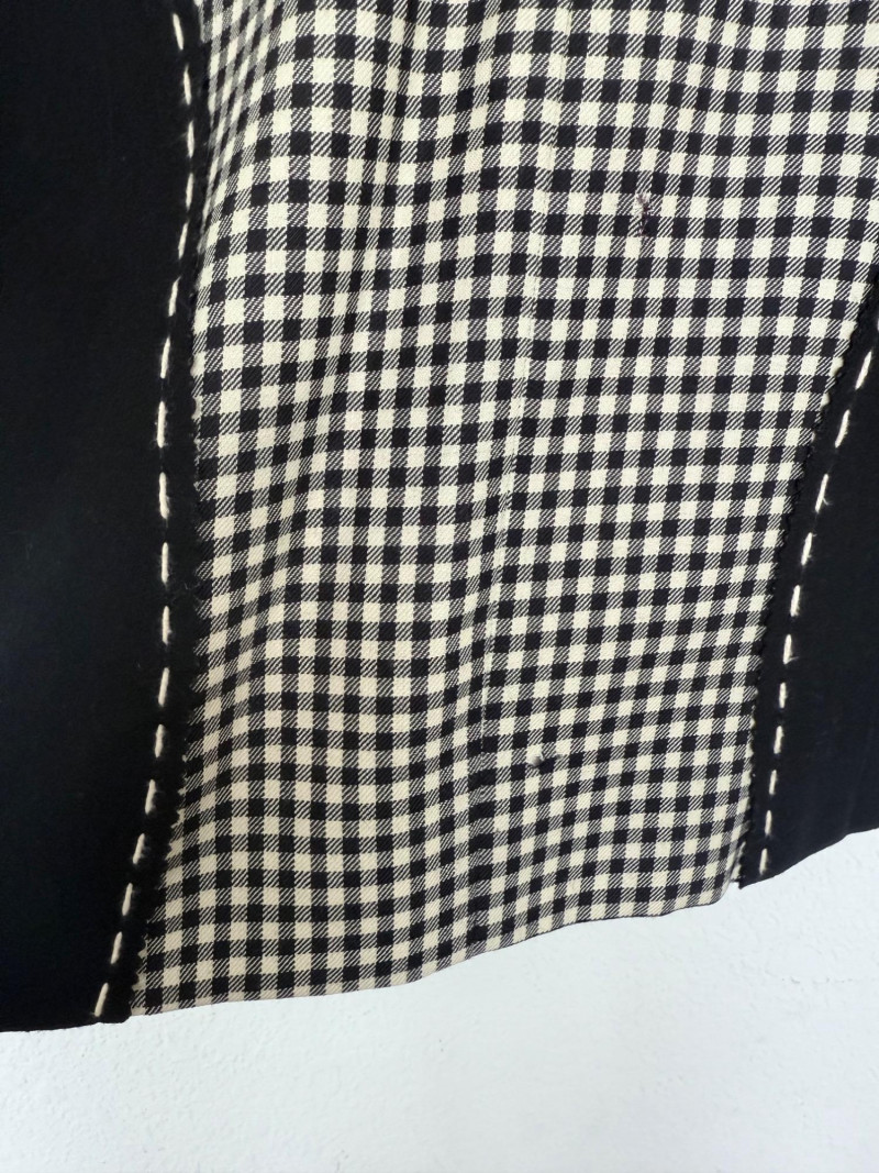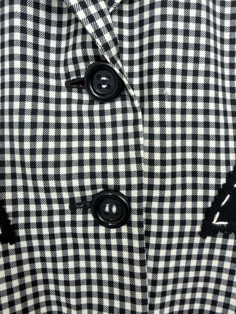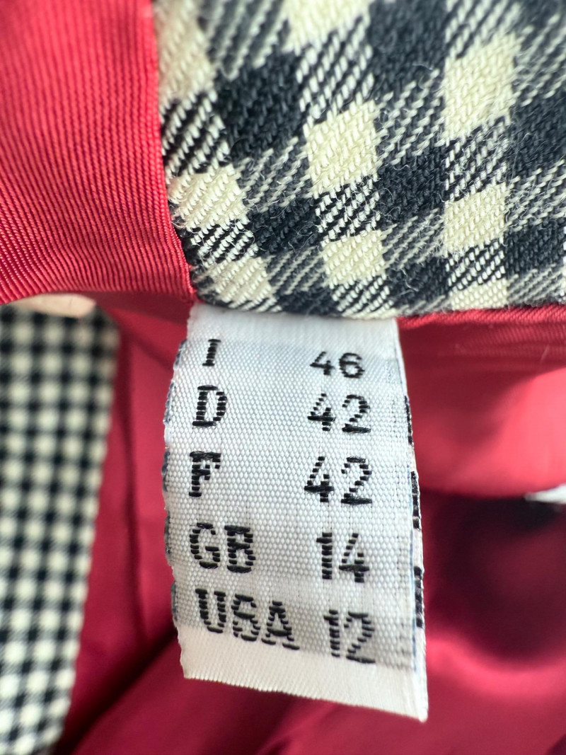 Cheap and Chic by Moschino Blazer – Size US 12 Blazer by Cheap and Chic by Moschino with black and white gingham panels and solid black sections. Designed with contrast white stitching, red arrow-shaped welt pockets, a notched lapel collar, and a three-button front closure. Fully lined in pink satin. Made in Italy. Size: