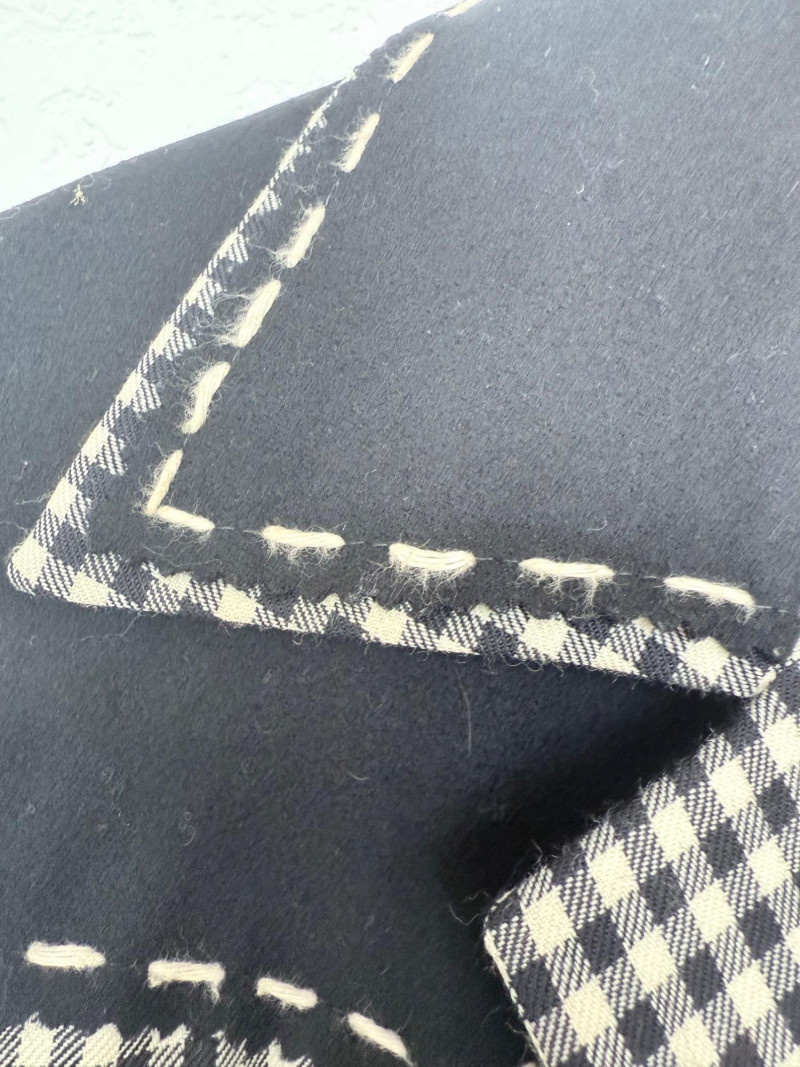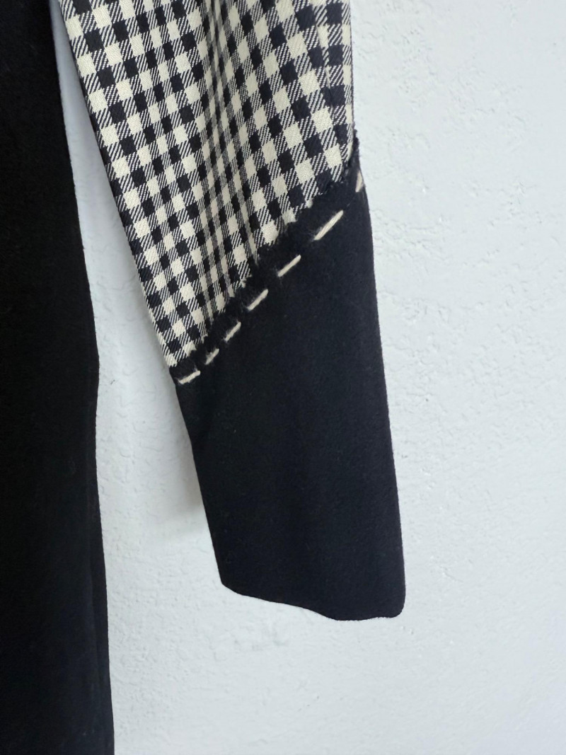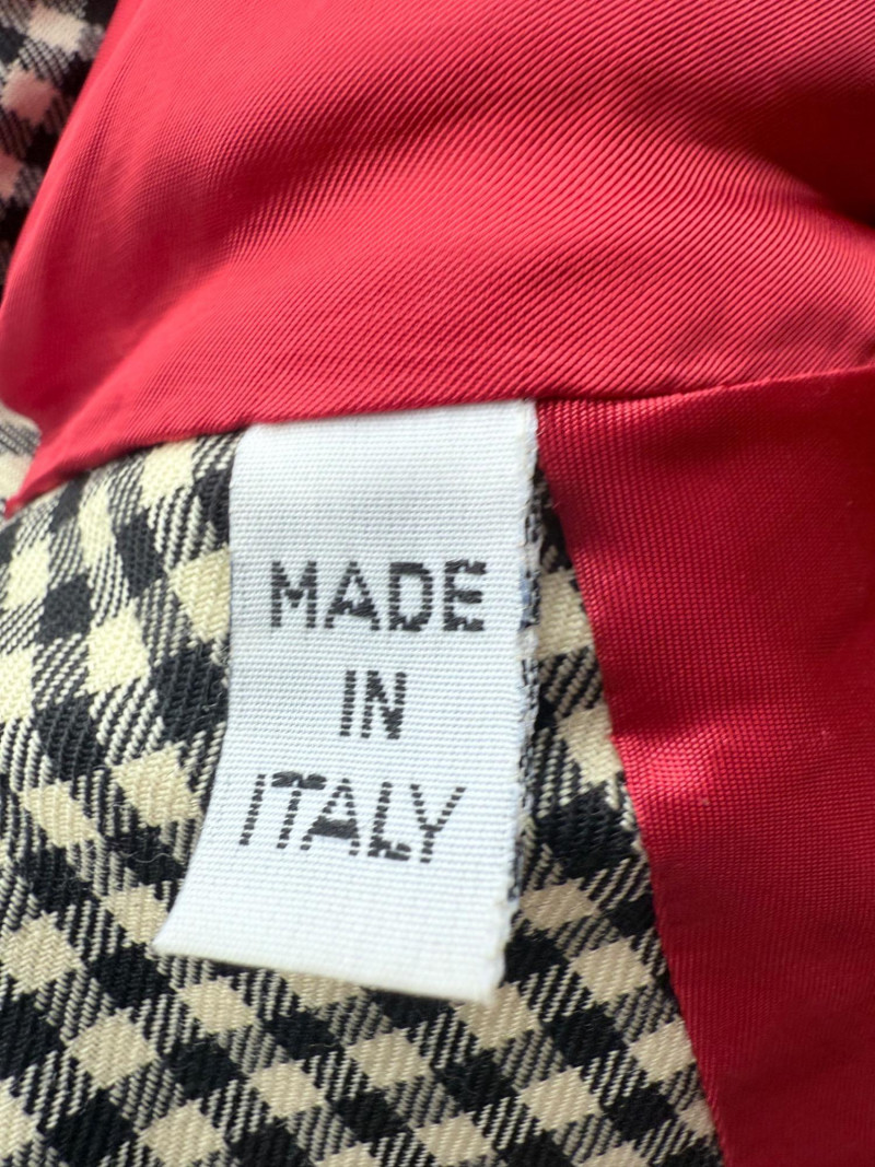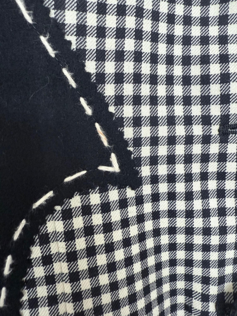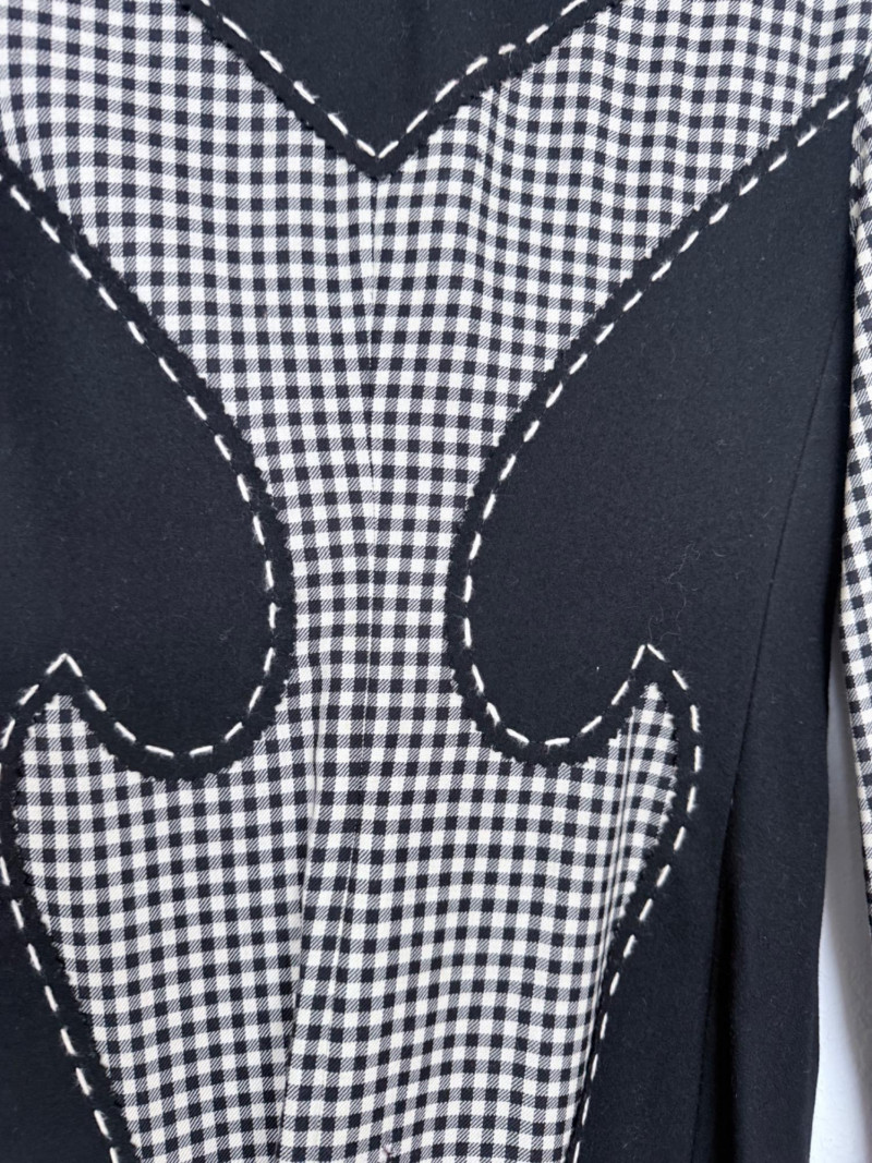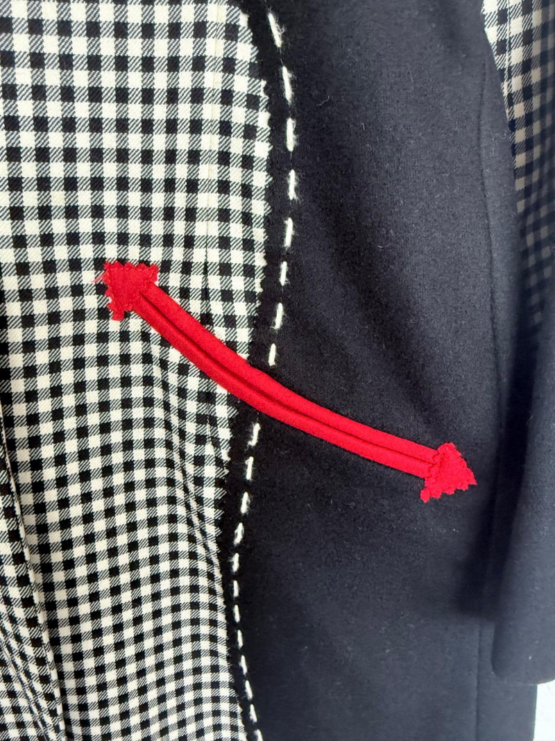 Cheap and Chic by Moschino Blazer – Size US 12 Blazer by Cheap and Chic by Moschino with black and white gingham panels and solid black sections. Designed with contrast white stitching, red arrow-shaped welt pockets, a notched lapel collar, and a three-button front closure. Fully lined in pink satin. Made in Italy. Size: