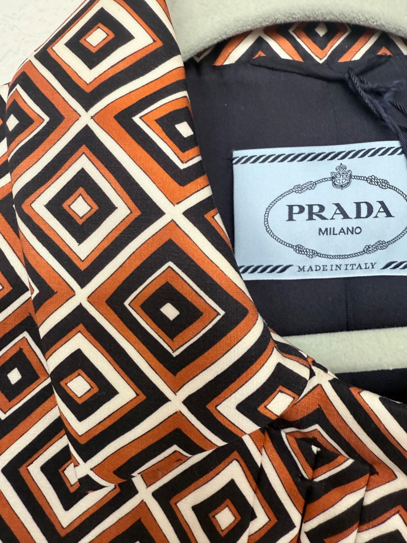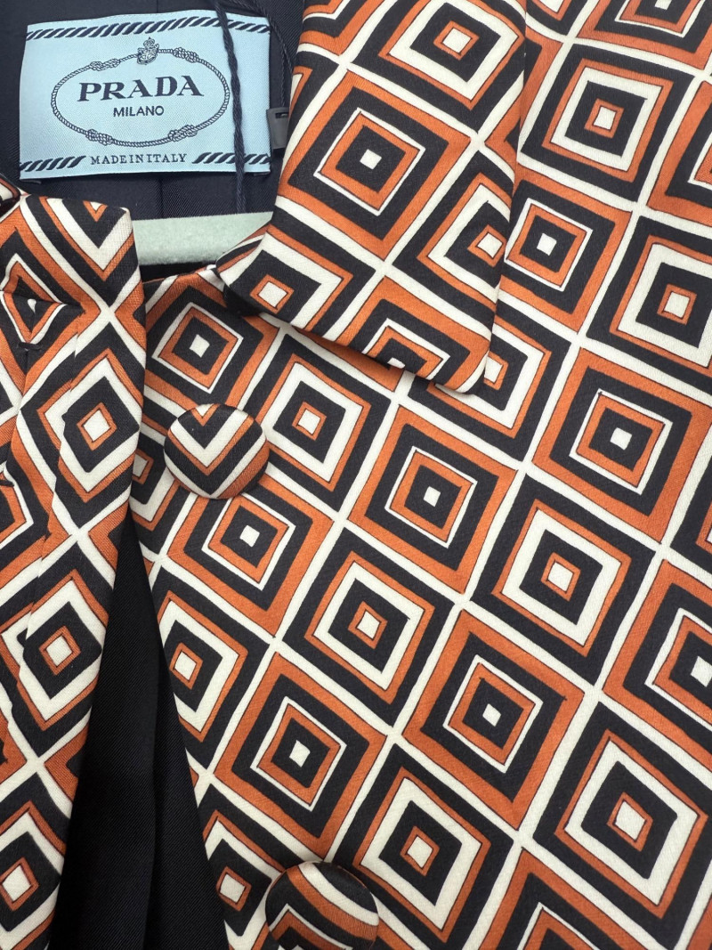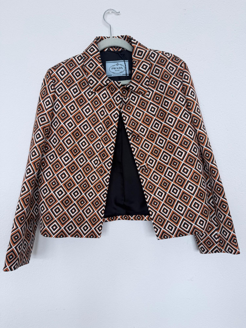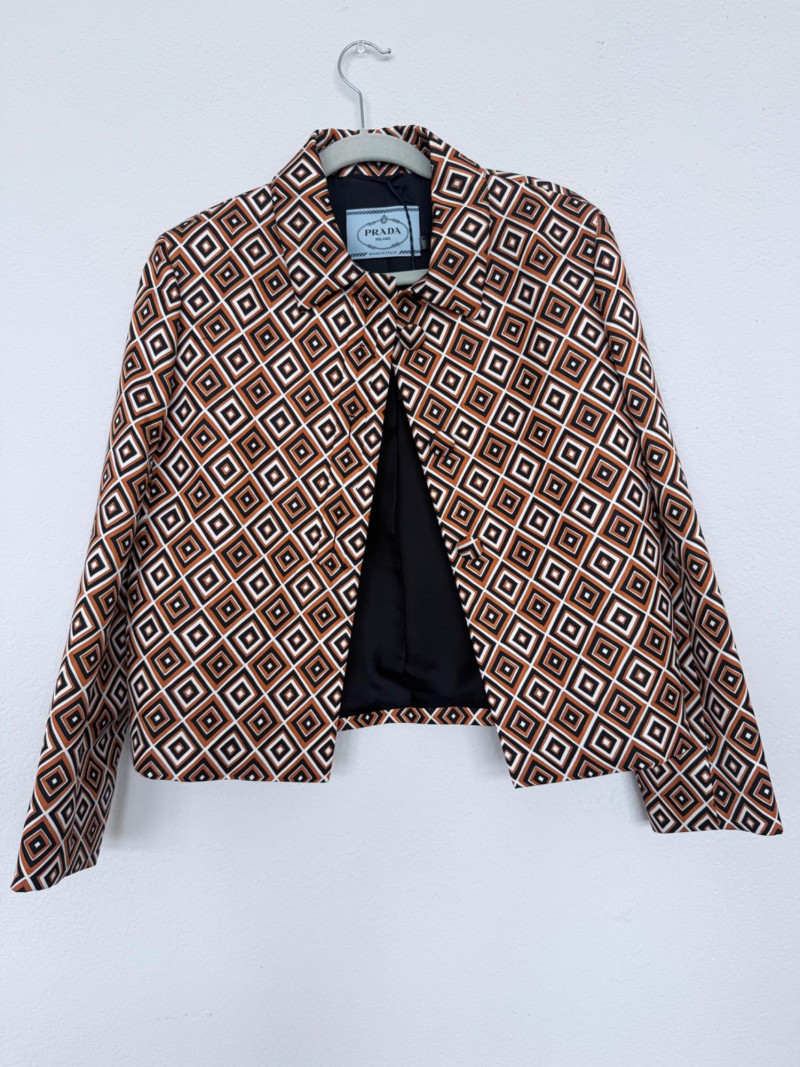 Prada Milano Geometric Pattern Jacket – Size 44 Jacket with allover geometric square motif in black, orange, and cream. Features a cropped silhouette with long sleeves and fabric-covered buttons. Made from a wool and silk blend with a full silk lining. Interior labels indicate Italian origin. Materials: Shell: 57% Wool, 43% Silk Lining: 100% Silk Size: Origin: