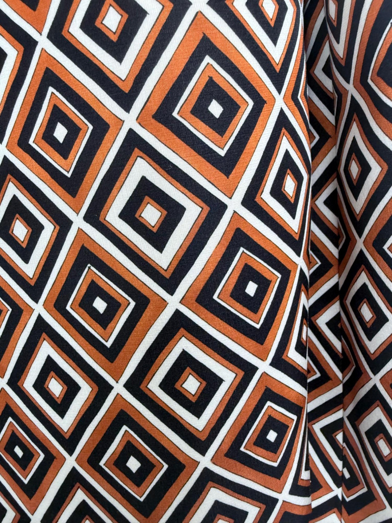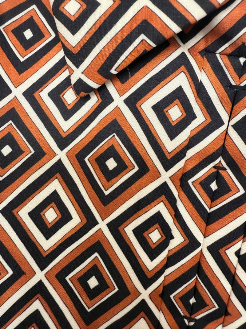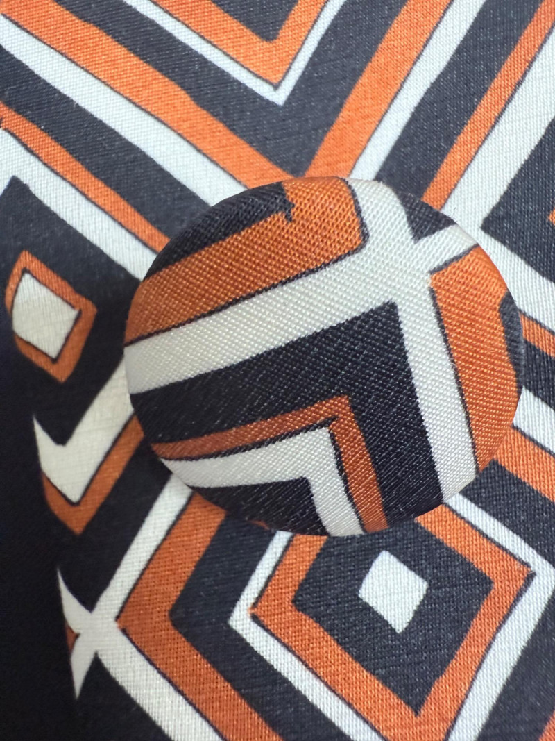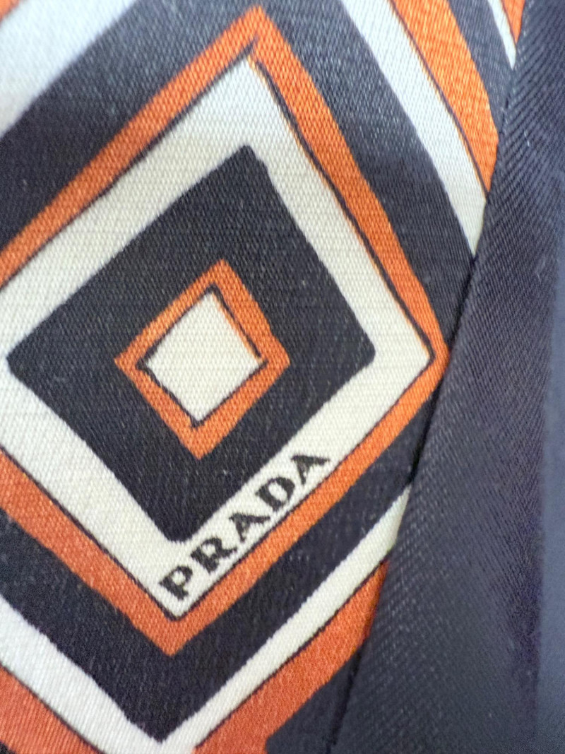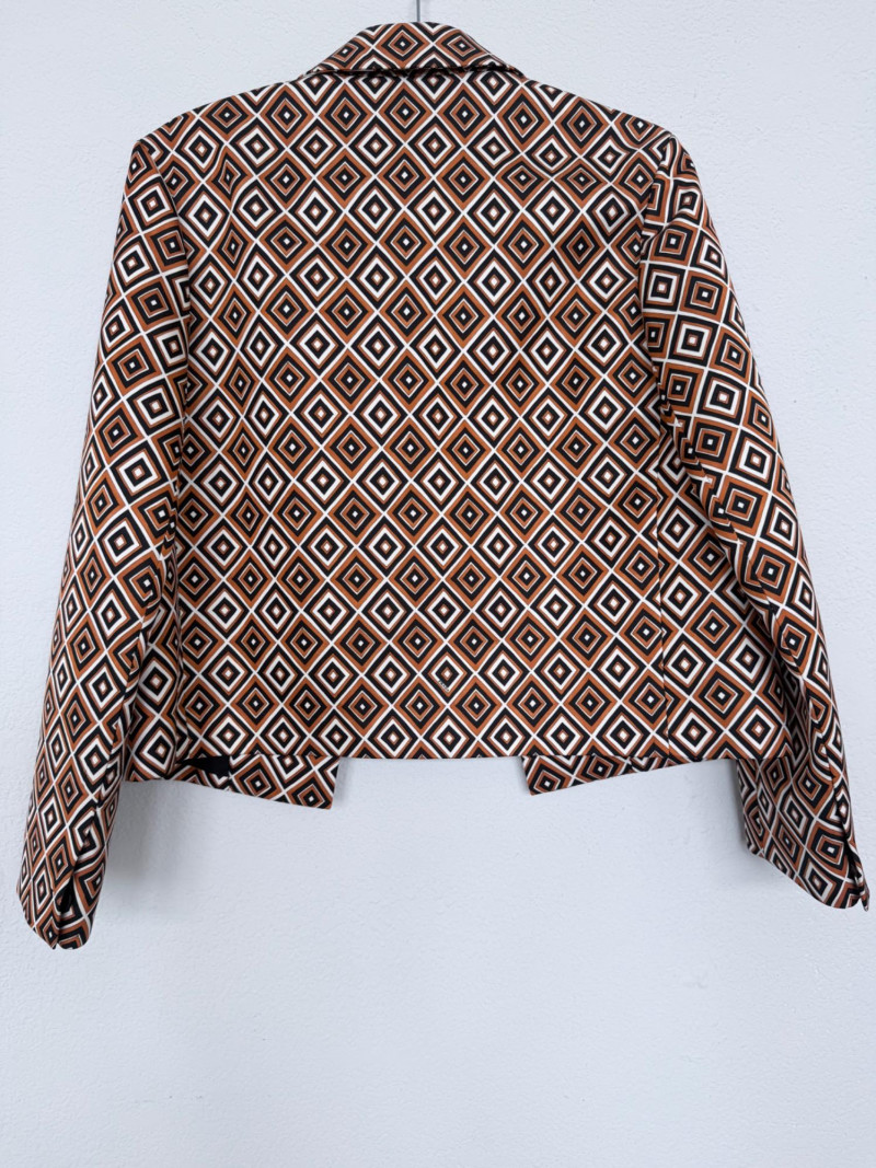 Prada Milano Geometric Pattern Jacket – Size 44 Jacket with allover geometric square motif in black, orange, and cream. Features a cropped silhouette with long sleeves and fabric-covered buttons. Made from a wool and silk blend with a full silk lining. Interior labels indicate Italian origin. Materials: Shell: 57% Wool, 43% Silk Lining: 100% Silk Size: Origin: