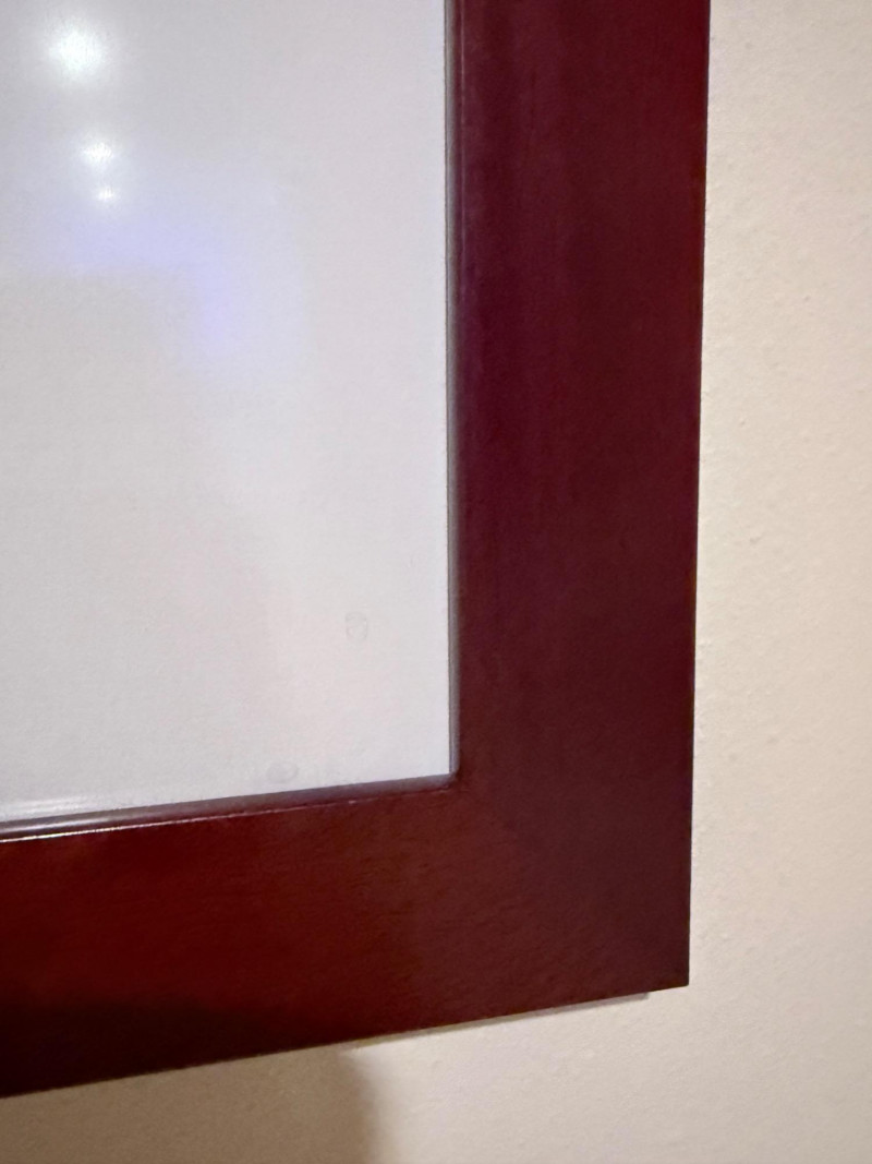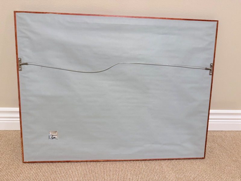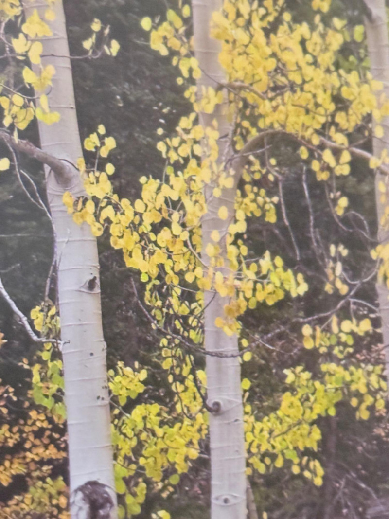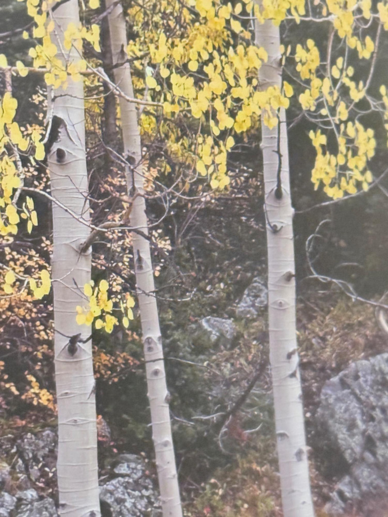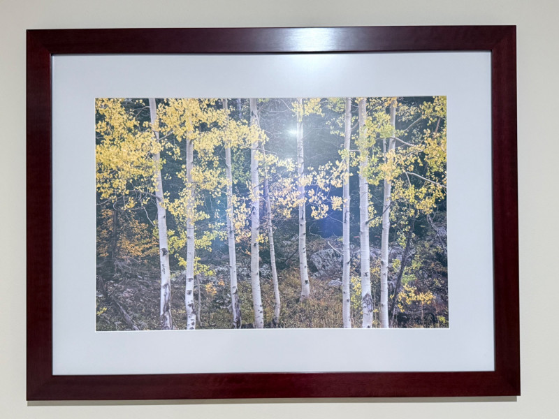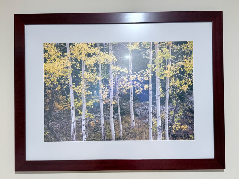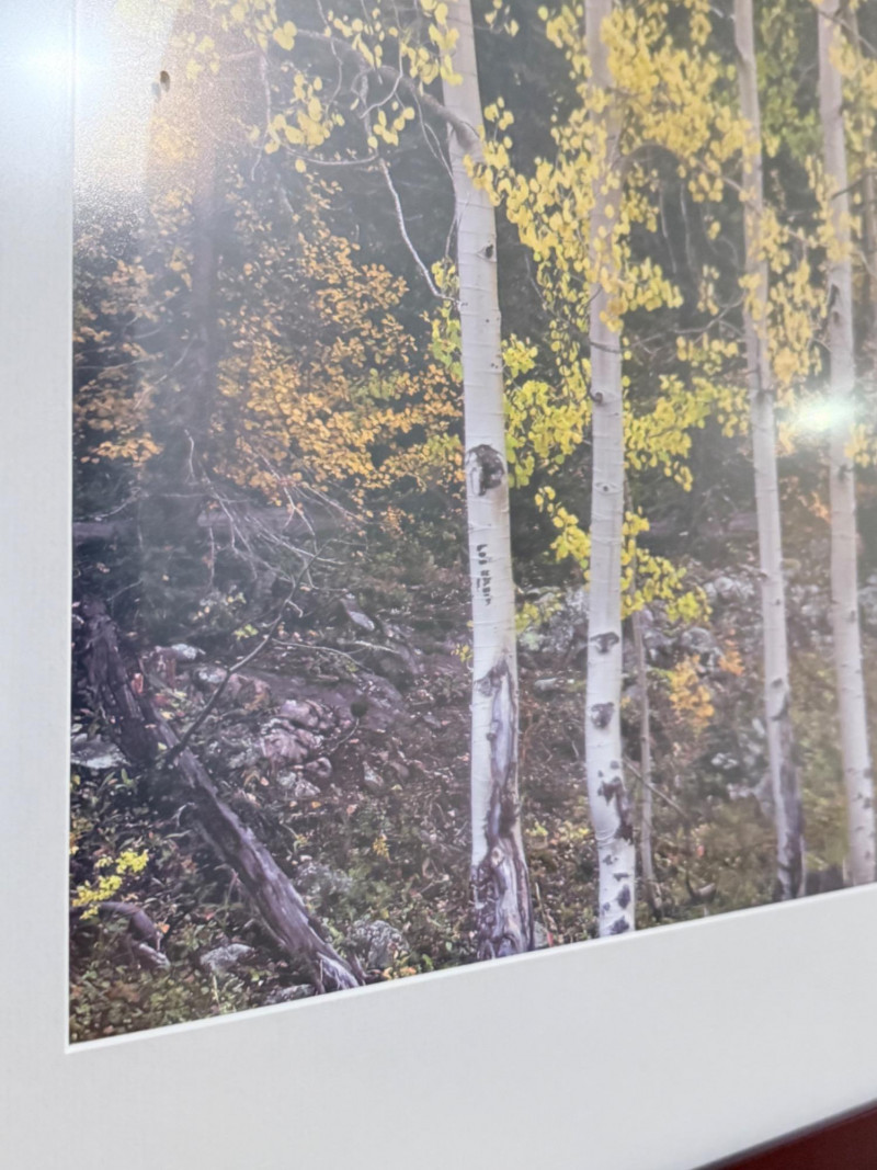 Print depicting a grove of aspen trees with pale trunks and clustered foliage, set against a forested, rocky slope. Mounted in a wood frame with matting and wire backing. Professionally finished by Michaels.