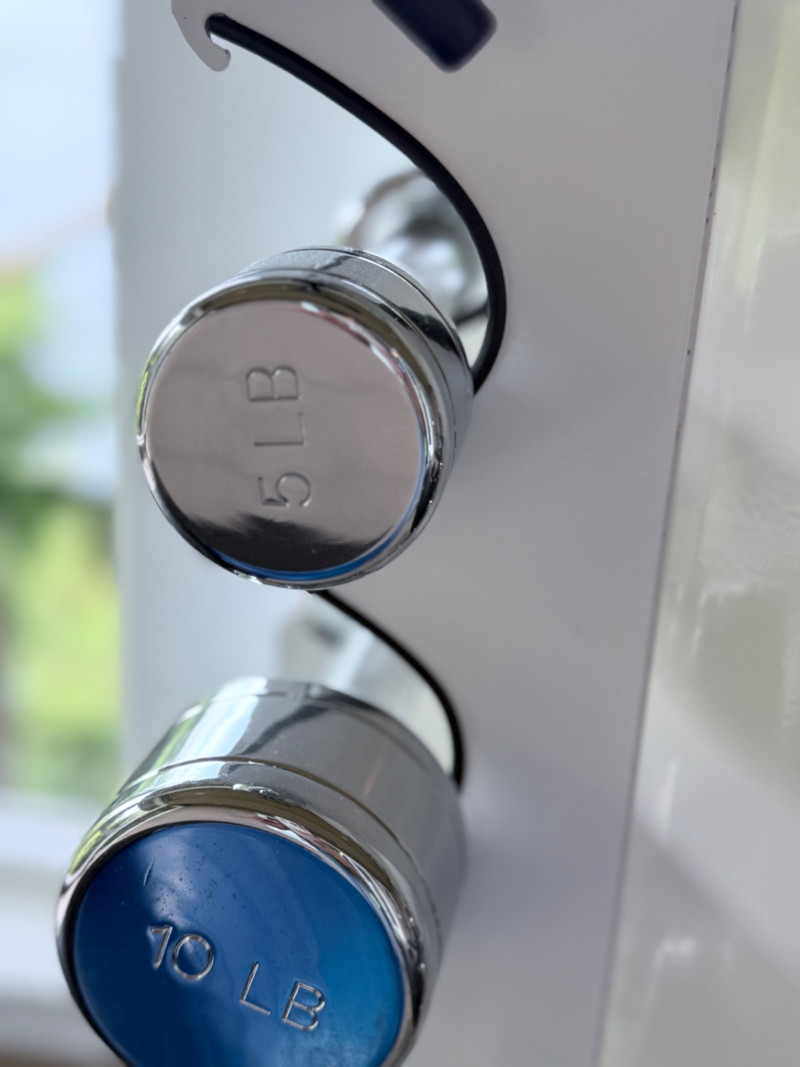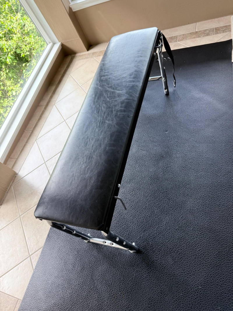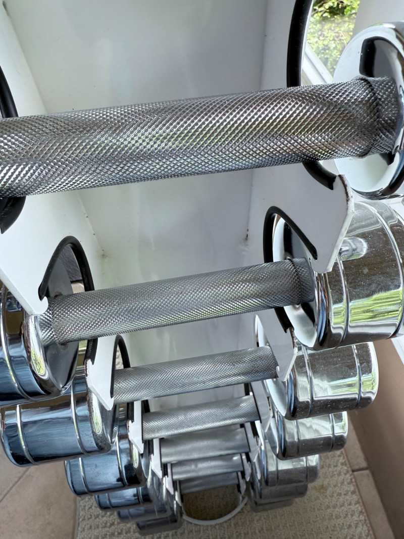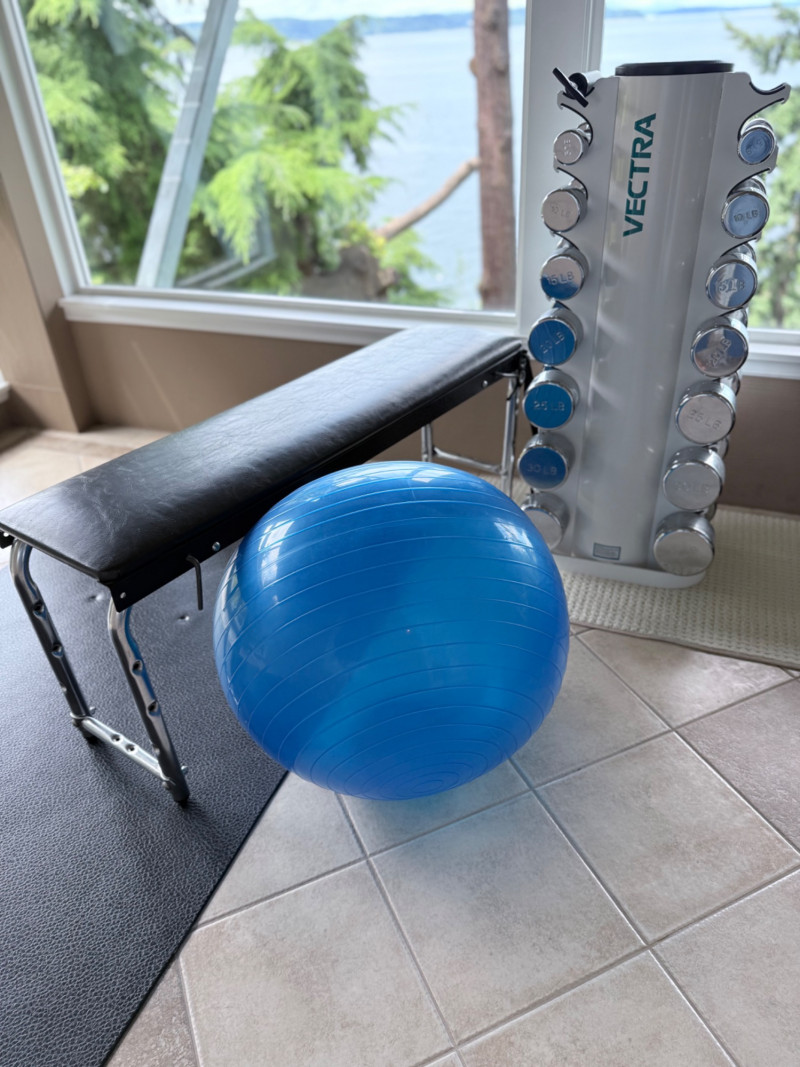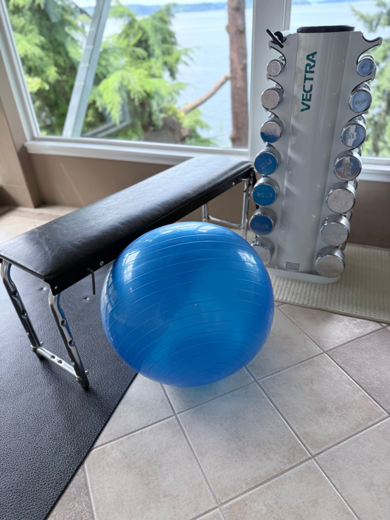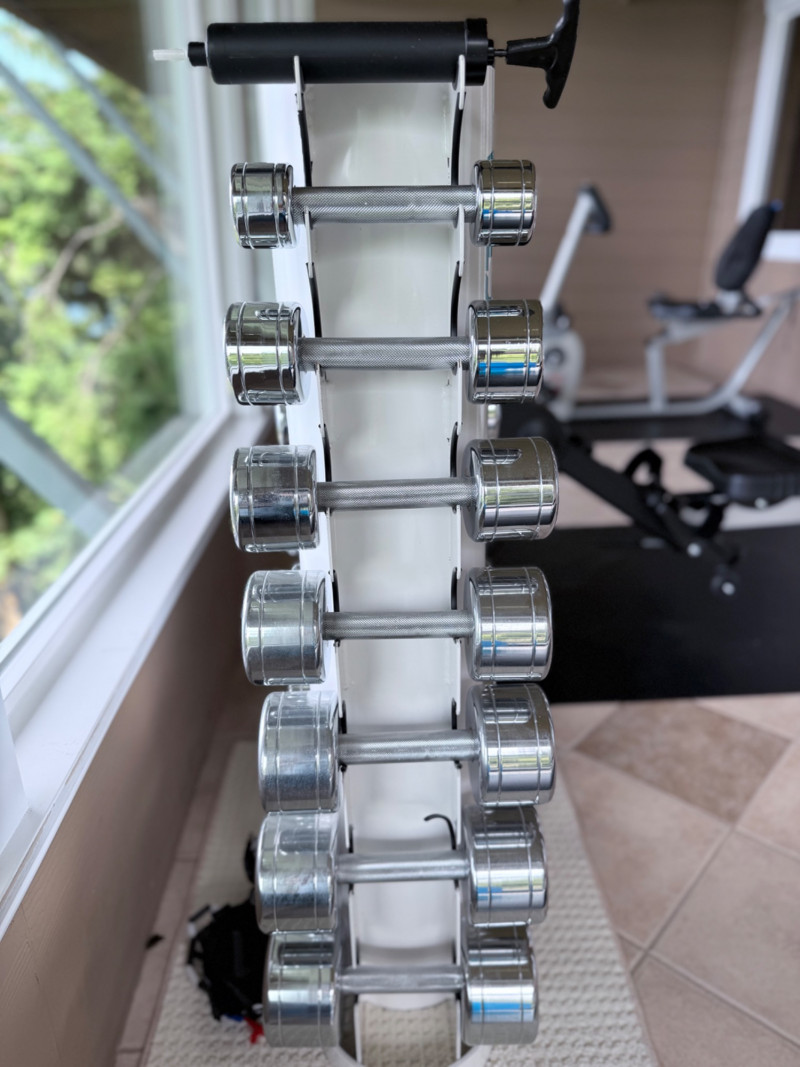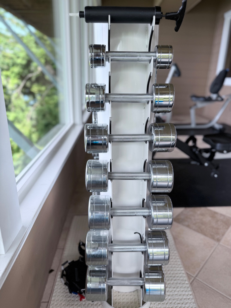 Vectra Dumbbell Rack with Weights, Bench and Protective Mat Includes 14 chrome dumbbells ranging from 5 to 35 lbs, arranged on a Vectra Fitness vertical rack. Set also includes a leather-covered weight bench, a 21" blue yoga ball, and a black protective mat by Sunny Health & Fitness. Dimensions: Dumbbell stand: 41" H x 17" W Bench: 45" L x 19" H x 12" W Mat: 89" x 40" Yoga ball: 21" diameter