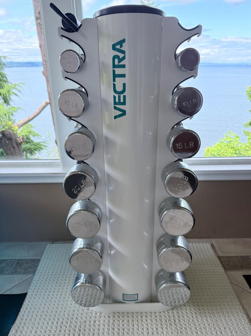 Lot # 119 - Vectra Dumbbell Rack with Weights, Bench and Protective Mat