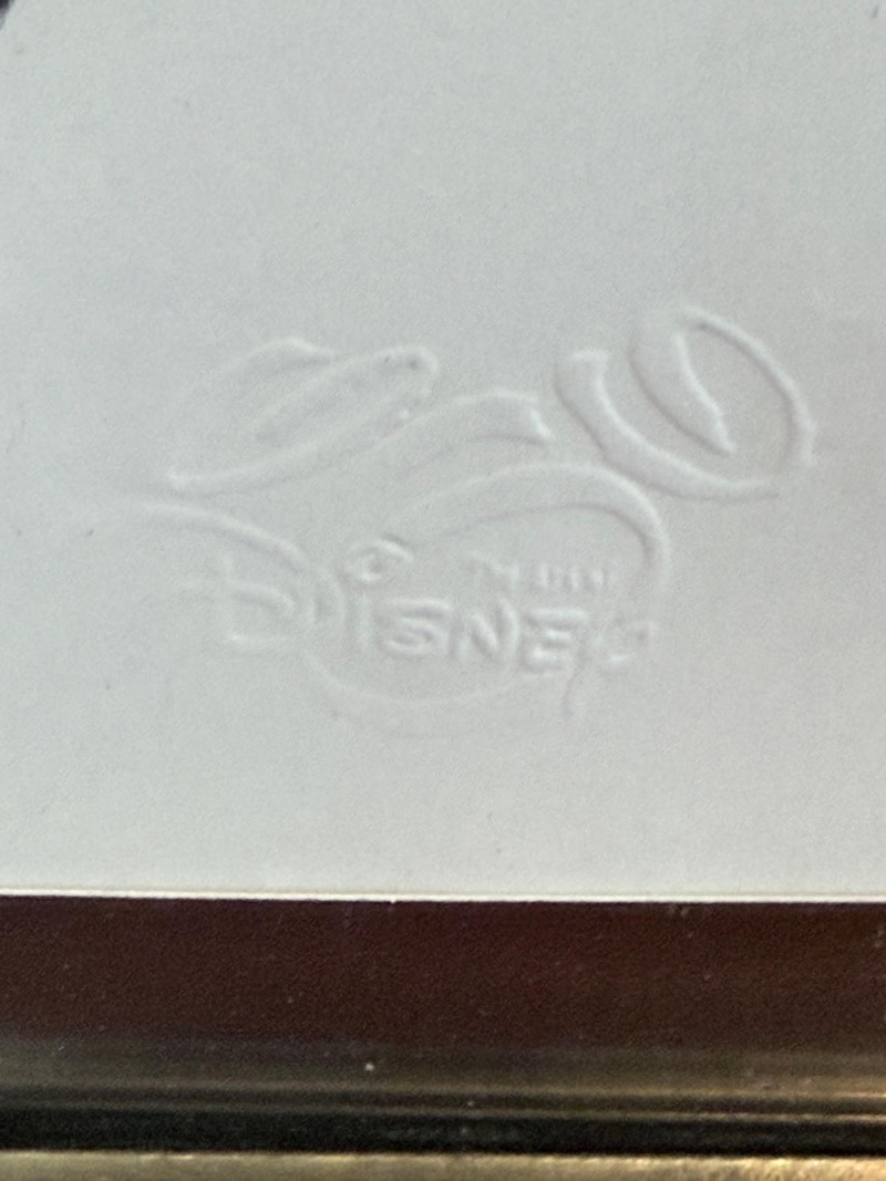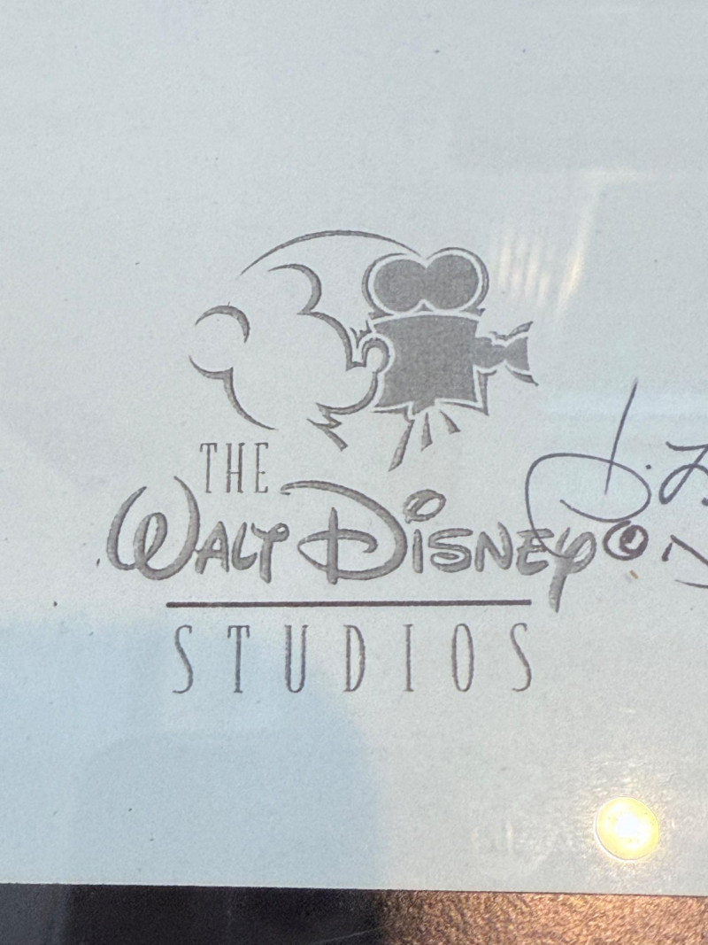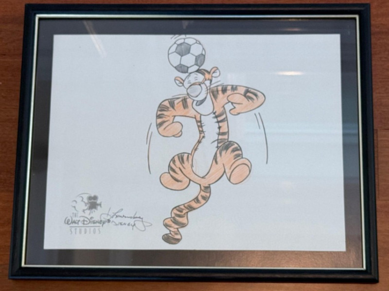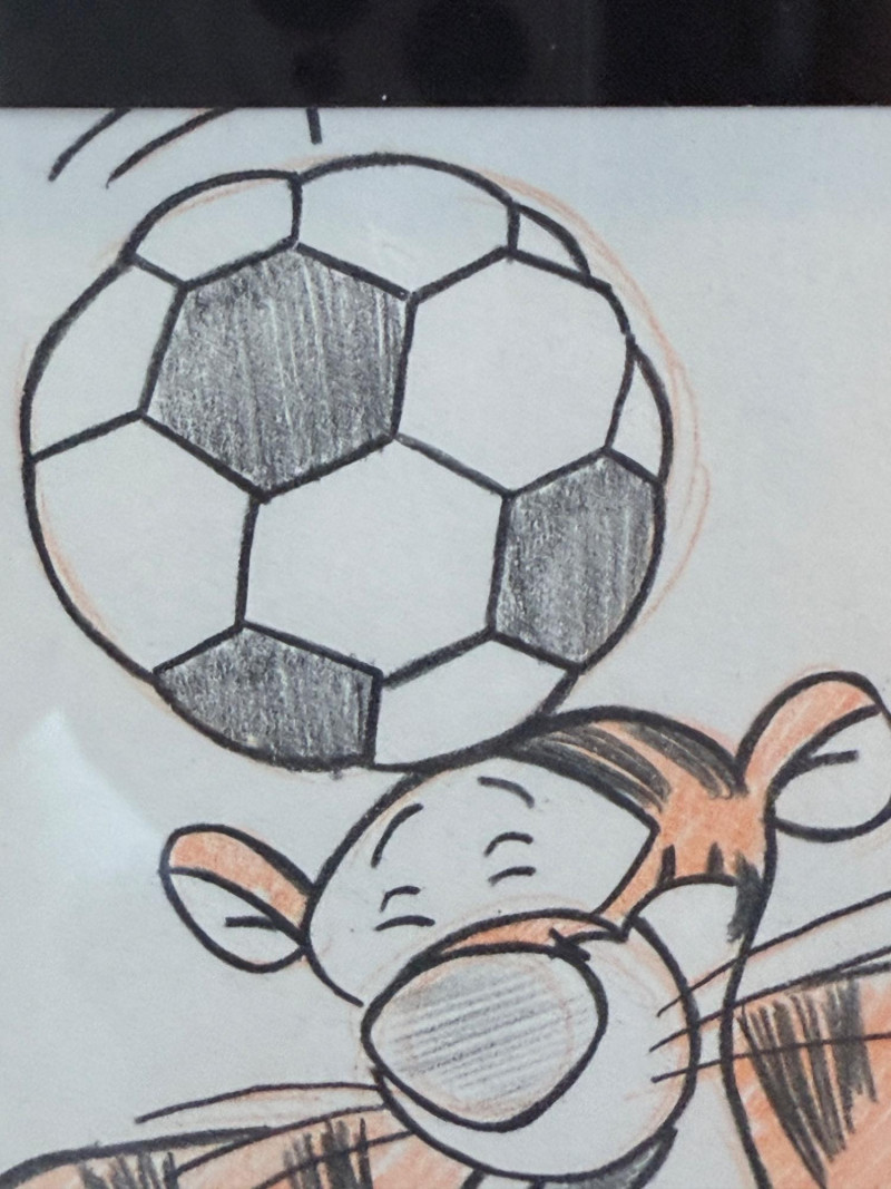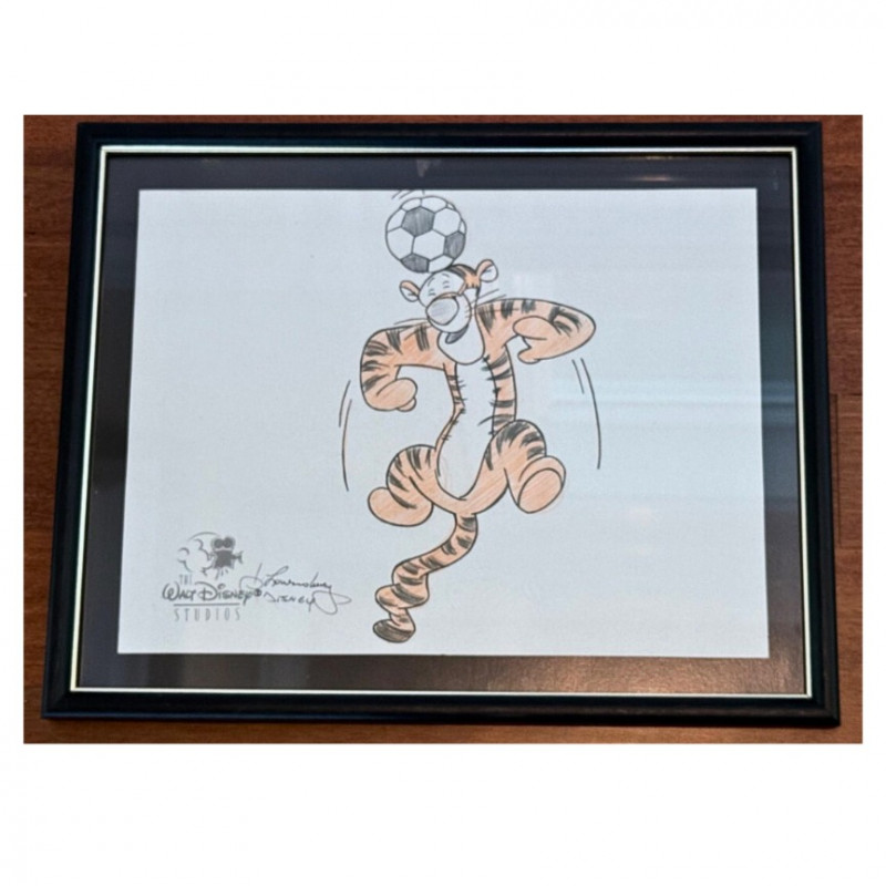 Walt Disney Studios Signed Embossed Pencil Drawing of Tigger Framed pencil drawing featuring Tigger from Disney's Winnie the Pooh, shown balancing a soccer ball. The image is hand-colored with tonal shading and line work. The drawing includes an embossed Walt Disney Studios seal and is hand-signed by the artist with a copyright mark beside the Disney name. The drawing is housed in a black frame with gold-tone inner lining and a sealed back. Dimensions: Materials: Pencil on paper, framed under glass.