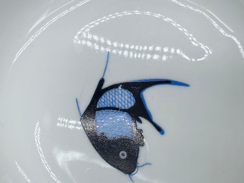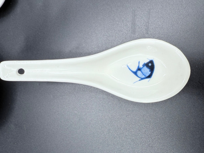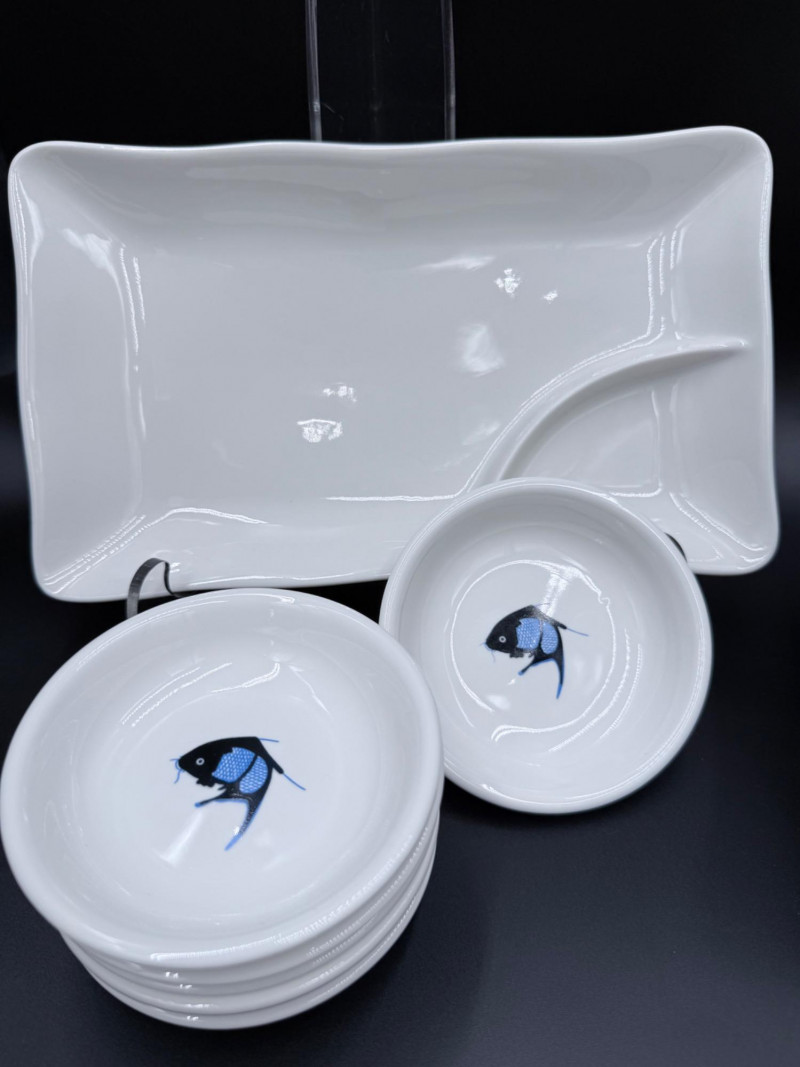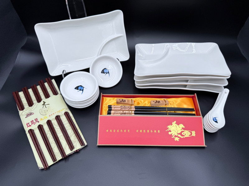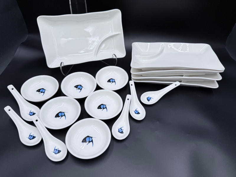 Durable China Sushi Set with Plates, Bowls, Spoons, and Chopsticks Porcelain sushi dining set featuring a black and blue fish motif across matching dinnerware. Each piece is marked “Durable China Made in China.” Set includes: 5 rectangular sushi plates (6" x 10") 6 round bowls (4") 6 porcelain soup spoons (5") 12 pairs of chopsticks in two styles