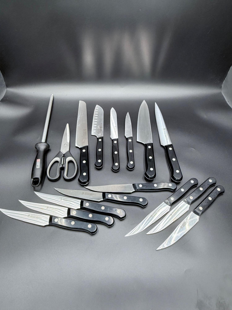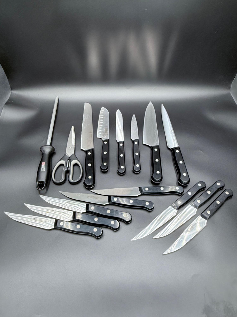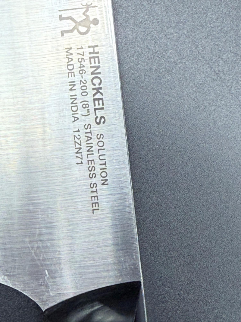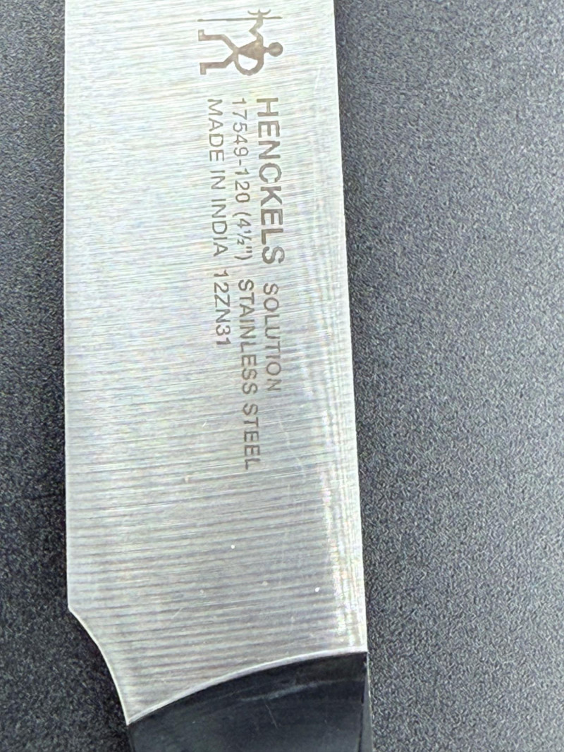 Henckels Solution Knife Set – Made in India Knife set from the Henckels Solution series, featuring stainless steel blades and triple-riveted black handles. Each blade is marked “Henckels Solution” and made in India. Set Includes: Chef’s knife Bread knife Santoku knife Utility knives Paring knives Steak knives Kitchen shears Honing steel