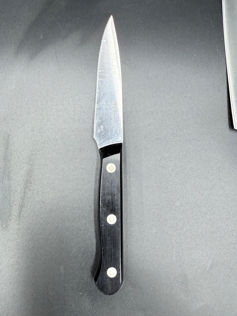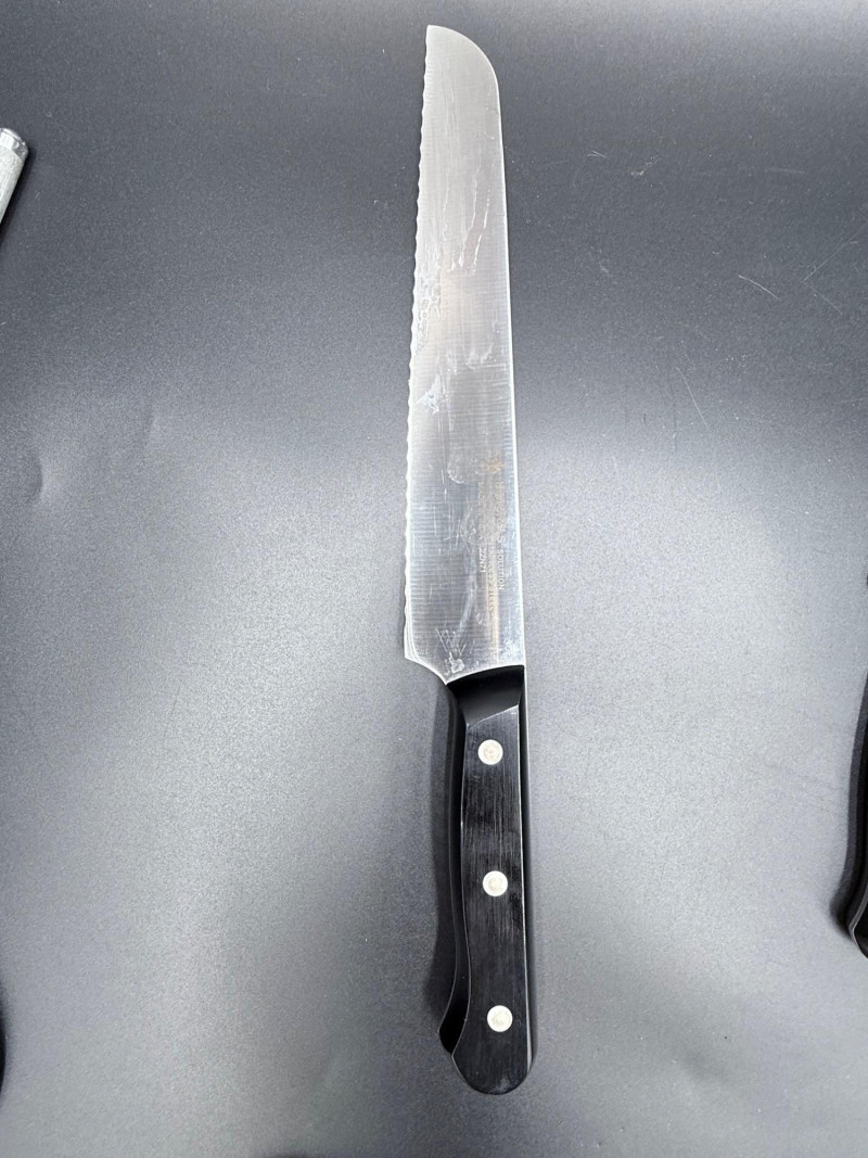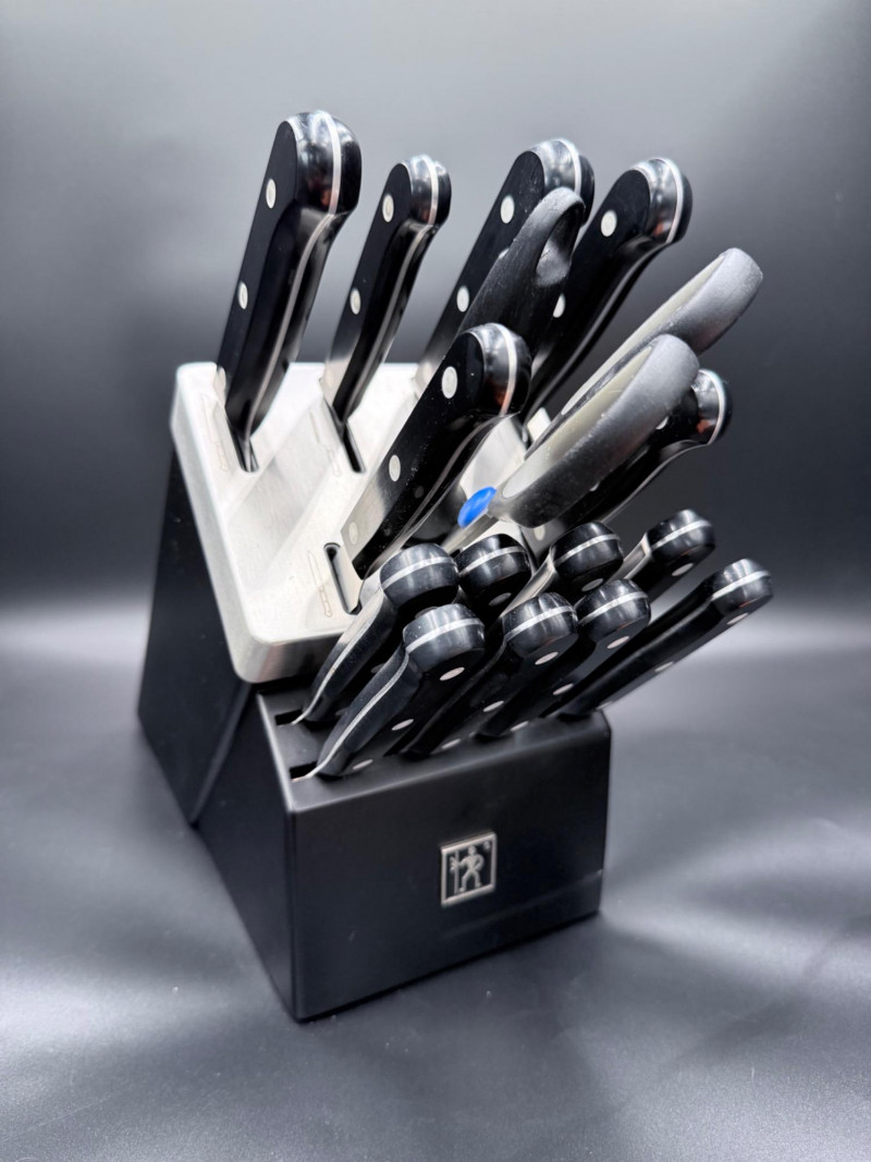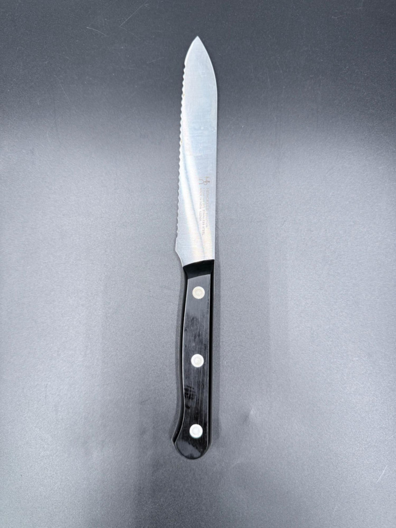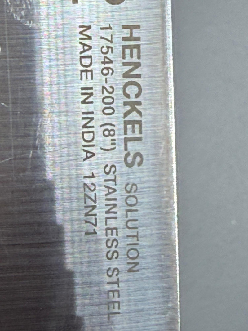 Henckels Solution Knife Set – Made in India Knife set from the Henckels Solution series, featuring stainless steel blades and triple-riveted black handles. Each blade is marked “Henckels Solution” and made in India. Set Includes: Chef’s knife Bread knife Santoku knife Utility knives Paring knives Steak knives Kitchen shears Honing steel