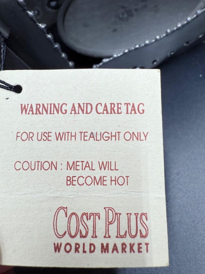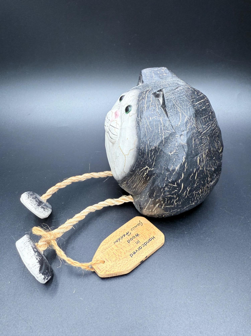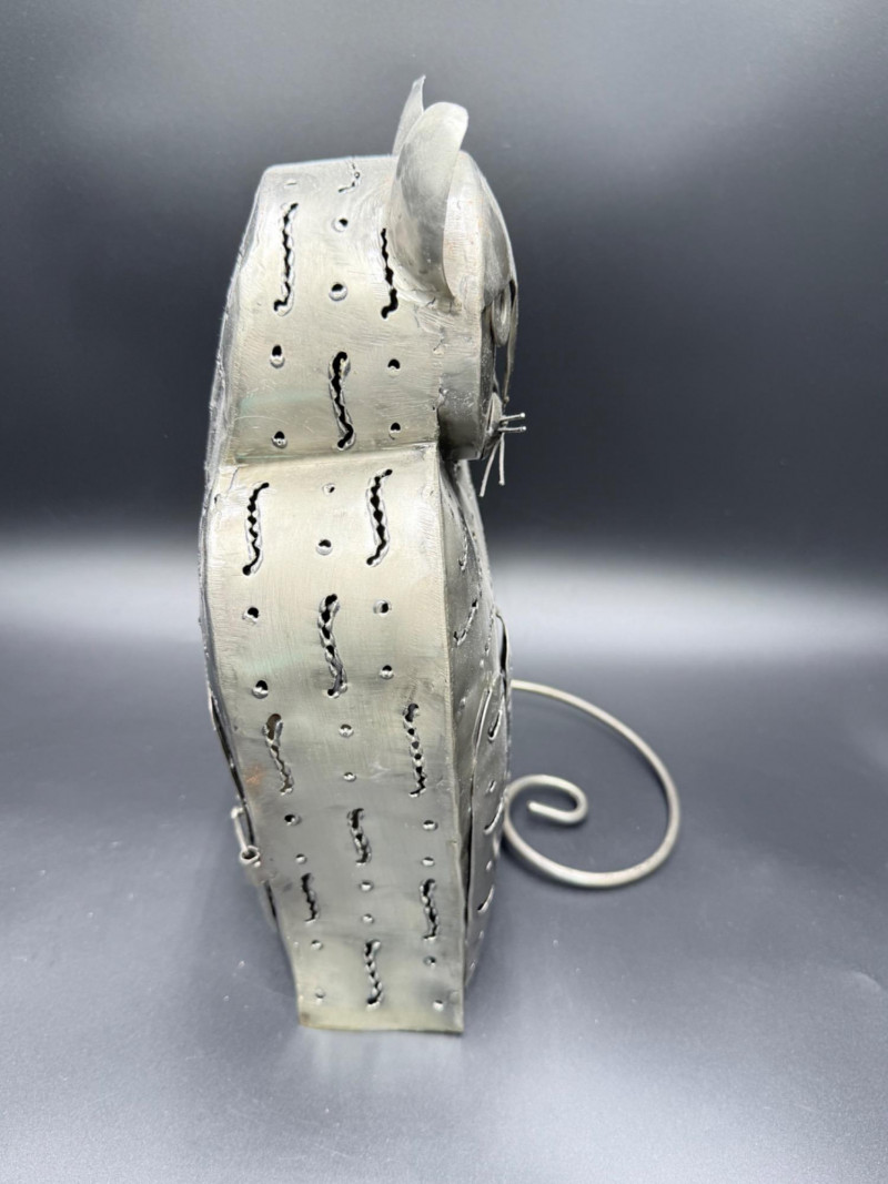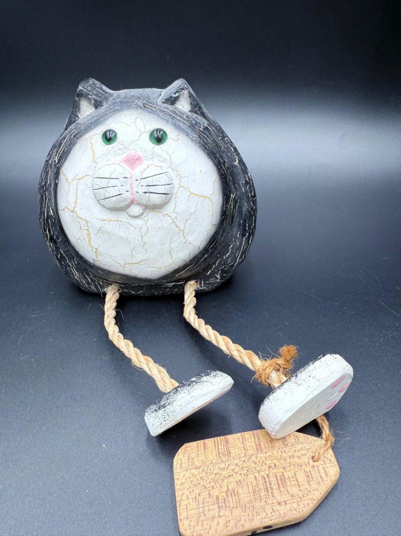 Metal Cat Tea light Holder and Hand-carved Cat by James Haddon Two cat-themed decorative pieces. The first is a metal tea light holder with pierced surface detailing, curled tail, and sculpted facial features. Intended for use with a tealight candle. The second is a hand-carved cat figure by James Haddon, with a rounded form, sculpted face, rope legs, and flat ceramic feet. Each piece has original tags attached. Measurements: Metal Cat Tea light Holder: 13" tall × 8" wide Hand-carved Cat by James Haddon: 5" × 4.5" × 6" depth