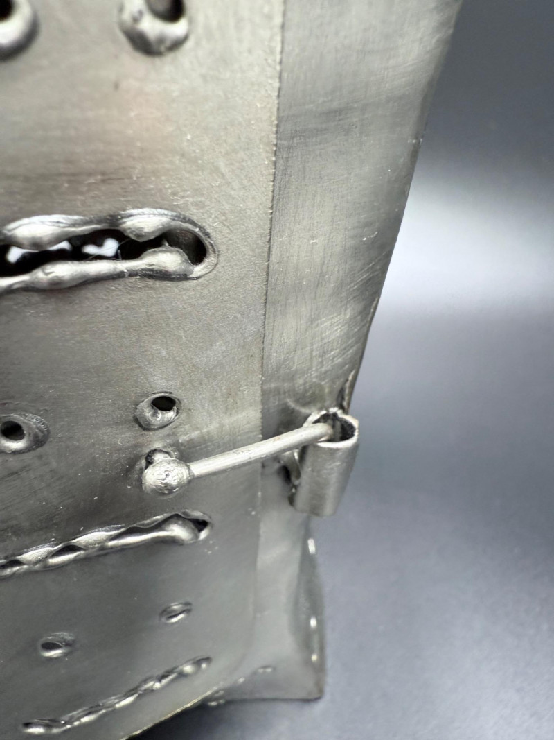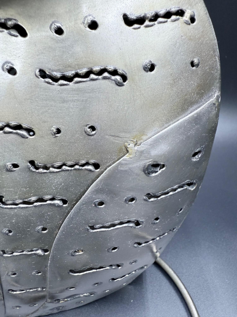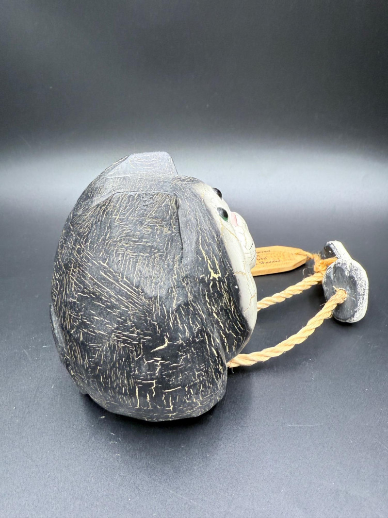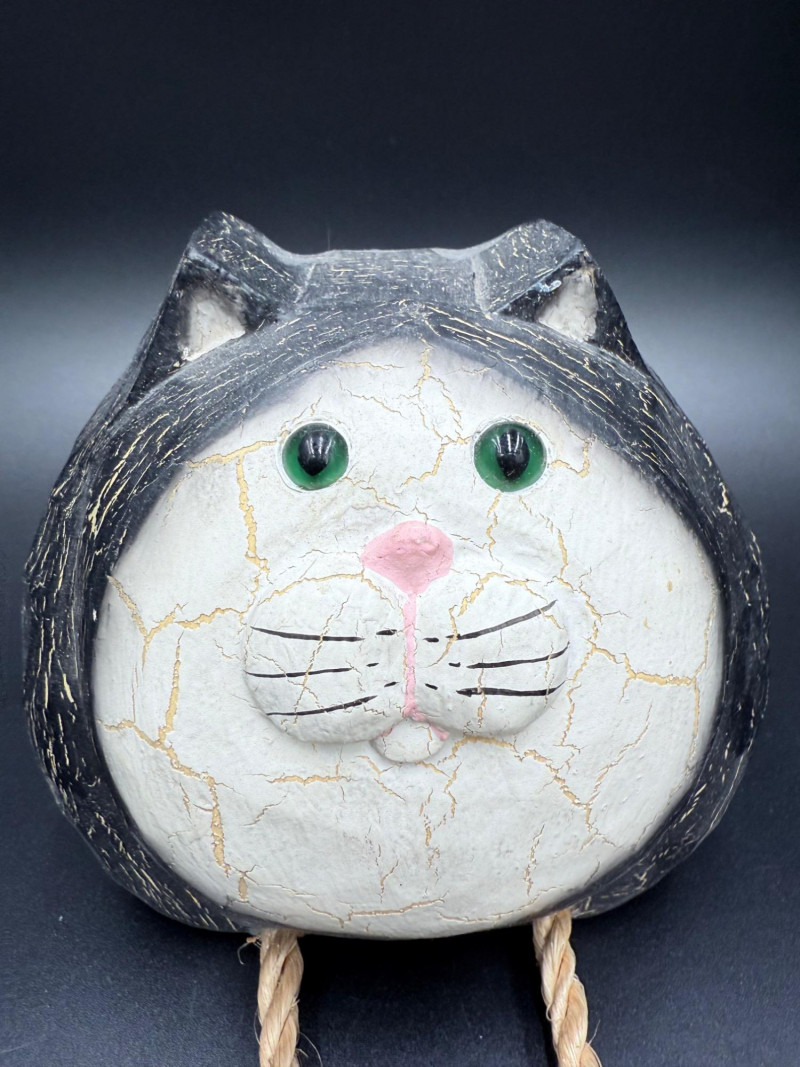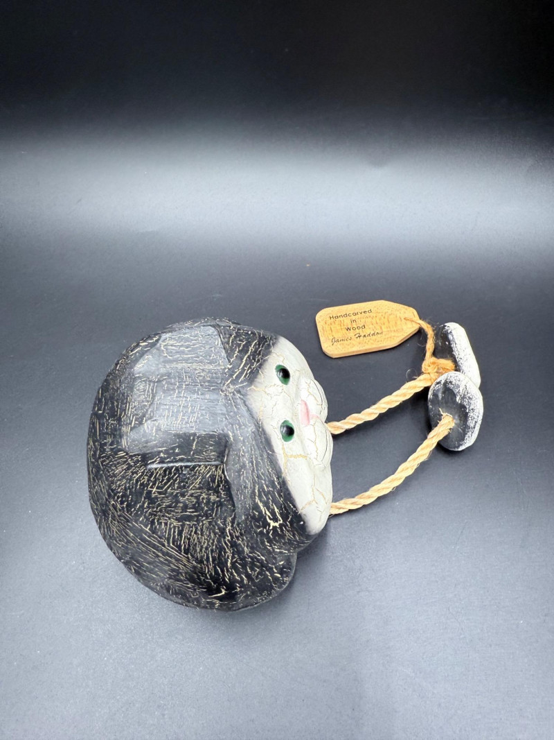 Metal Cat Tea light Holder and Hand-carved Cat by James Haddon Two cat-themed decorative pieces. The first is a metal tea light holder with pierced surface detailing, curled tail, and sculpted facial features. Intended for use with a tealight candle. The second is a hand-carved cat figure by James Haddon, with a rounded form, sculpted face, rope legs, and flat ceramic feet. Each piece has original tags attached. Measurements: Metal Cat Tea light Holder: 13" tall × 8" wide Hand-carved Cat by James Haddon: 5" × 4.5" × 6" depth