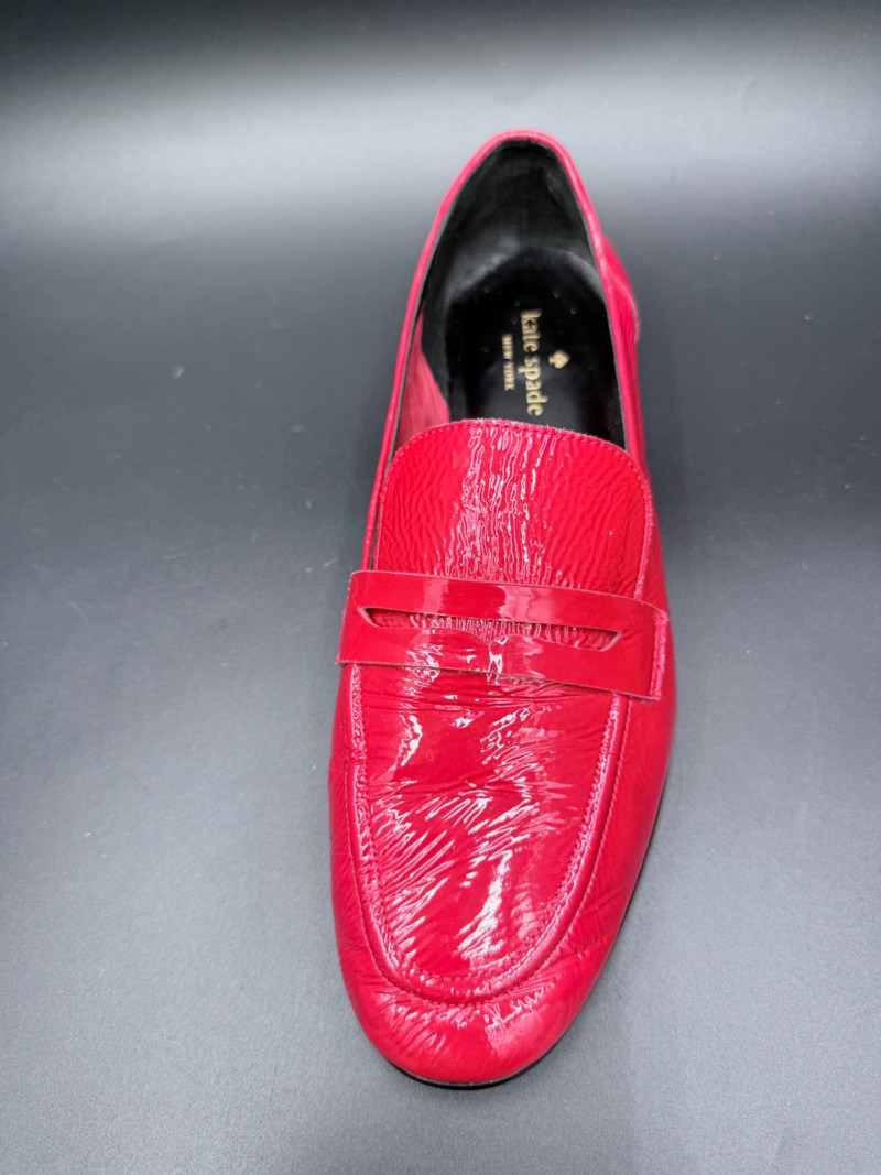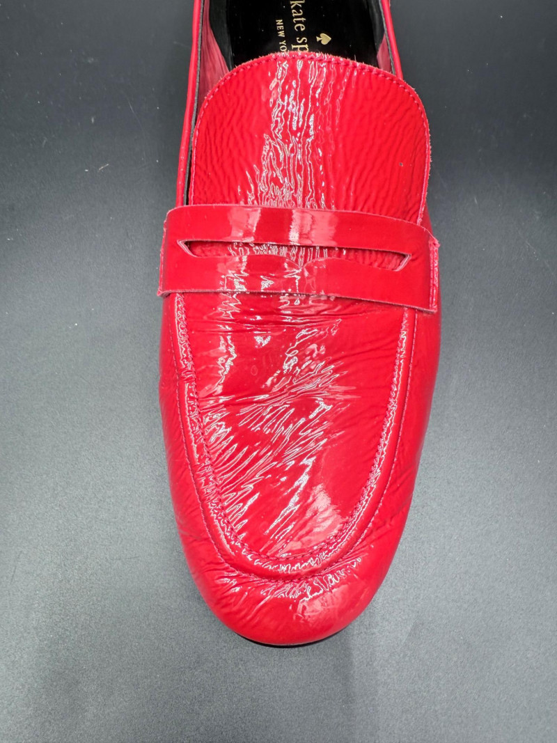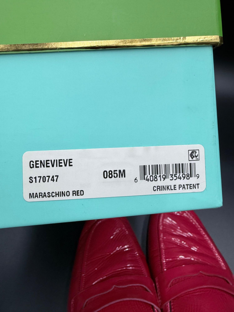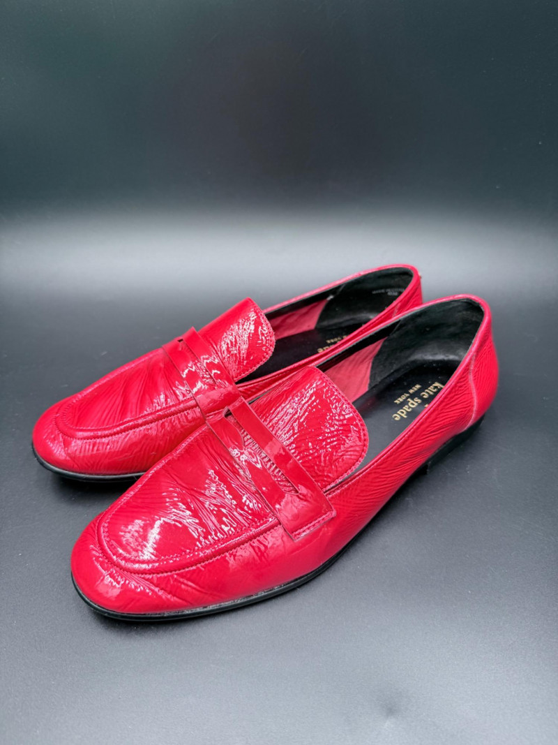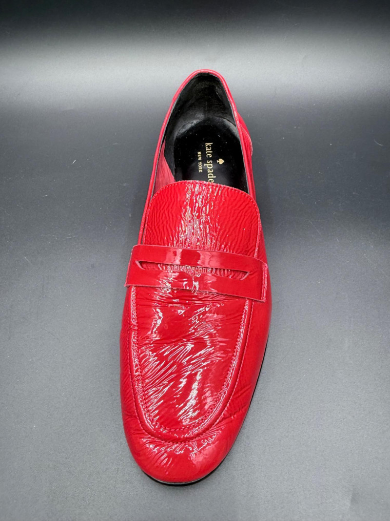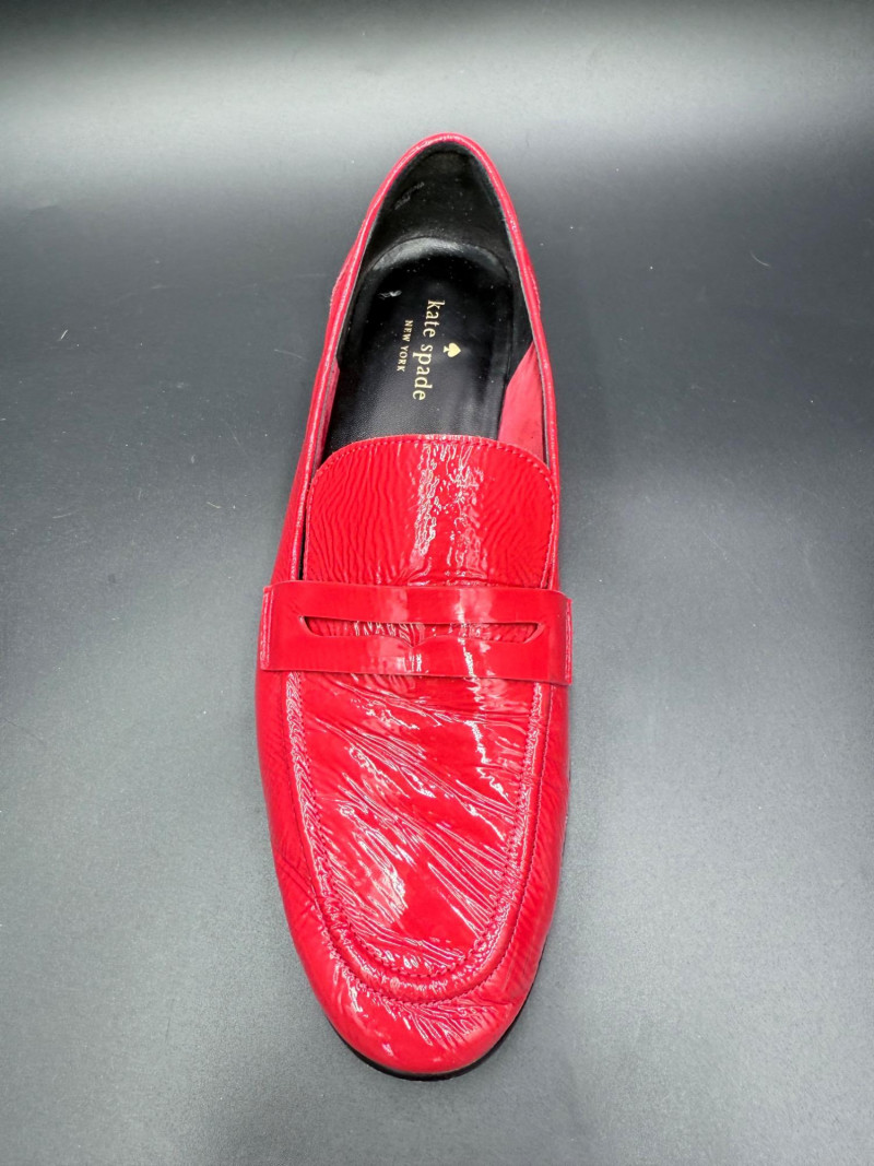 Kate Spade New York Crinkle Patent Loafers – Maraschino Red, Size 8.5M Pair of penny-style loafers in maraschino red crinkle patent finish. Features a raised vamp strap, rounded toe, low stacked heel, and black soles. The insole is marked with the Kate Spade New York logo. Includes original box labeled “Genevieve” style, size 8.5M. Made in China.