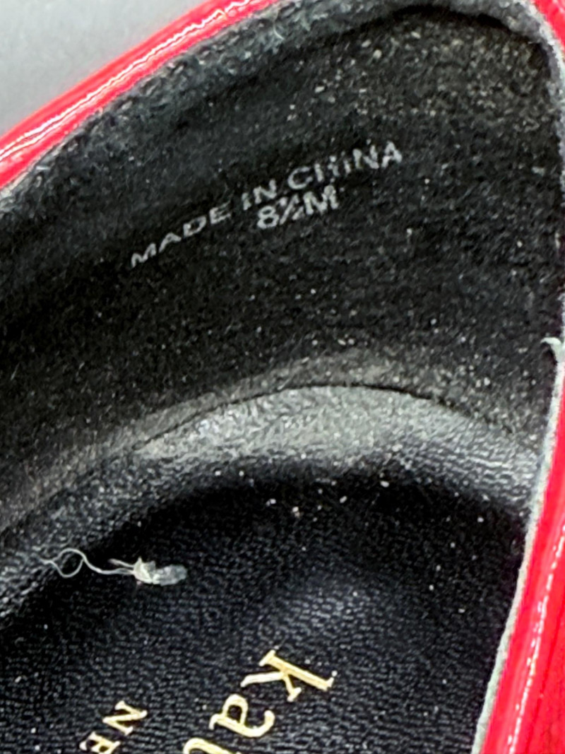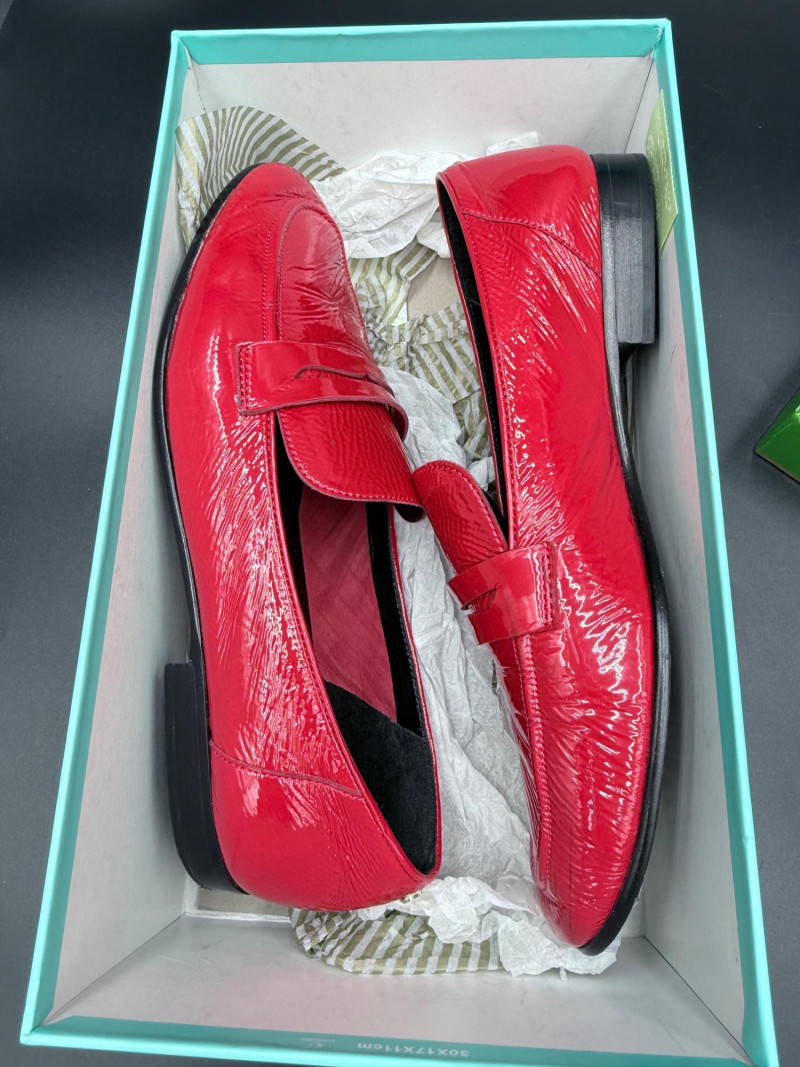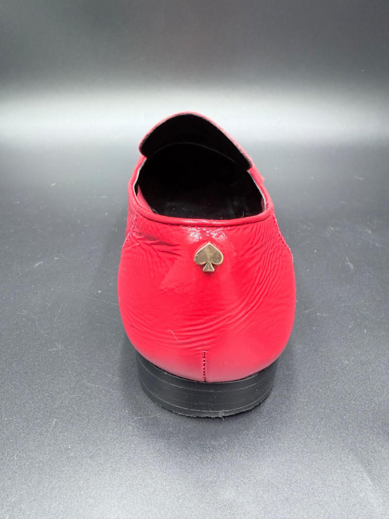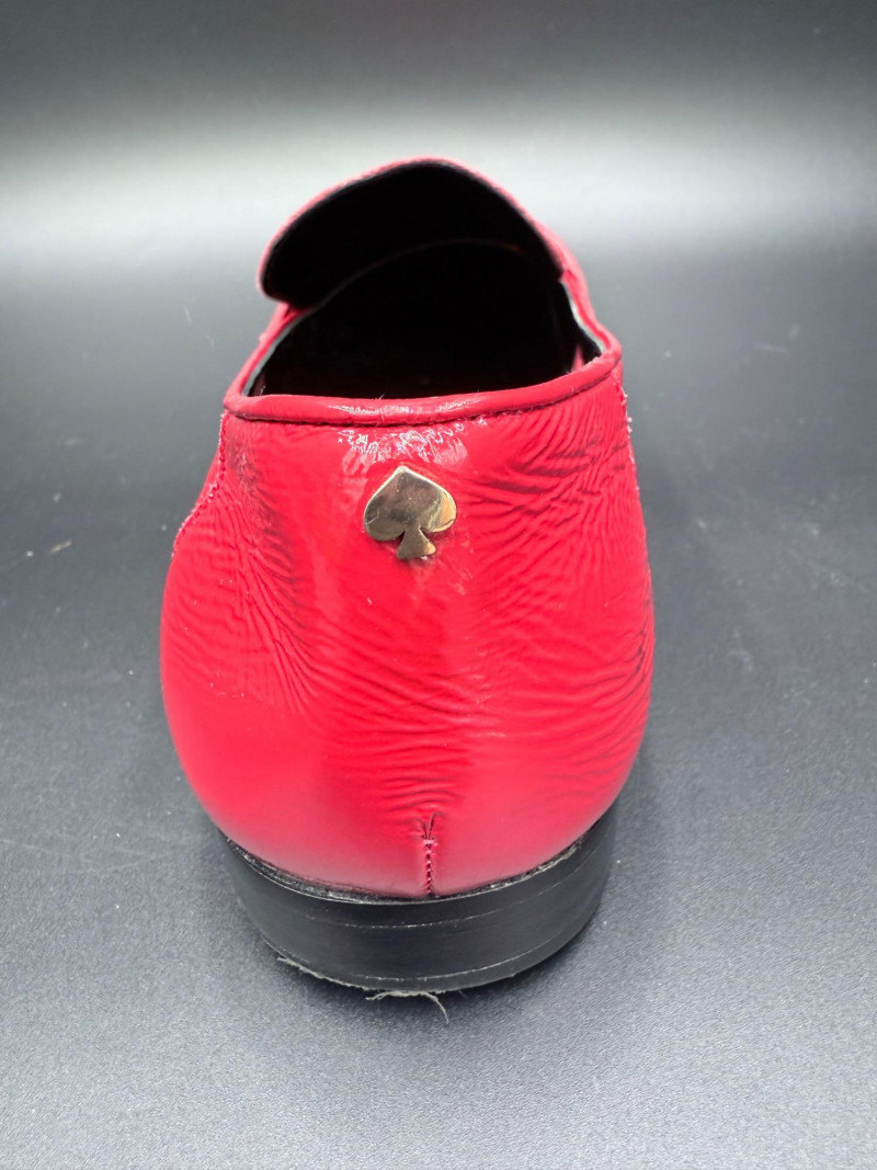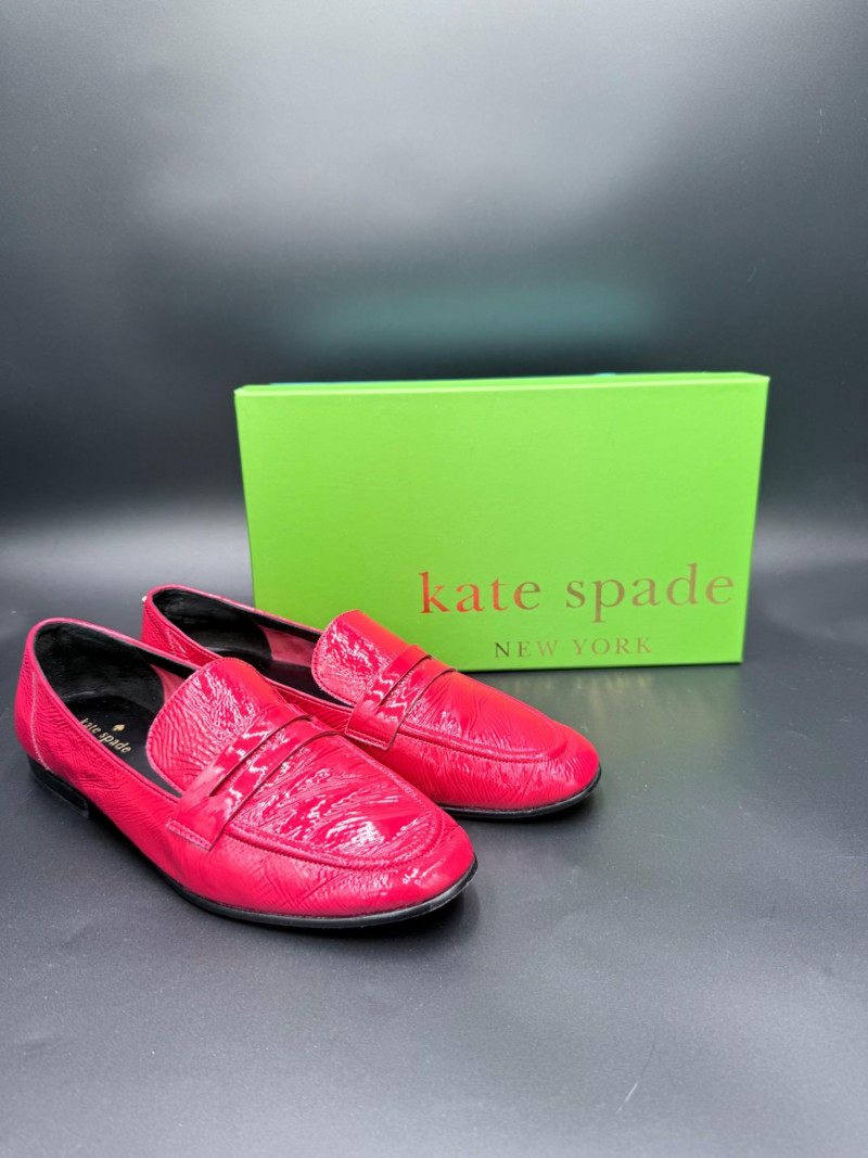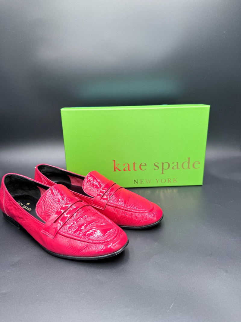 Kate Spade New York Crinkle Patent Loafers – Maraschino Red, Size 8.5M Pair of penny-style loafers in maraschino red crinkle patent finish. Features a raised vamp strap, rounded toe, low stacked heel, and black soles. The insole is marked with the Kate Spade New York logo. Includes original box labeled “Genevieve” style, size 8.5M. Made in China.