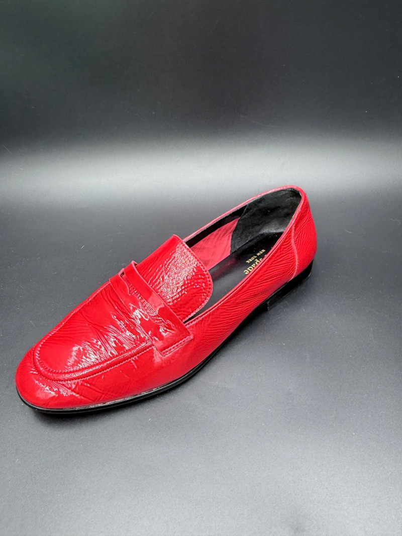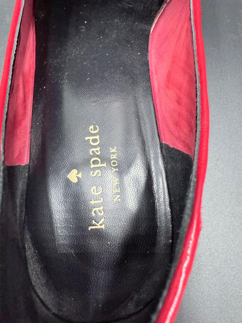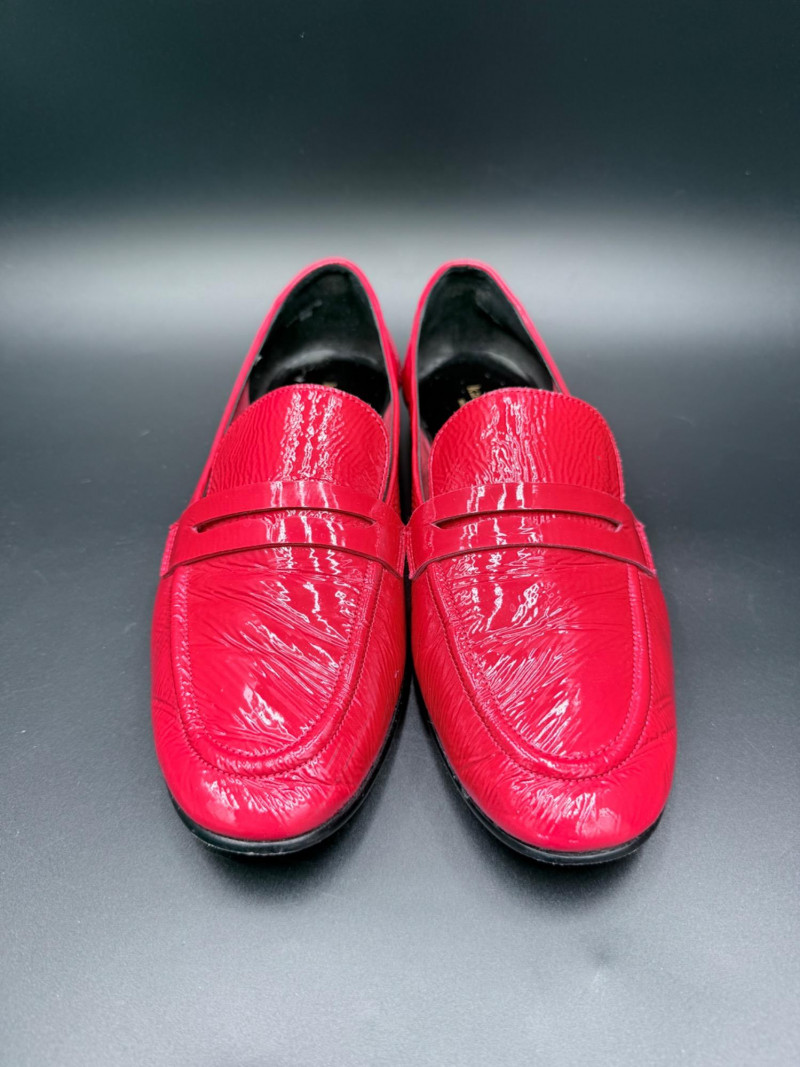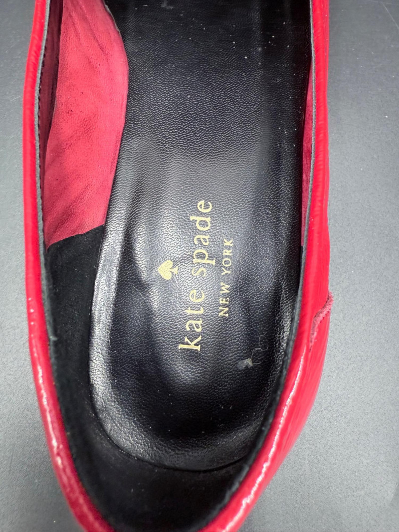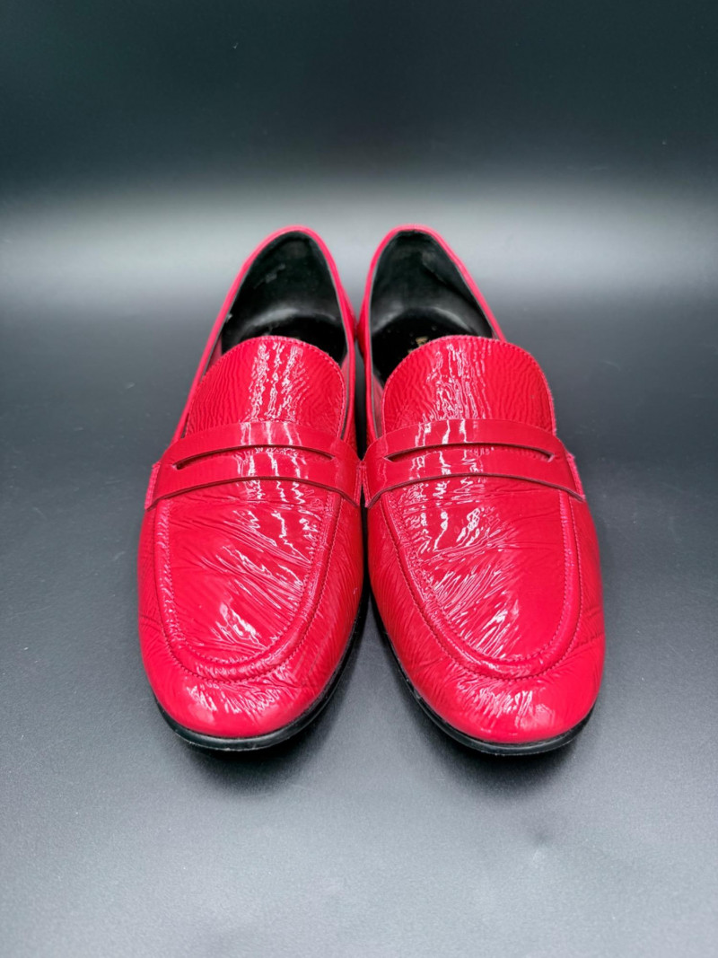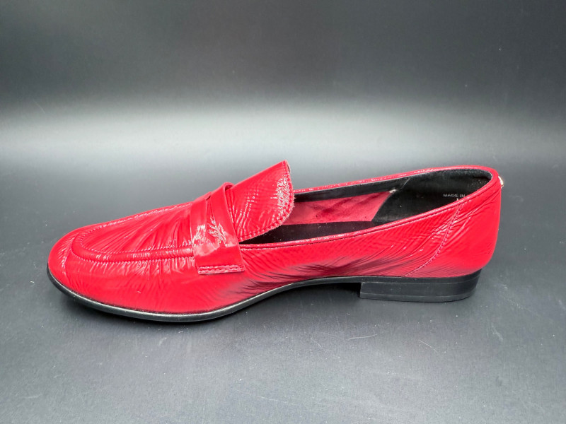 Kate Spade New York Crinkle Patent Loafers – Maraschino Red, Size 8.5M Pair of penny-style loafers in maraschino red crinkle patent finish. Features a raised vamp strap, rounded toe, low stacked heel, and black soles. The insole is marked with the Kate Spade New York logo. Includes original box labeled “Genevieve” style, size 8.5M. Made in China.