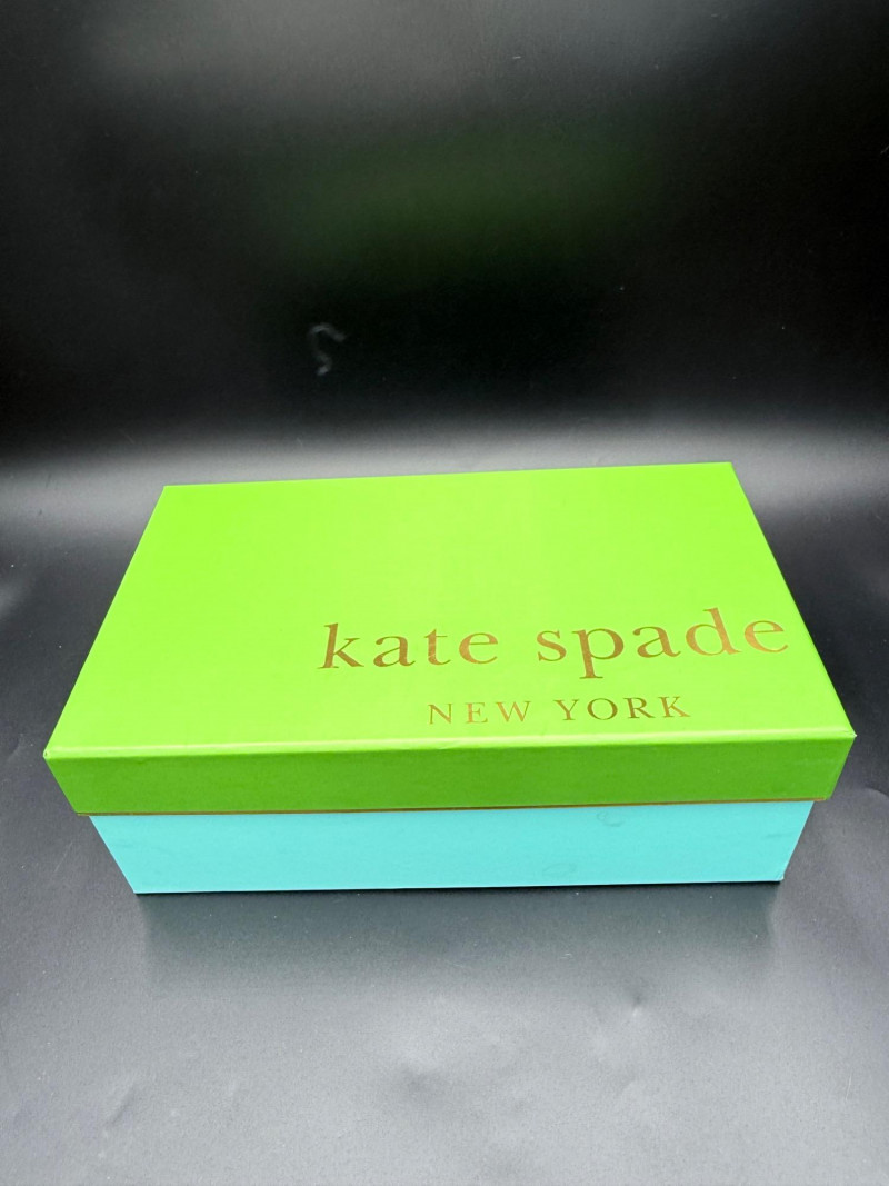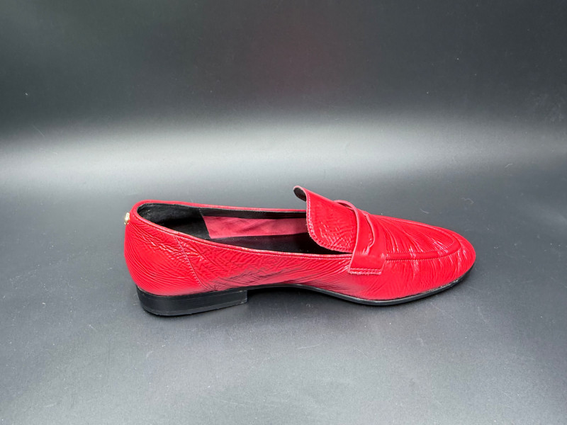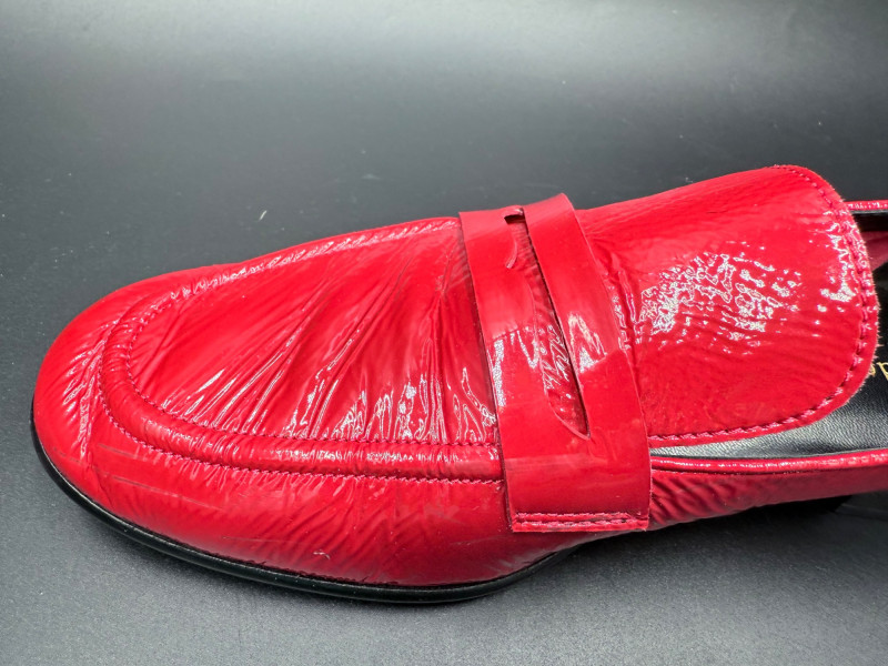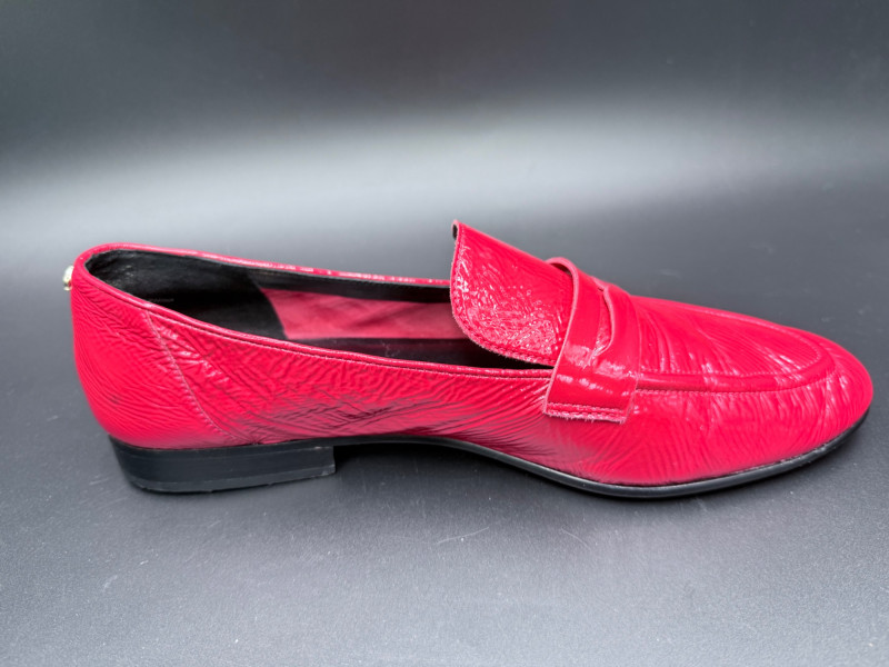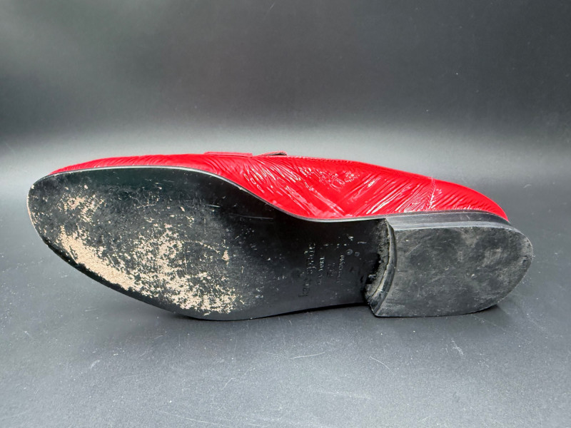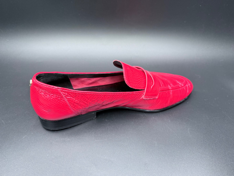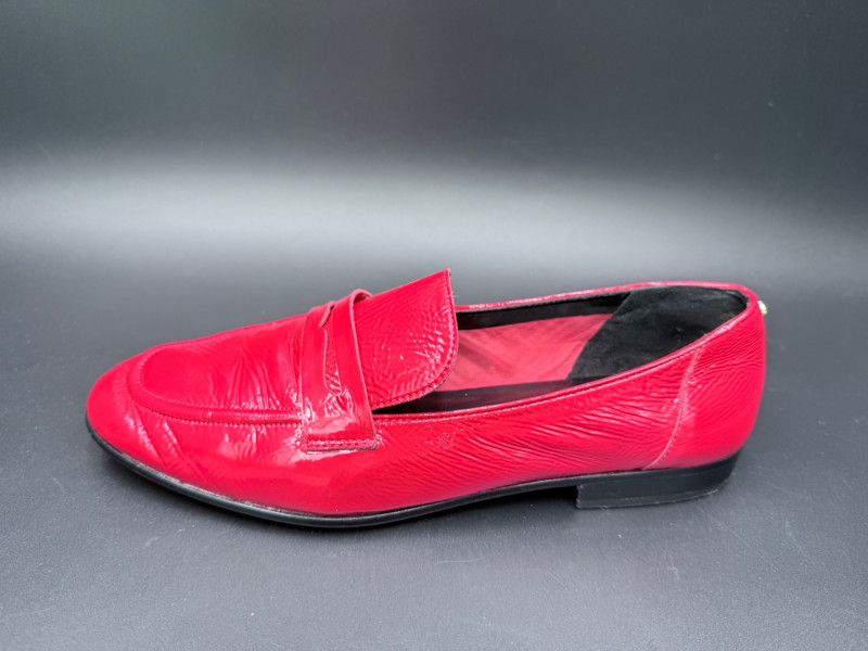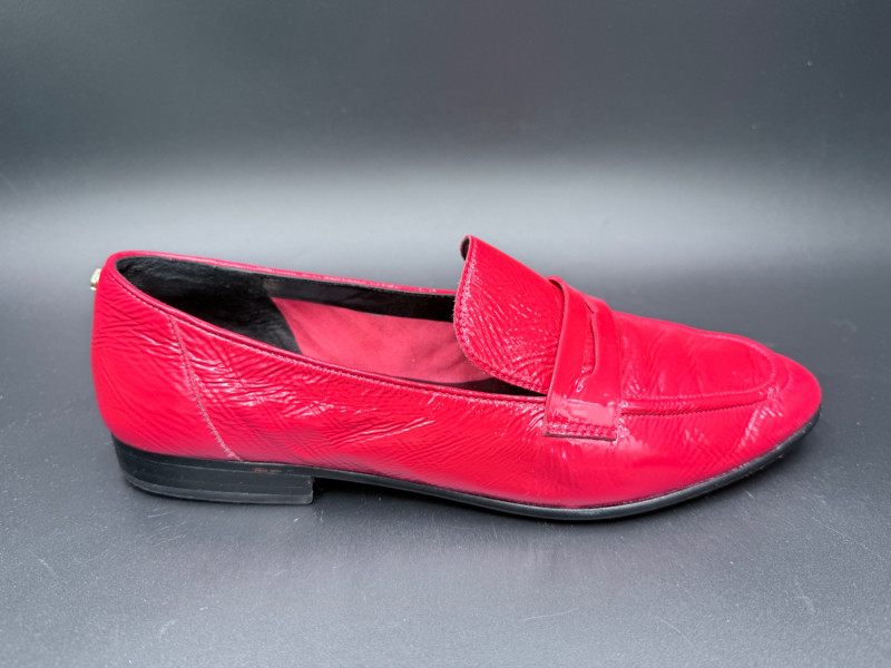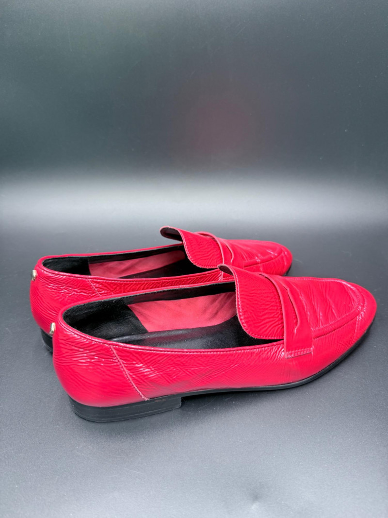 Kate Spade New York Crinkle Patent Loafers – Maraschino Red, Size 8.5M Pair of penny-style loafers in maraschino red crinkle patent finish. Features a raised vamp strap, rounded toe, low stacked heel, and black soles. The insole is marked with the Kate Spade New York logo. Includes original box labeled “Genevieve” style, size 8.5M. Made in China.