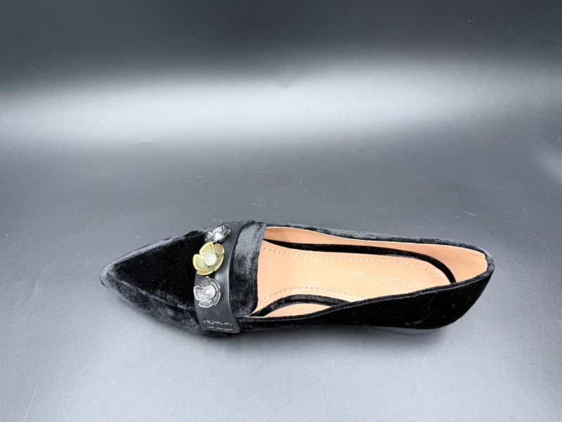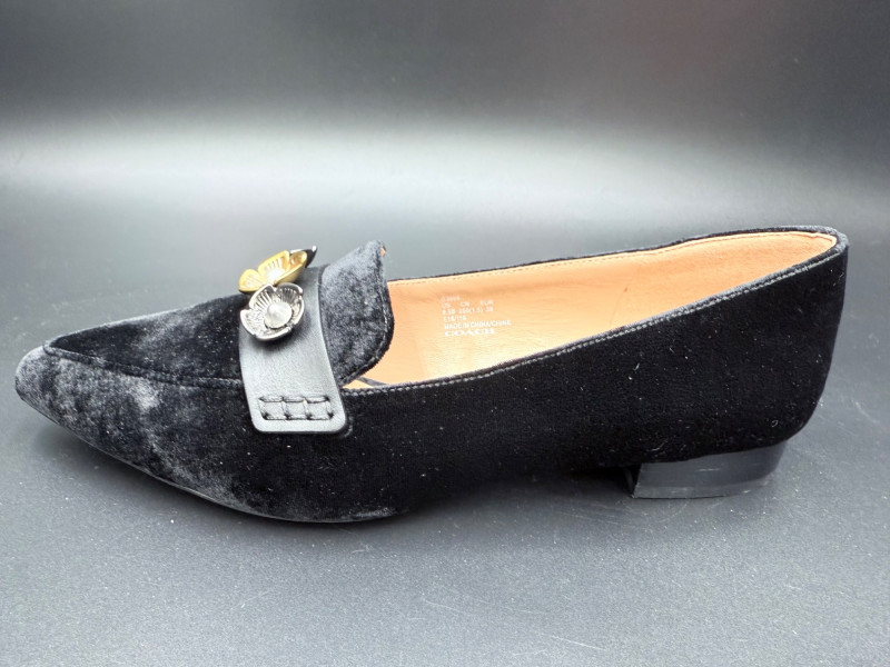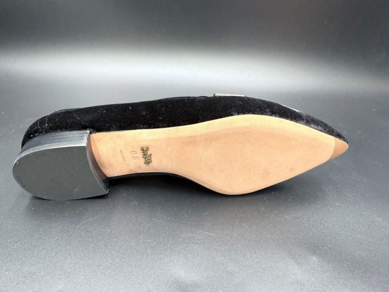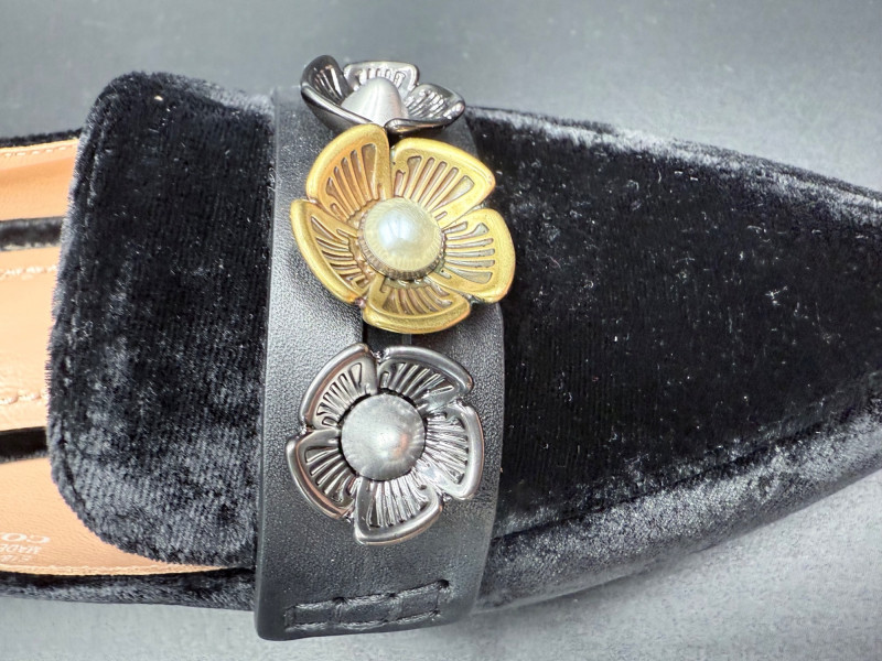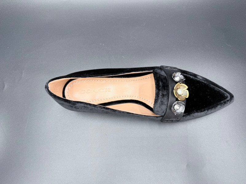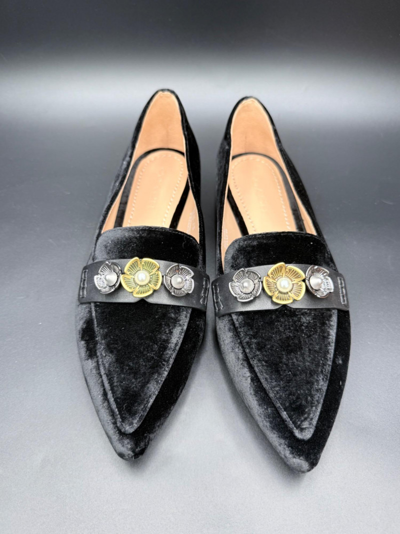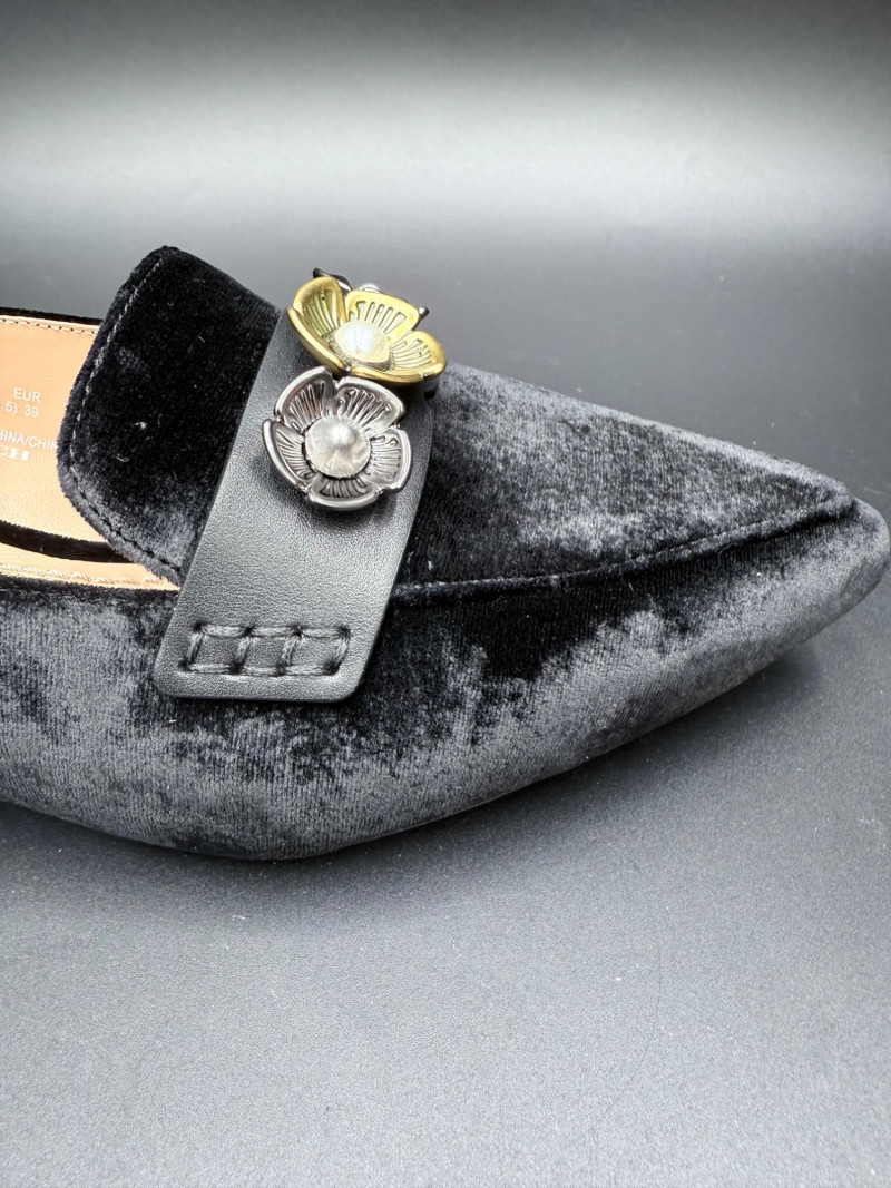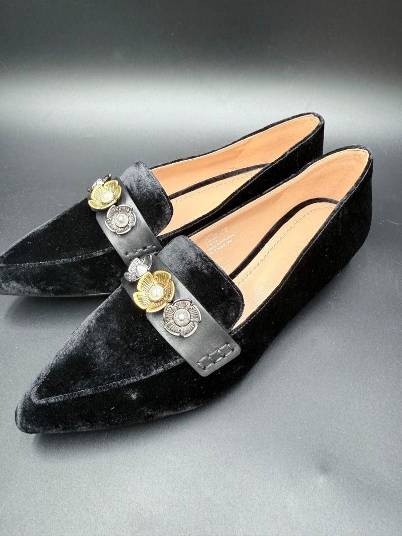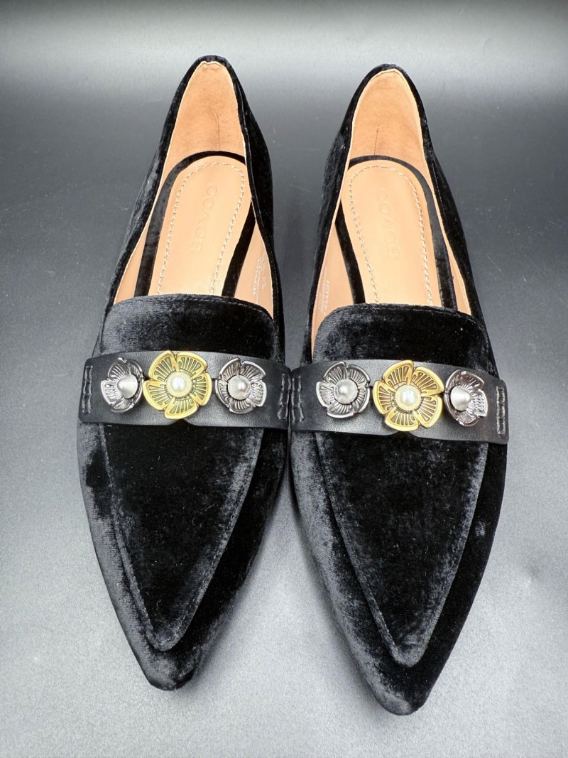 Coach Naomi Velvet Loafers – Size 8.5B Black velvet loafers with pointed toes and leather strap accents. Decorative metal floral appliqués are attached to the strap. Features a low stacked heel with Coach branding on the outer heel. Leather lining and genuine leather sole marked "Vero Cuoio." Brand new, never been used.