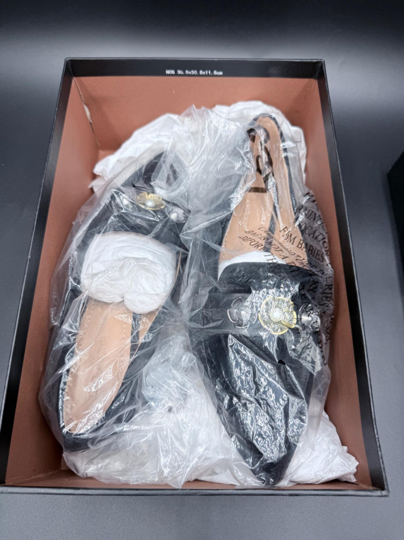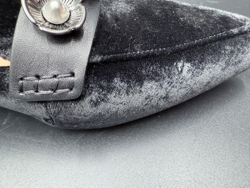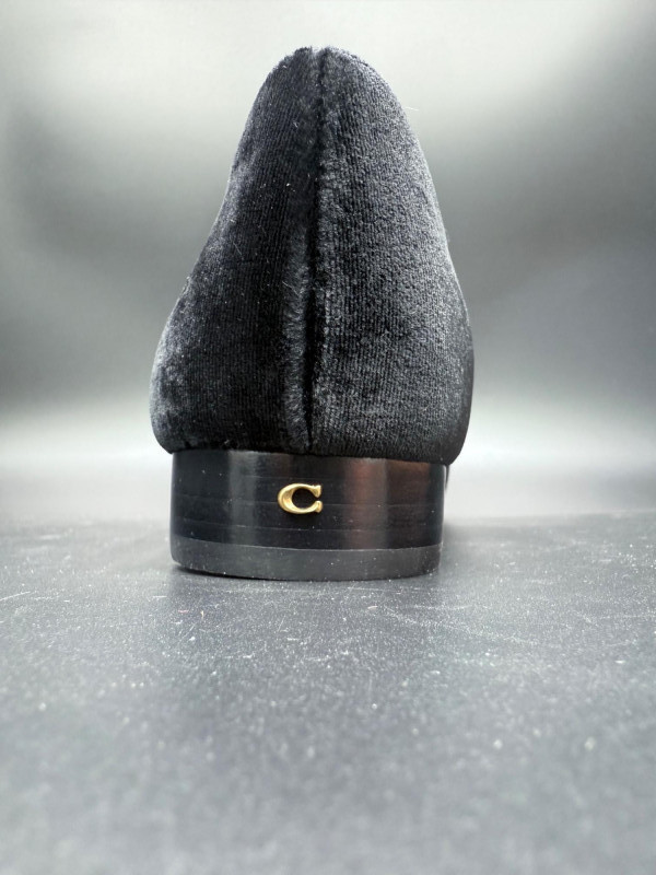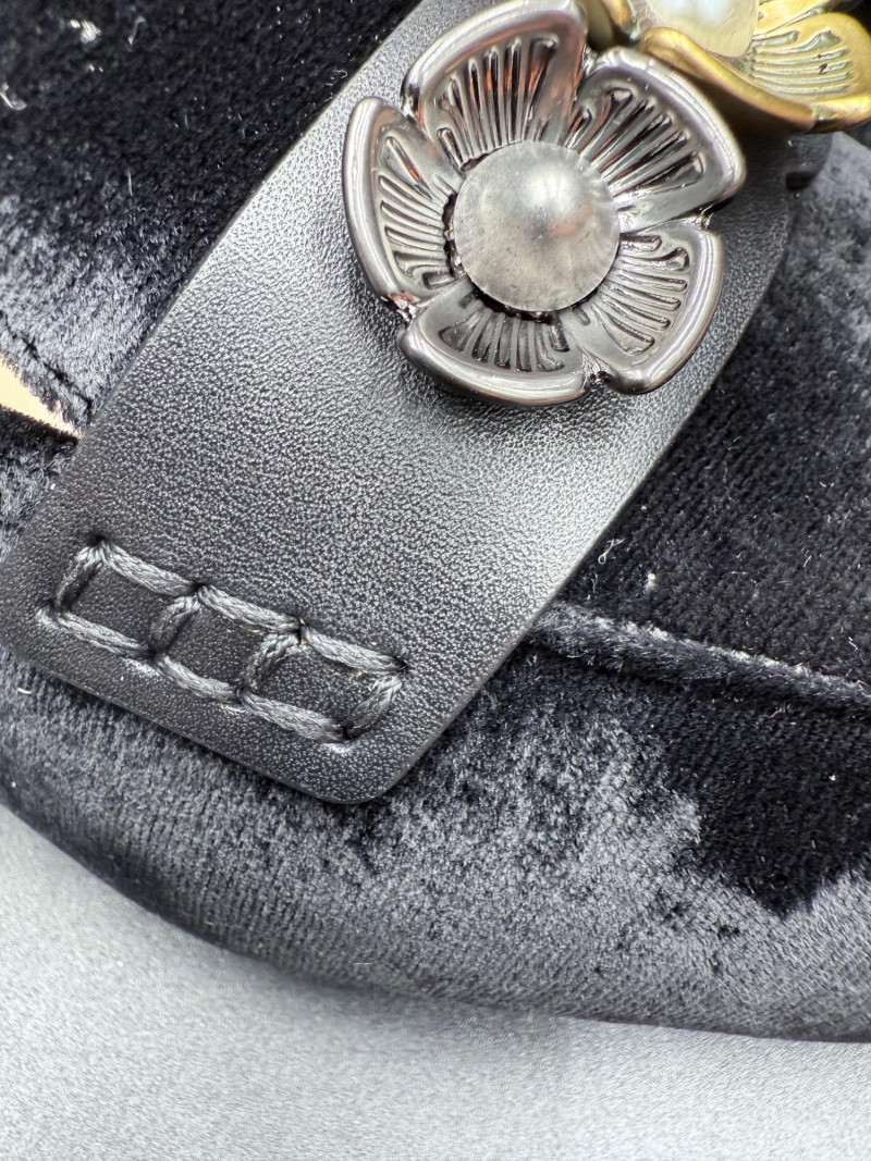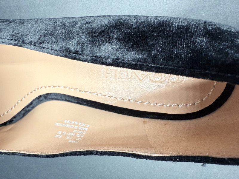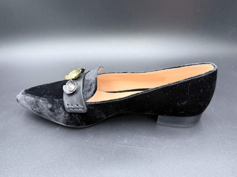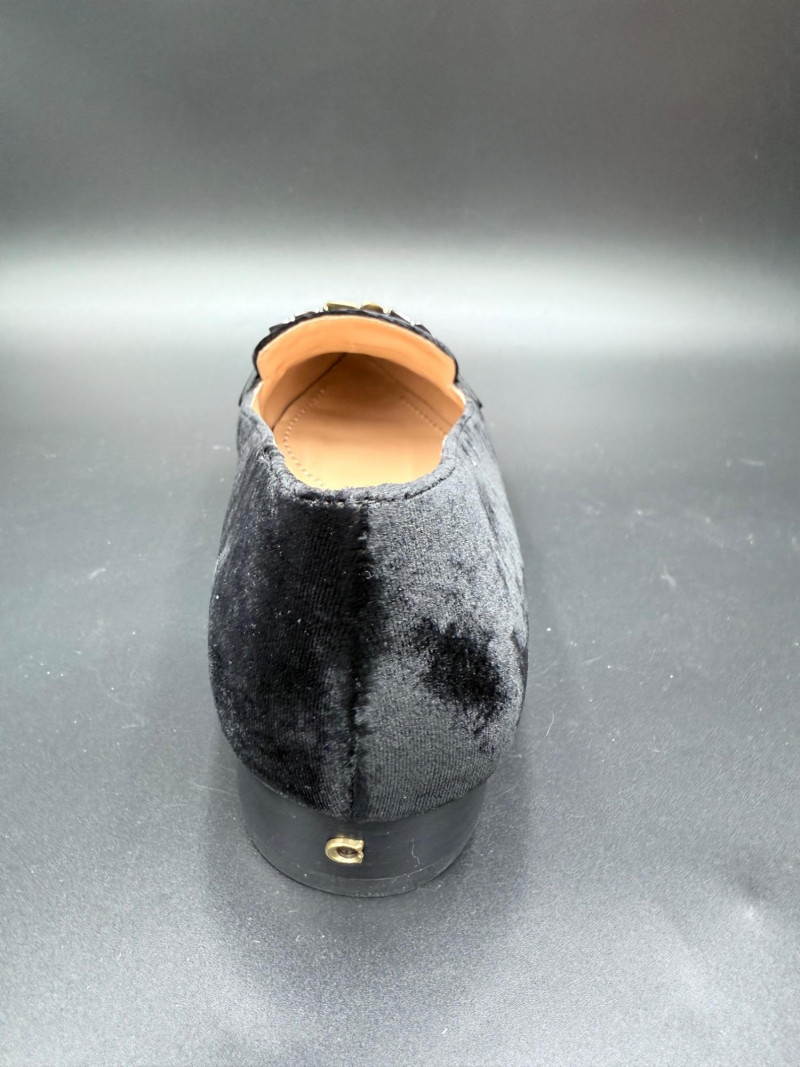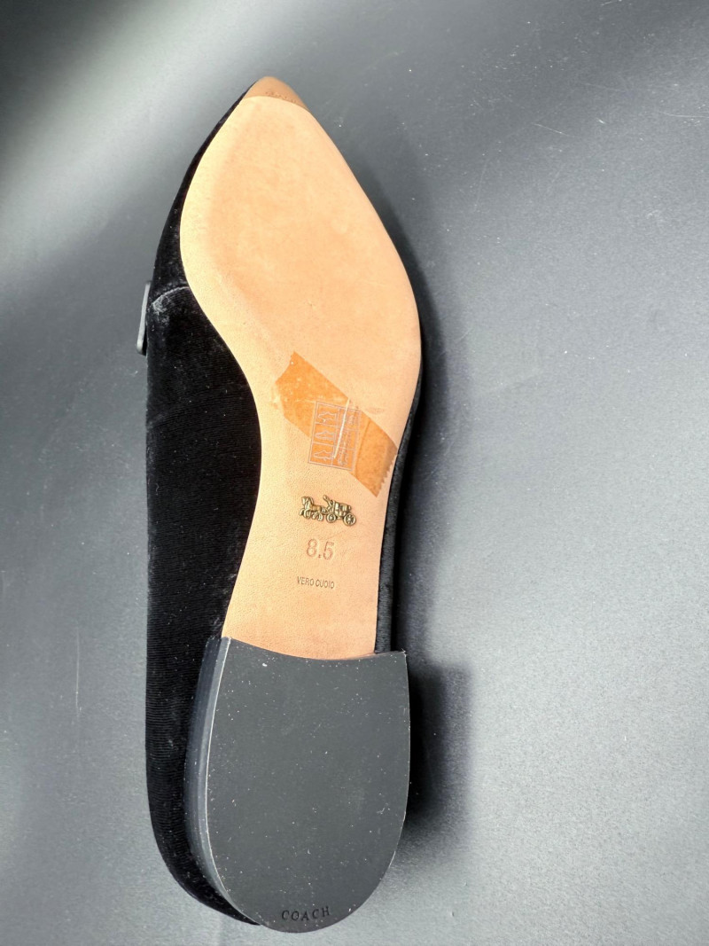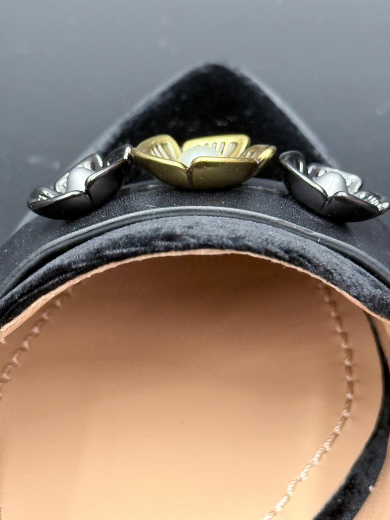 Coach Naomi Velvet Loafers – Size 8.5B Black velvet loafers with pointed toes and leather strap accents. Decorative metal floral appliqués are attached to the strap. Features a low stacked heel with Coach branding on the outer heel. Leather lining and genuine leather sole marked "Vero Cuoio." Brand new, never been used.