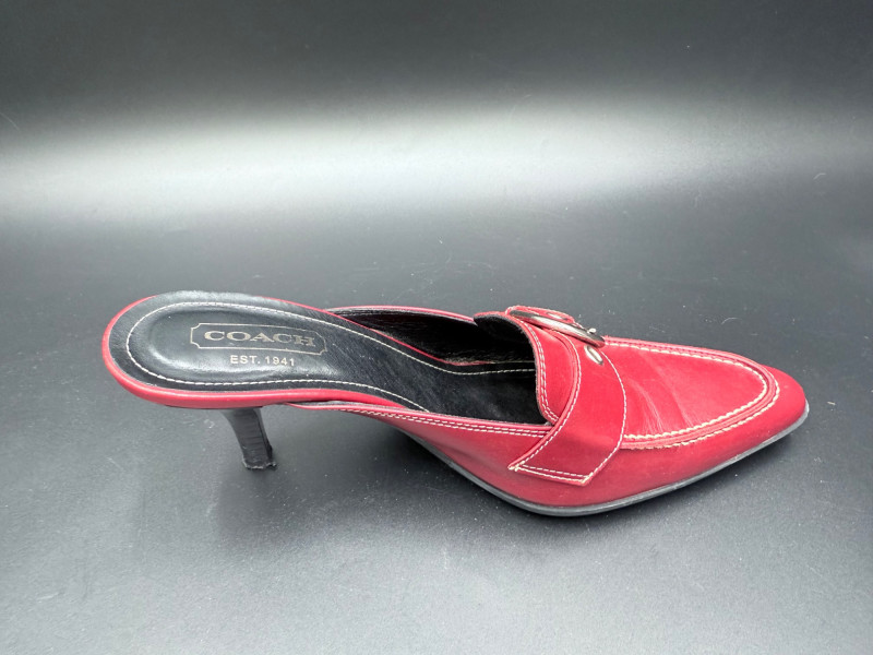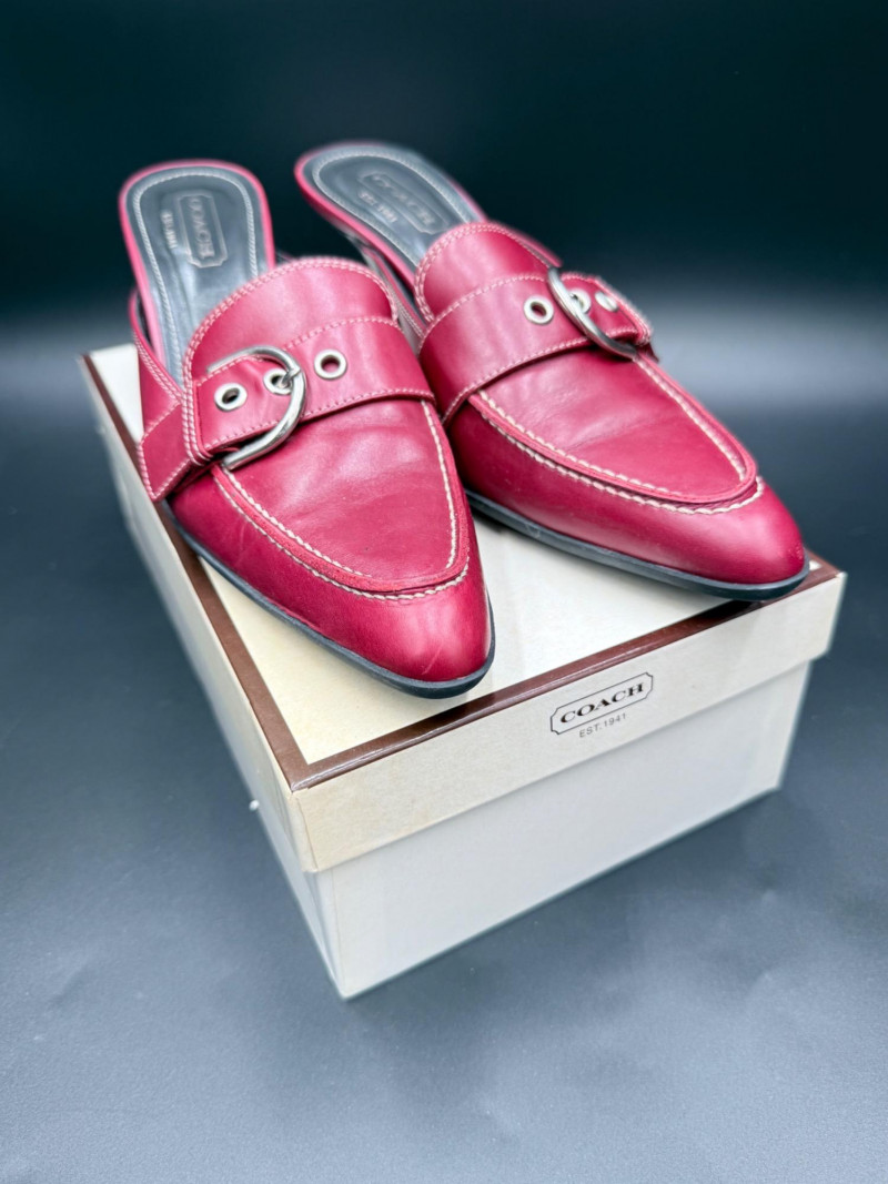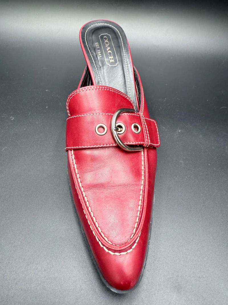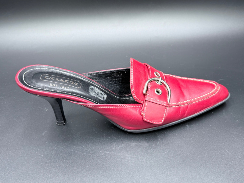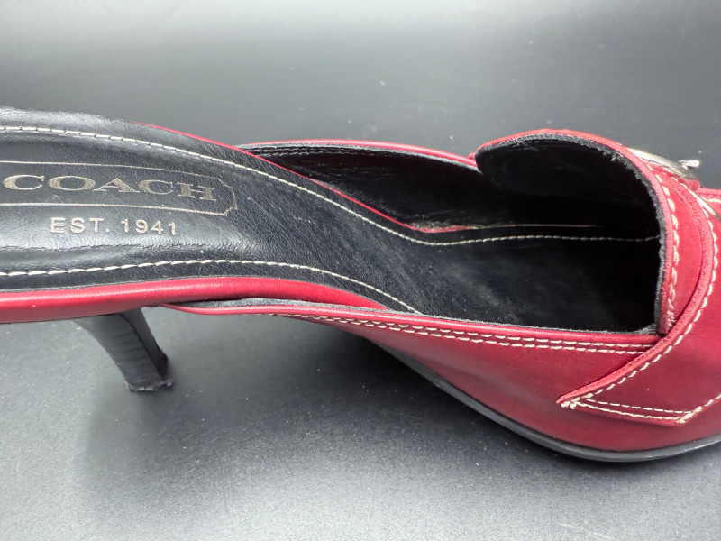 Coach Classic Red Leather Slides – Size 8.5 Backless heeled mules in red leather with stitched detailing and a metal buckle strap across the vamp. Features black insoles with embossed branding and sculpted black heels. Soles are rubber with logo tread. Includes original box. Size: 8.5