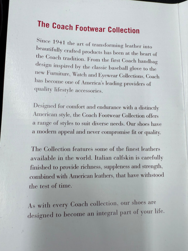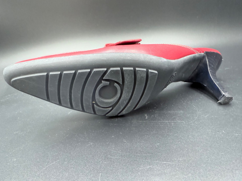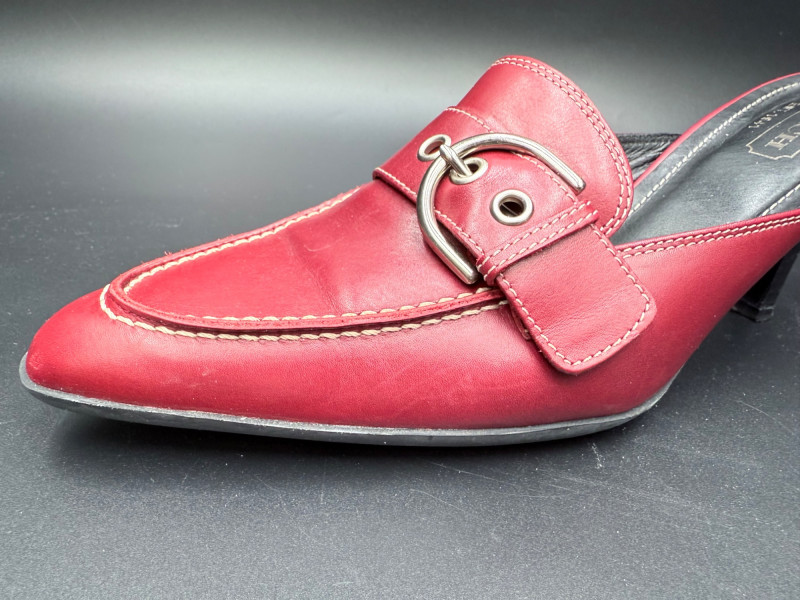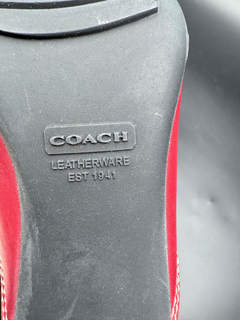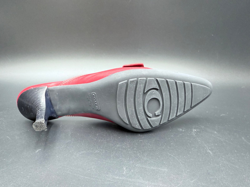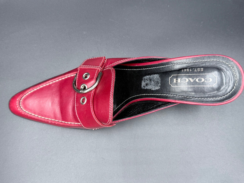 Coach Classic Red Leather Slides – Size 8.5 Backless heeled mules in red leather with stitched detailing and a metal buckle strap across the vamp. Features black insoles with embossed branding and sculpted black heels. Soles are rubber with logo tread. Includes original box. Size: 8.5