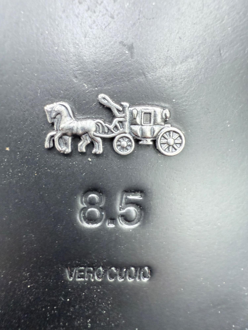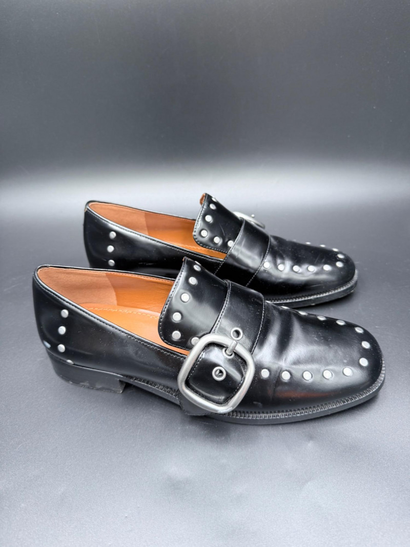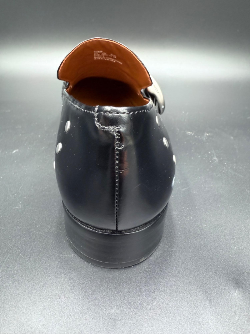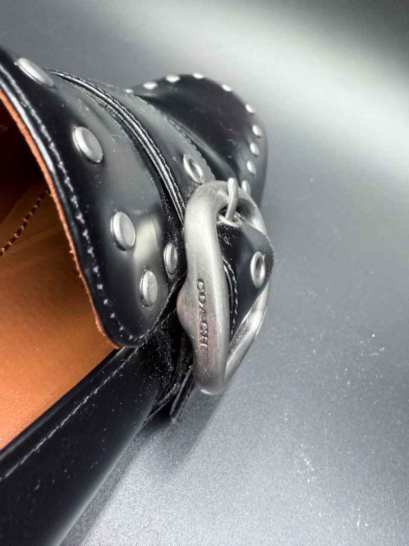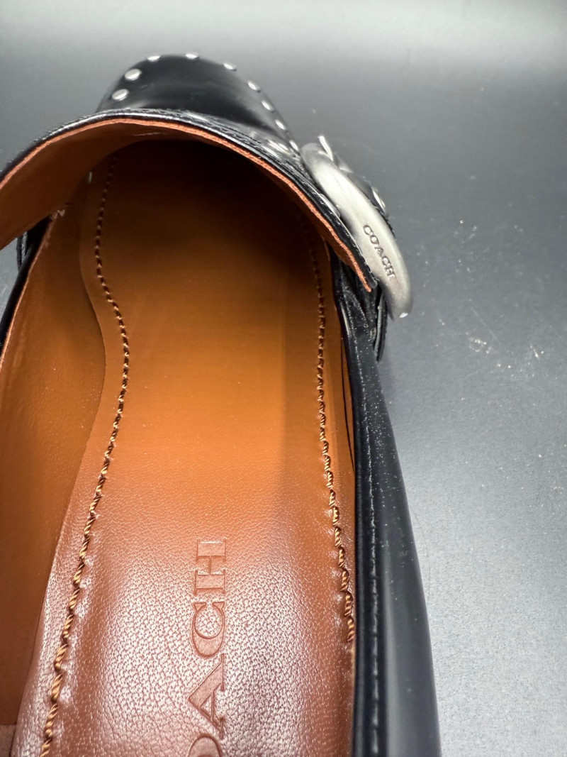 Coach Black Leather Studded Loafers – Size 8.5 Black leather loafers with metal stud detailing and a large front buckle. Features brown leather interior lining with embossed Coach branding. Marked “VERO CUOIO” and “8.5” on the sole, with wear visible on the outsole. Size: 8.5