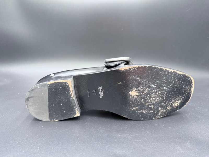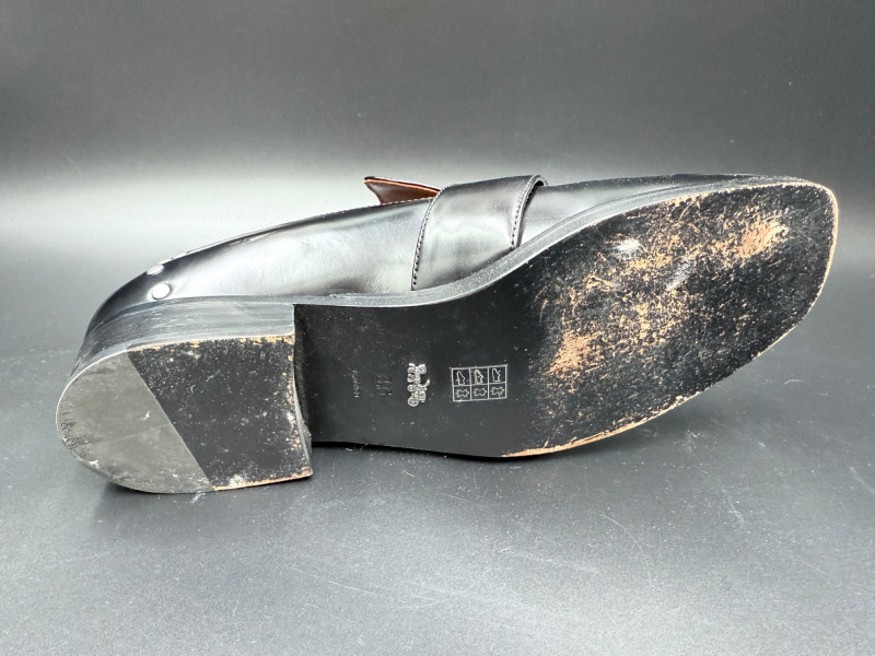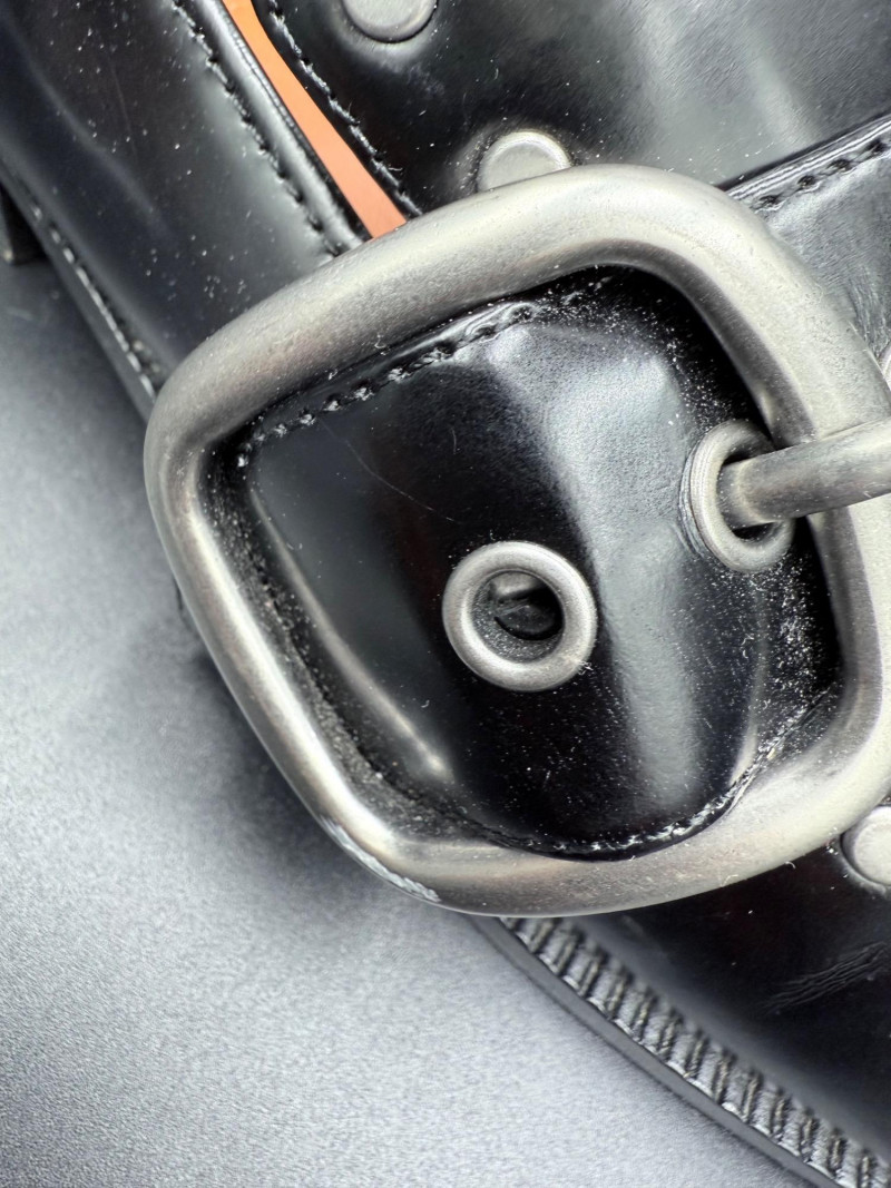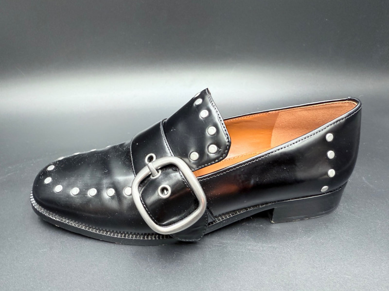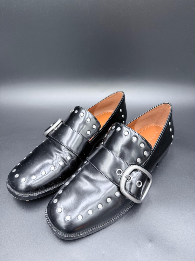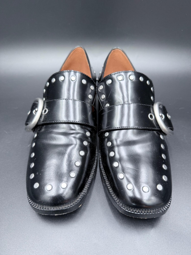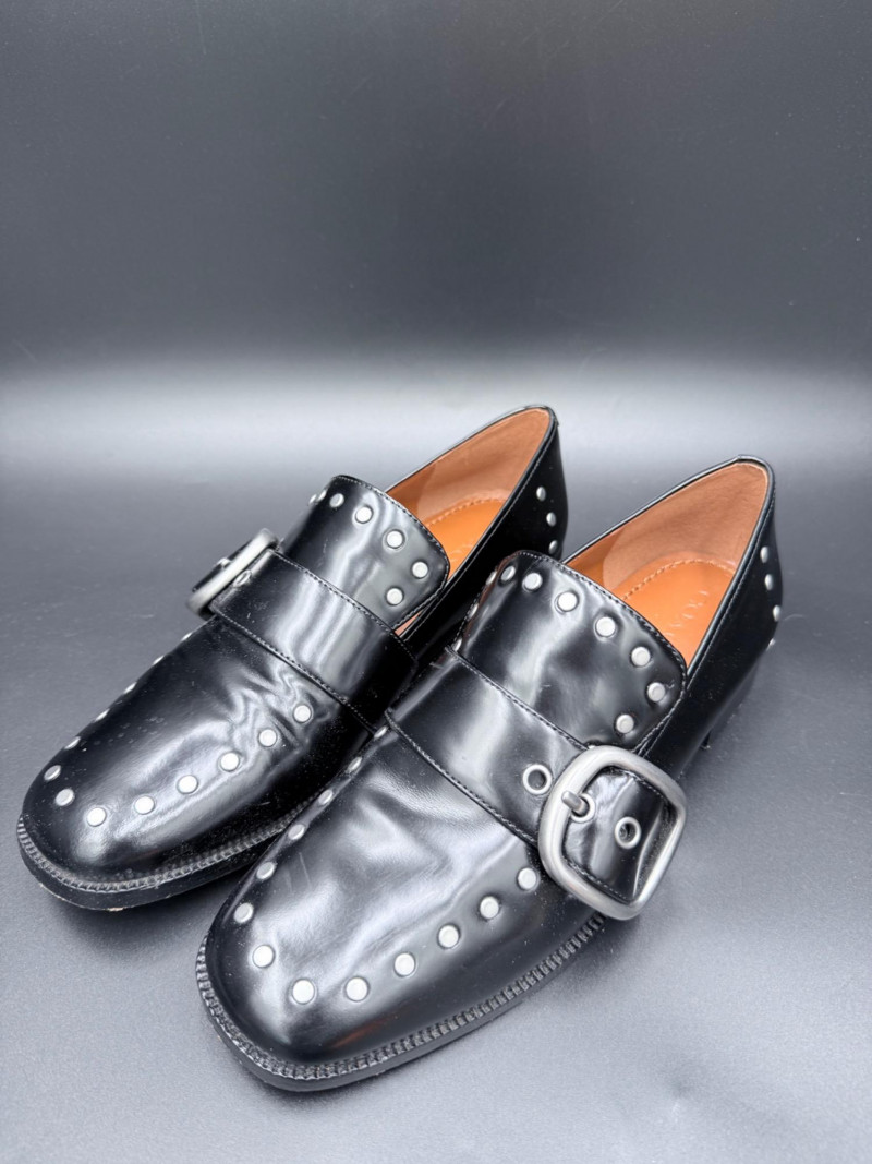 Coach Black Leather Studded Loafers – Size 8.5 Black leather loafers with metal stud detailing and a large front buckle. Features brown leather interior lining with embossed Coach branding. Marked “VERO CUOIO” and “8.5” on the sole, with wear visible on the outsole. Size: 8.5