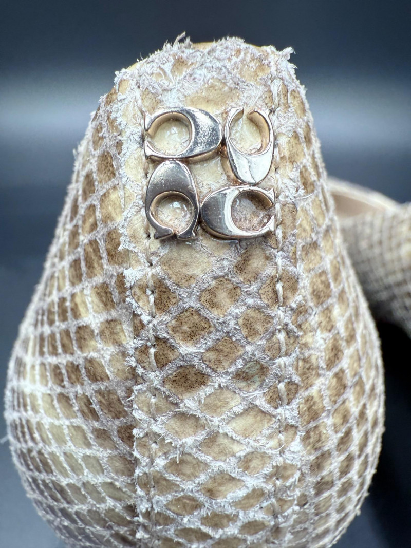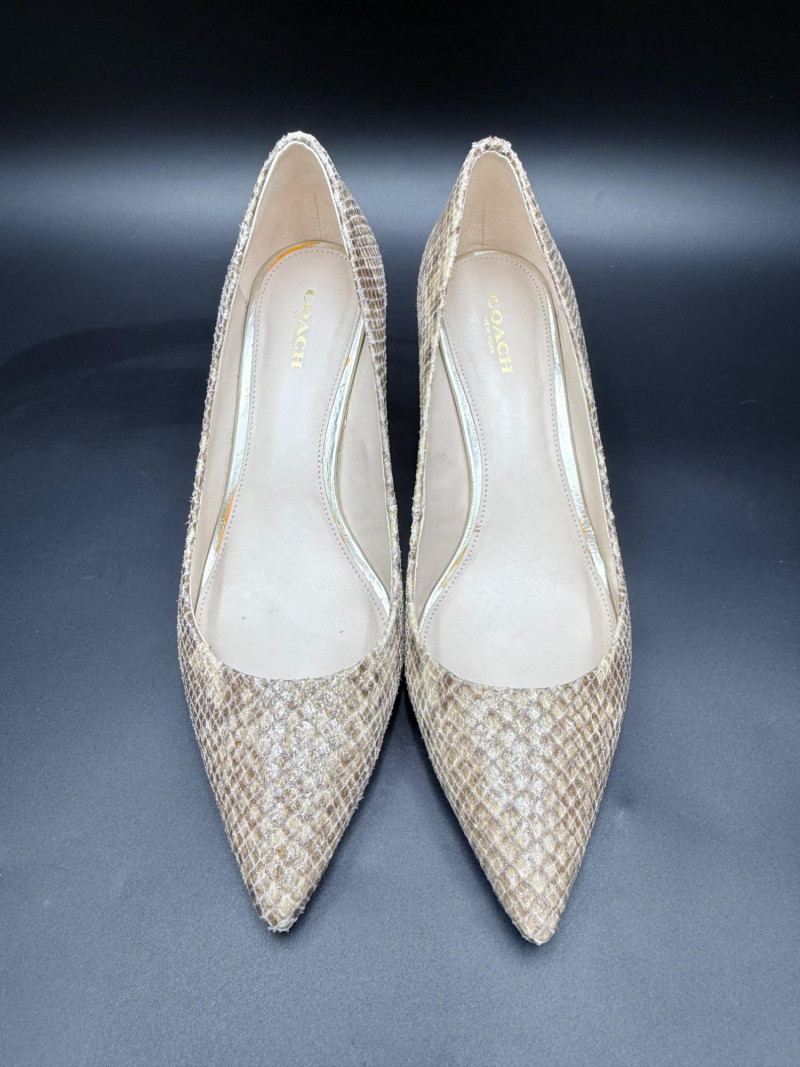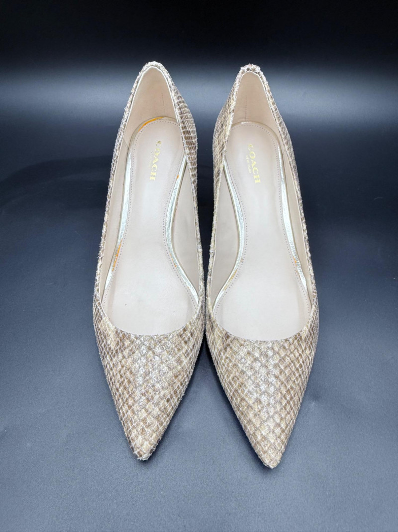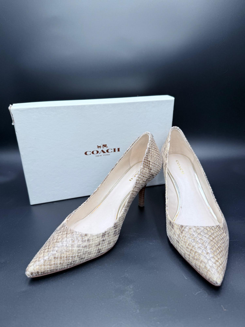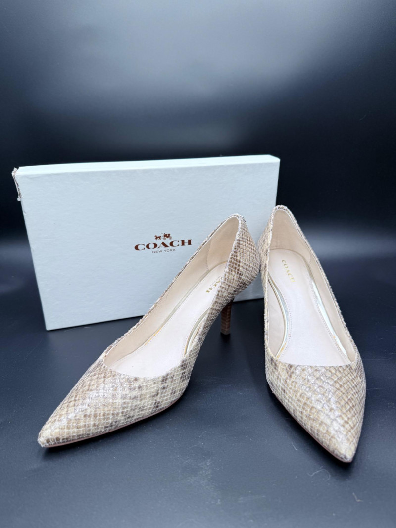 Coach Snakeskin-Pattern Heels – Size 8.5 Pair of Coach heels with a synthetic upper designed to resemble snakeskin. Features include a pointed toe, slender heel, and Coach logo embellishment on the heel counter. The material is not real snakeskin. Insoles and soles are branded and marked size 8.5 B. Includes original Coach box.