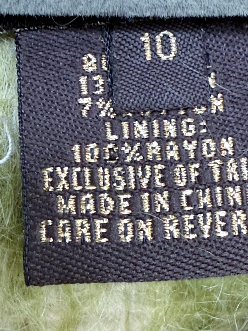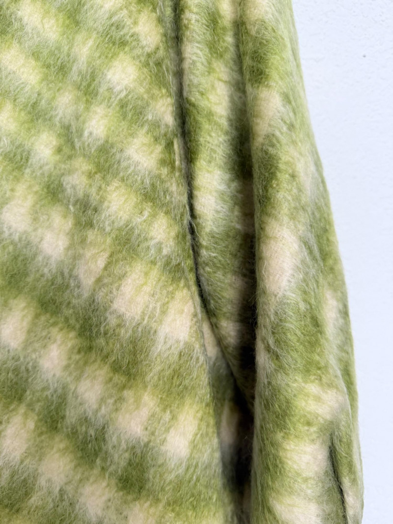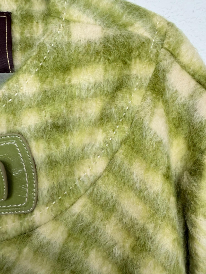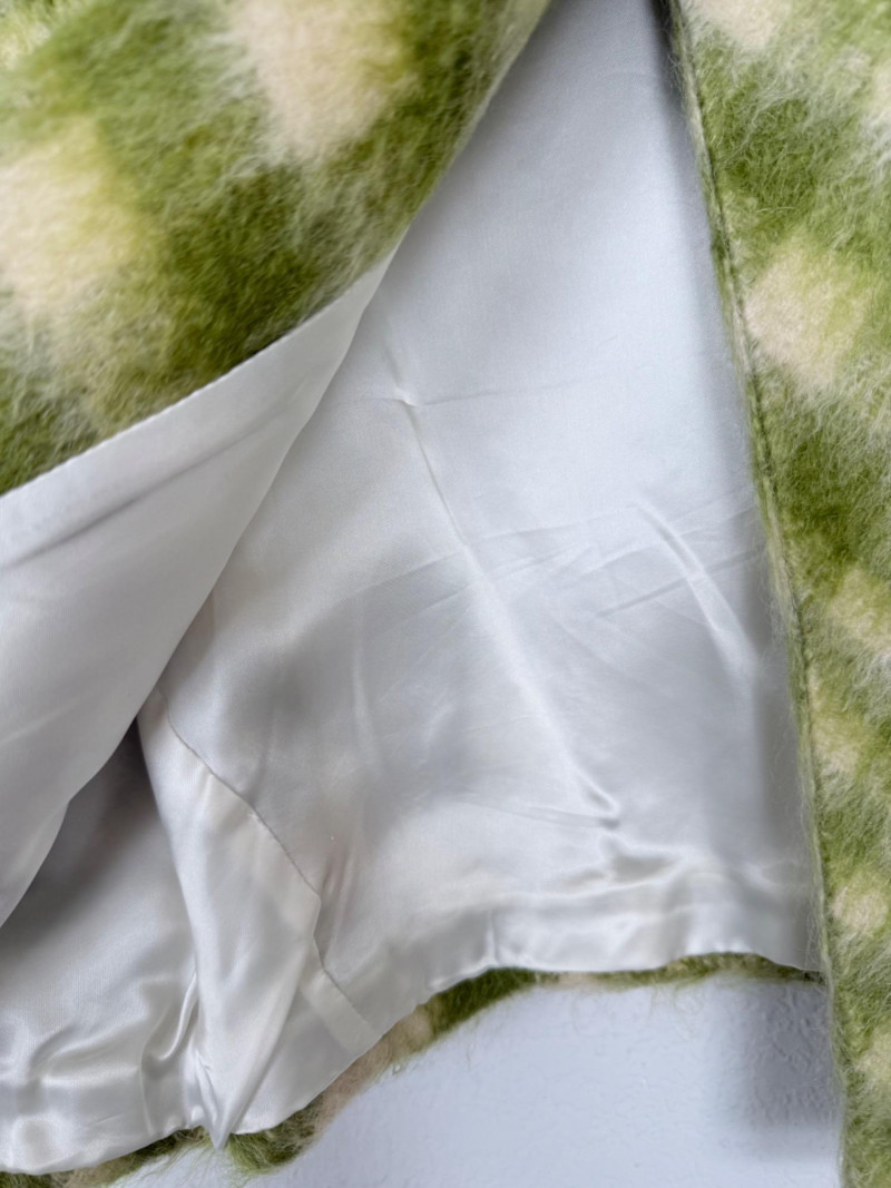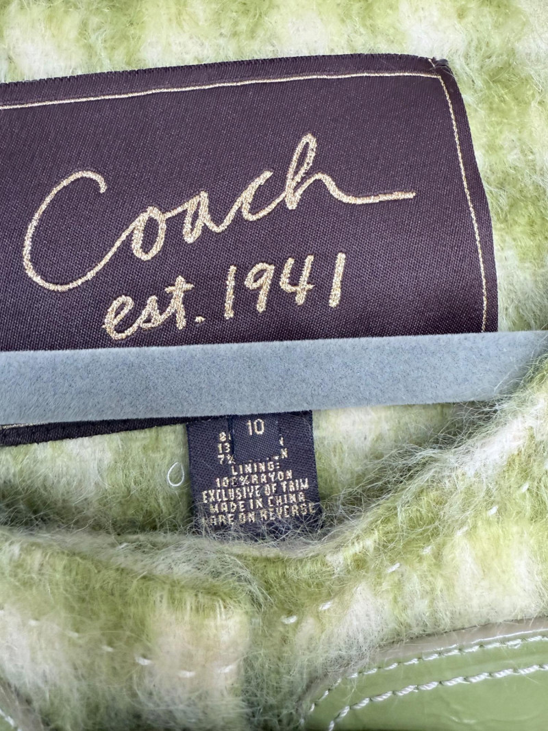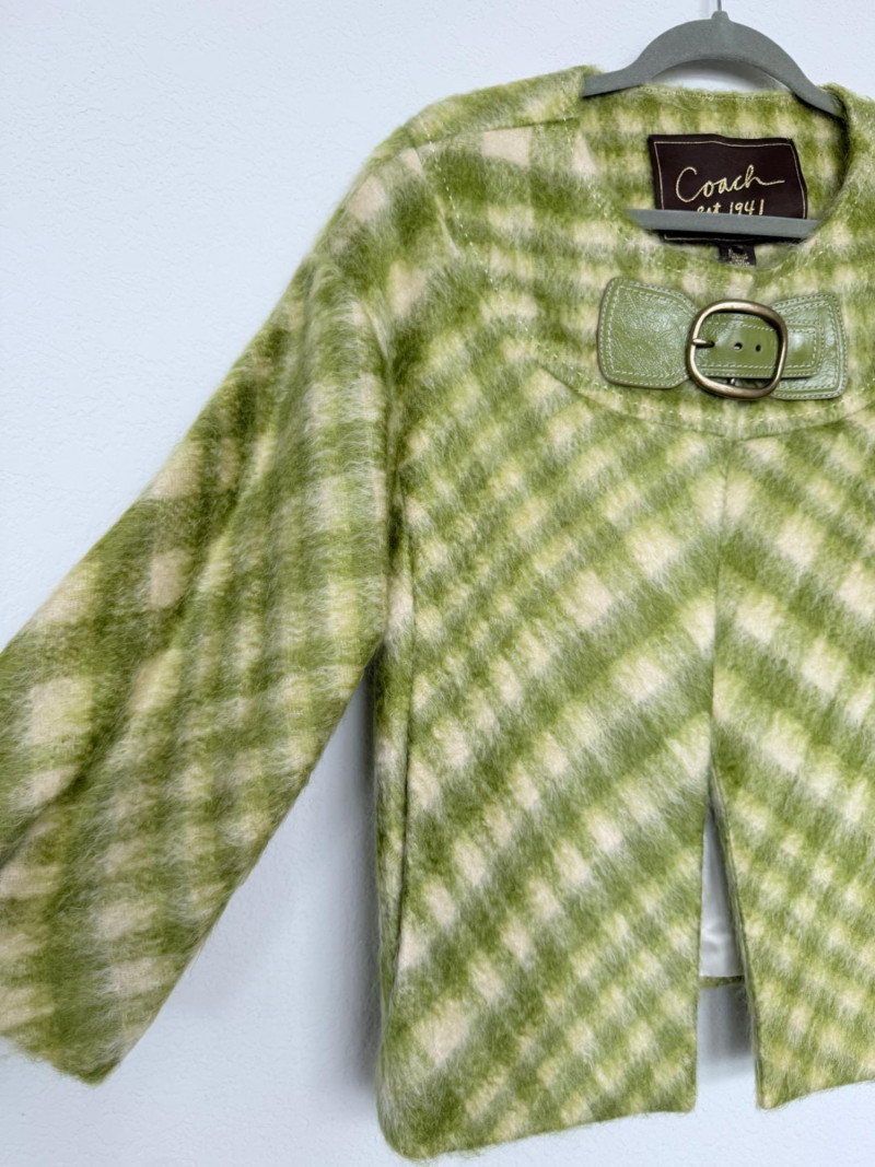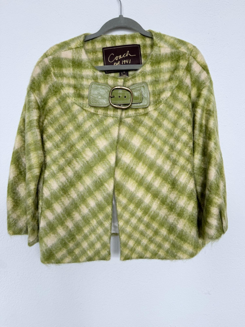 Coach est. 1941 Wool Blend Jacket – Size 10 Open-front jacket featuring a green and ivory check pattern. Designed with a round neckline, wide sleeves, and a belt detail at the collar. Fully lined with rayon. Shell: 80% wool, 13% nylon, 7% cotton