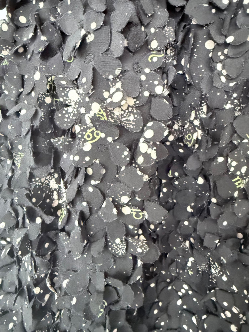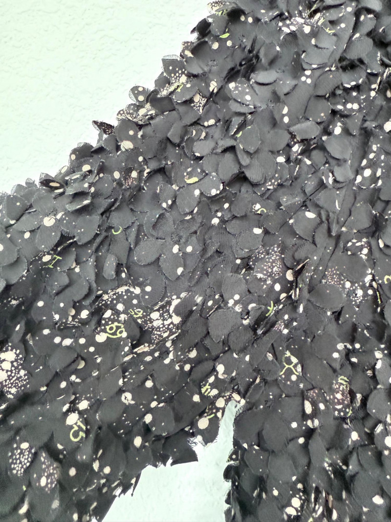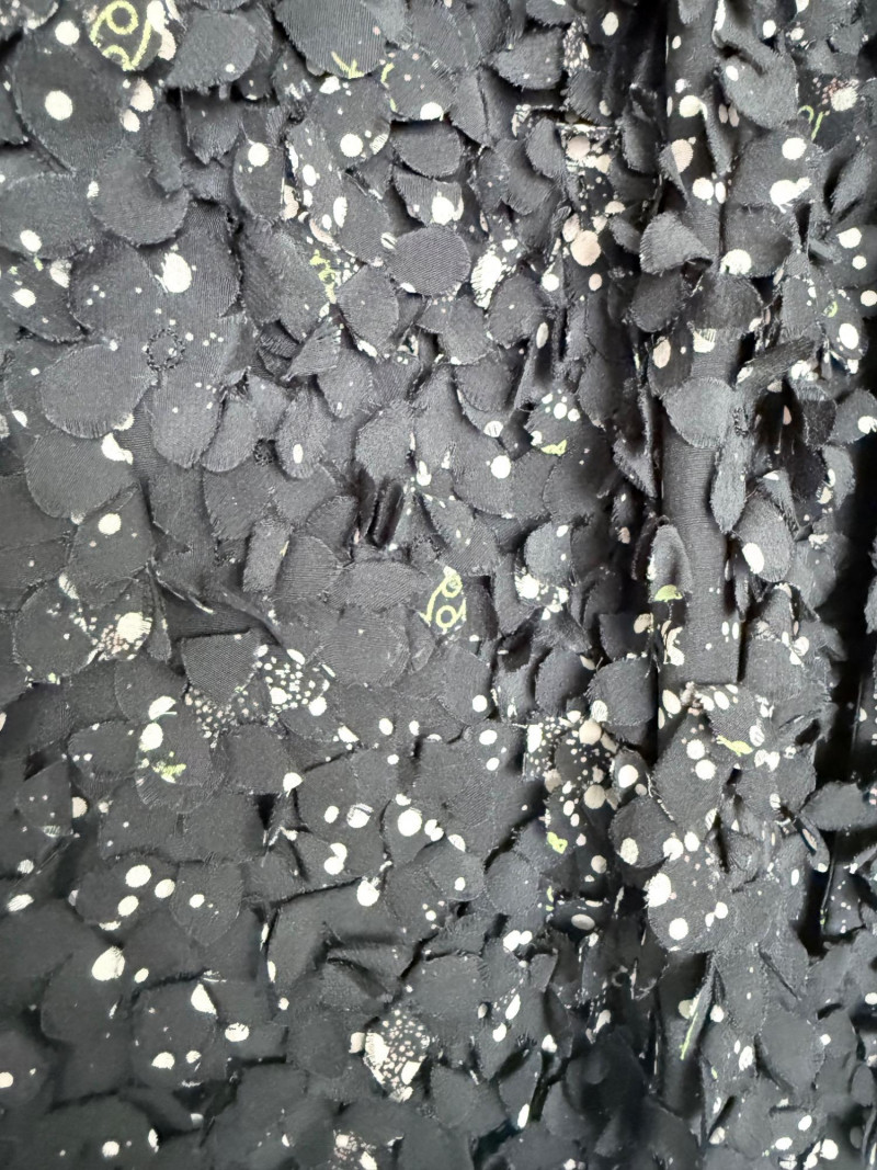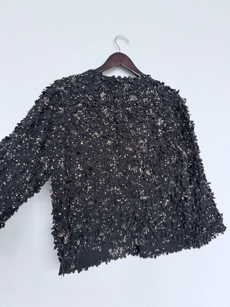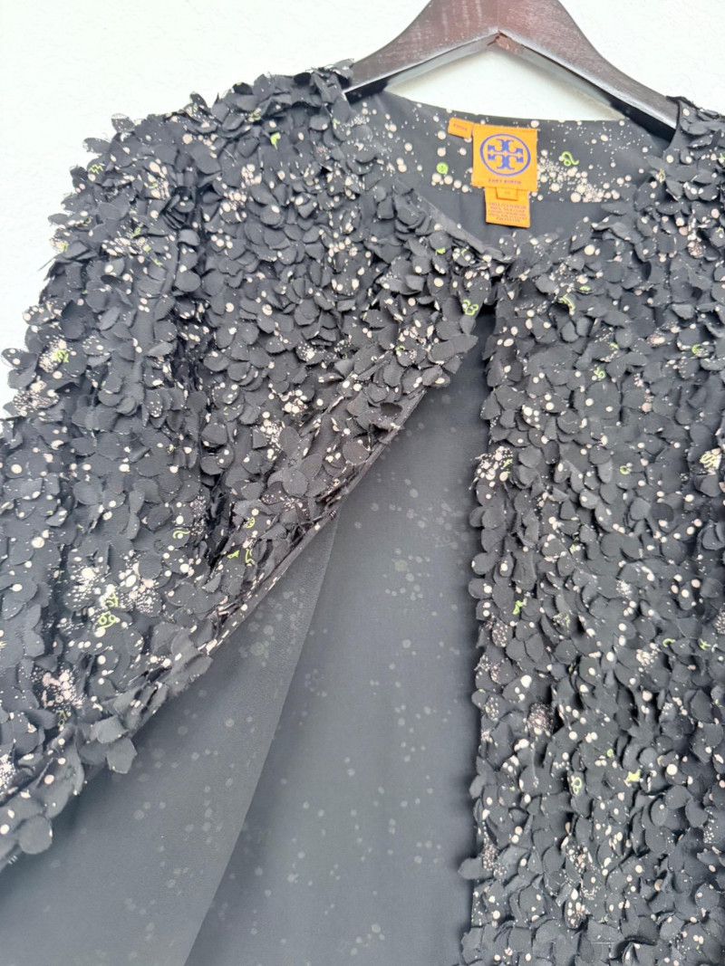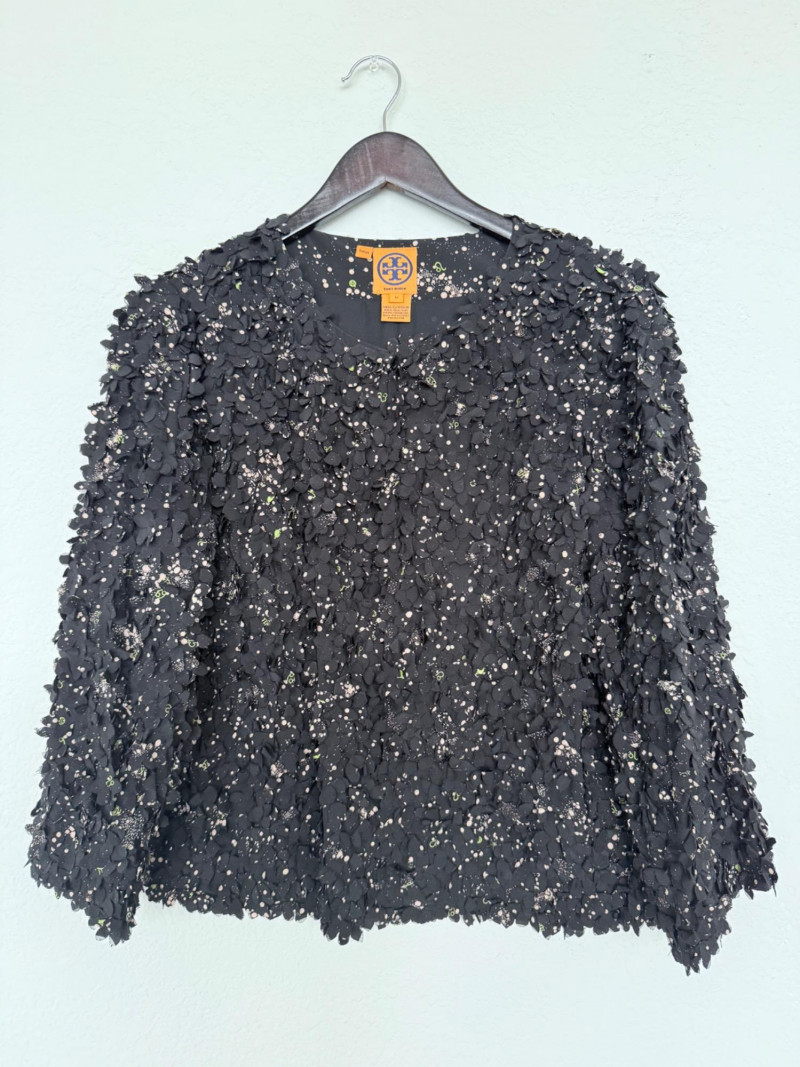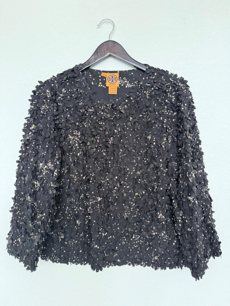 Tory Burch Black Embellished Silk Jacket – Size 12 Black jacket with layered silk petals throughout and scattered printed accents. Features a hook-and-eye front closure and round neckline. Fully lined in polyester. Style: 22091519 Material: Shell: 100% Silk Lining: 100% Polyester