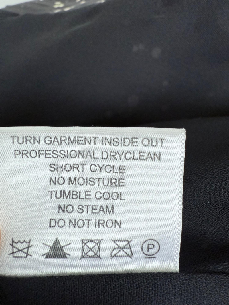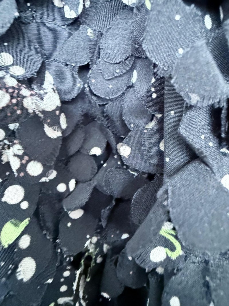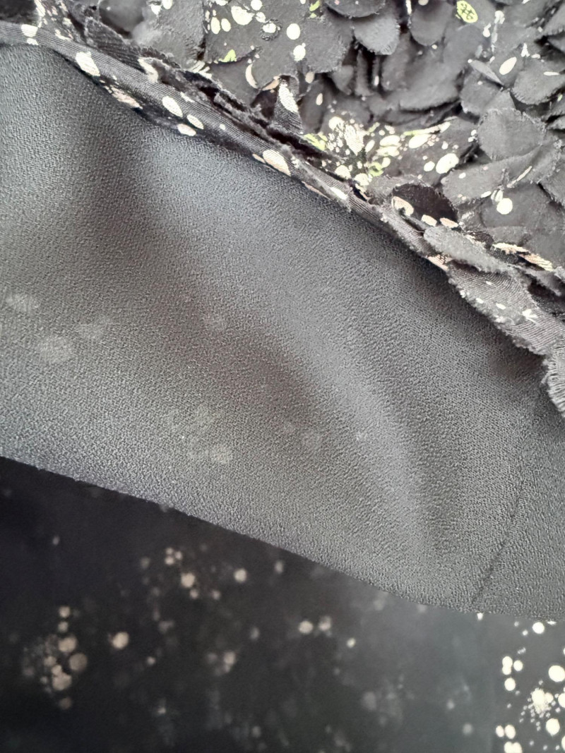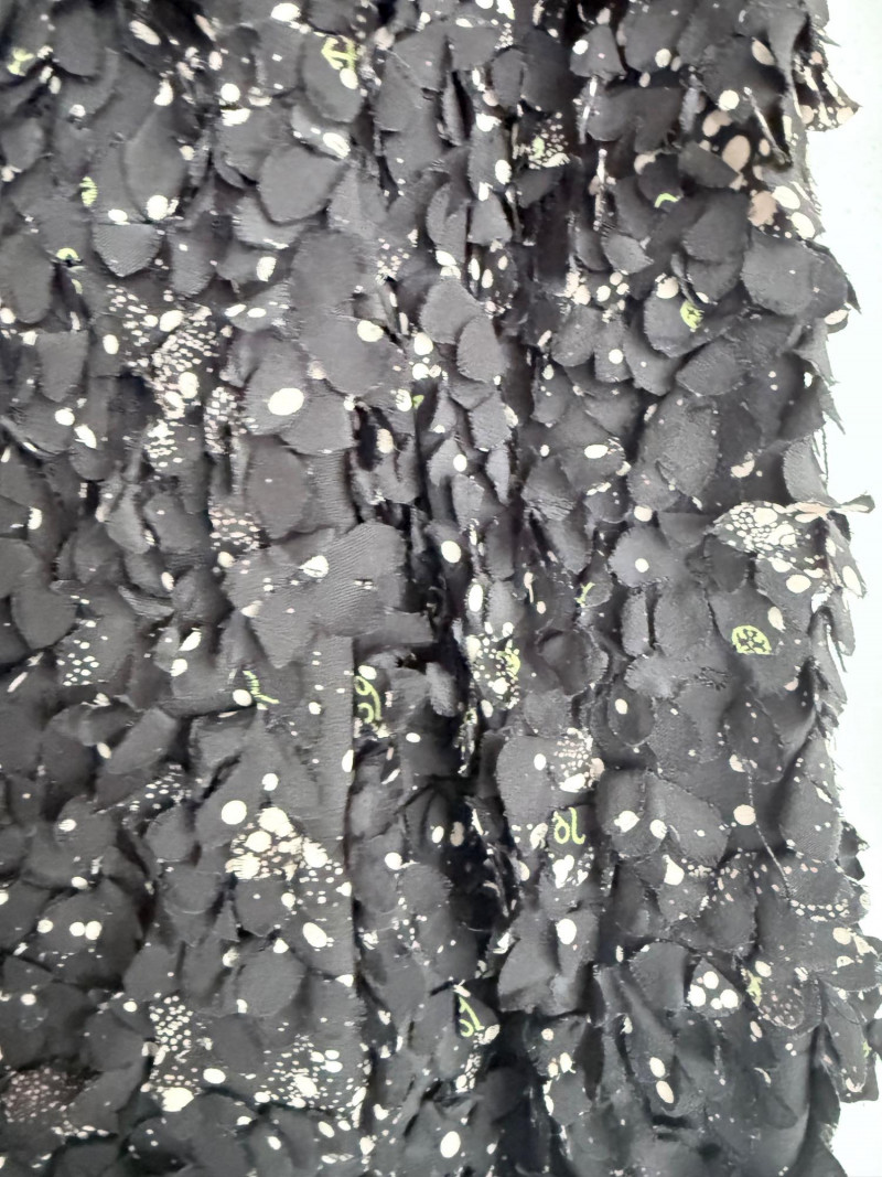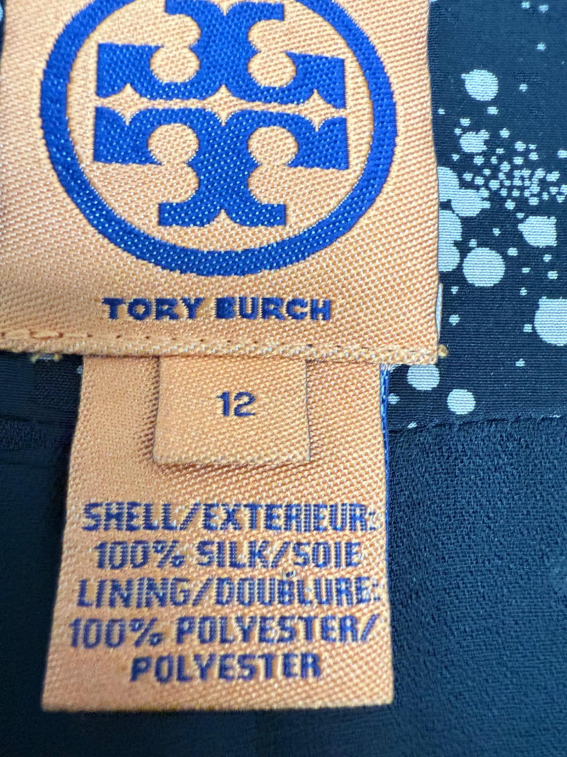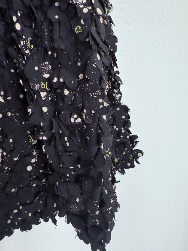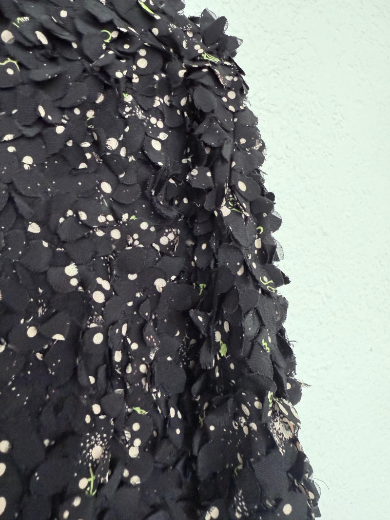 Tory Burch Black Embellished Silk Jacket – Size 12 Black jacket with layered silk petals throughout and scattered printed accents. Features a hook-and-eye front closure and round neckline. Fully lined in polyester. Style: 22091519 Material: Shell: 100% Silk Lining: 100% Polyester