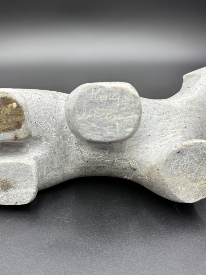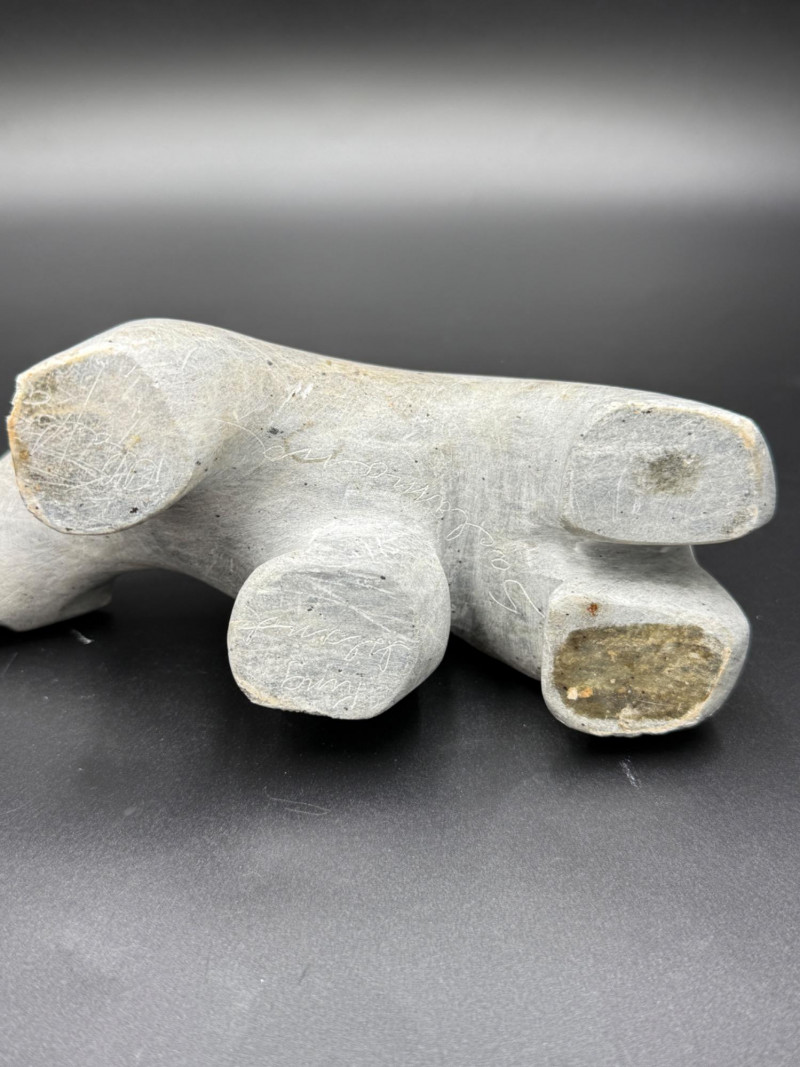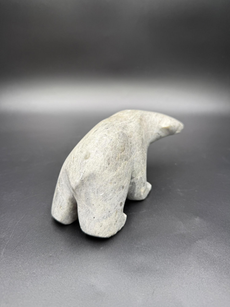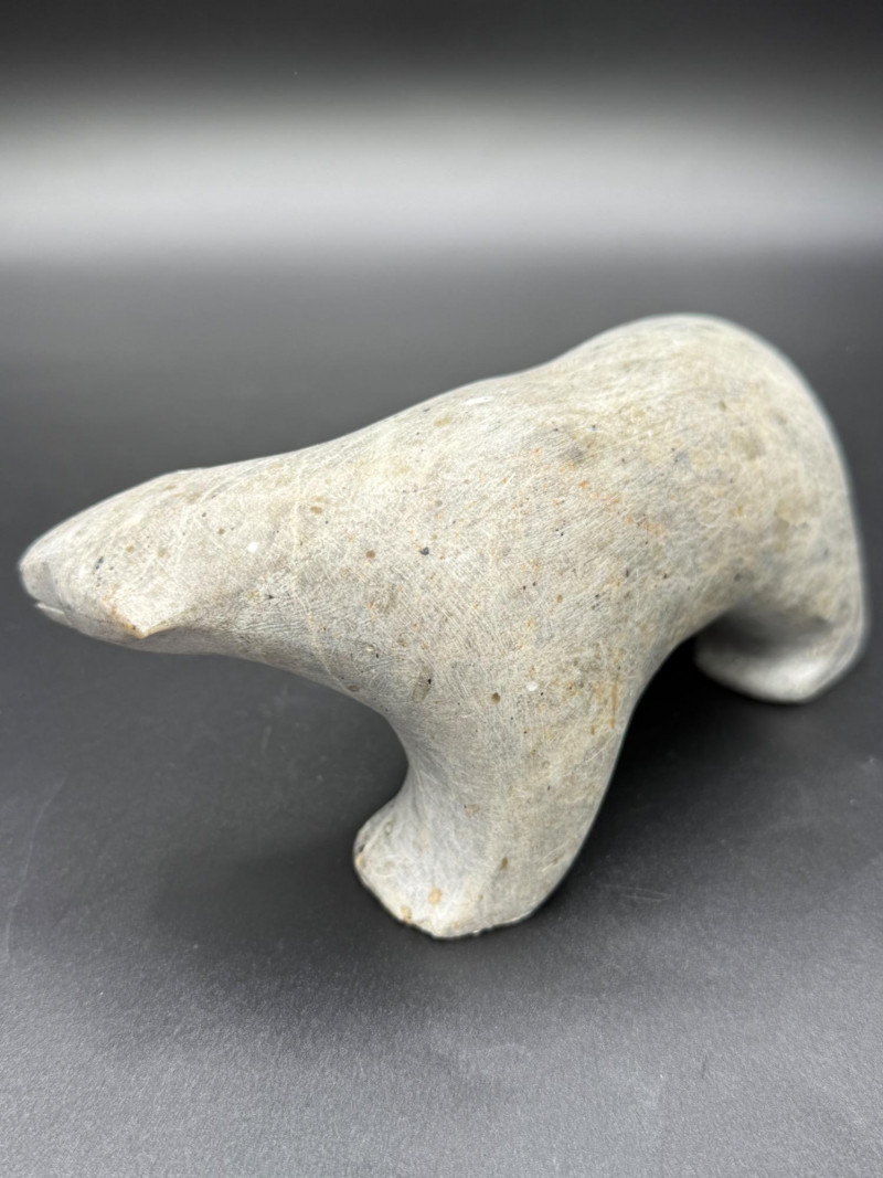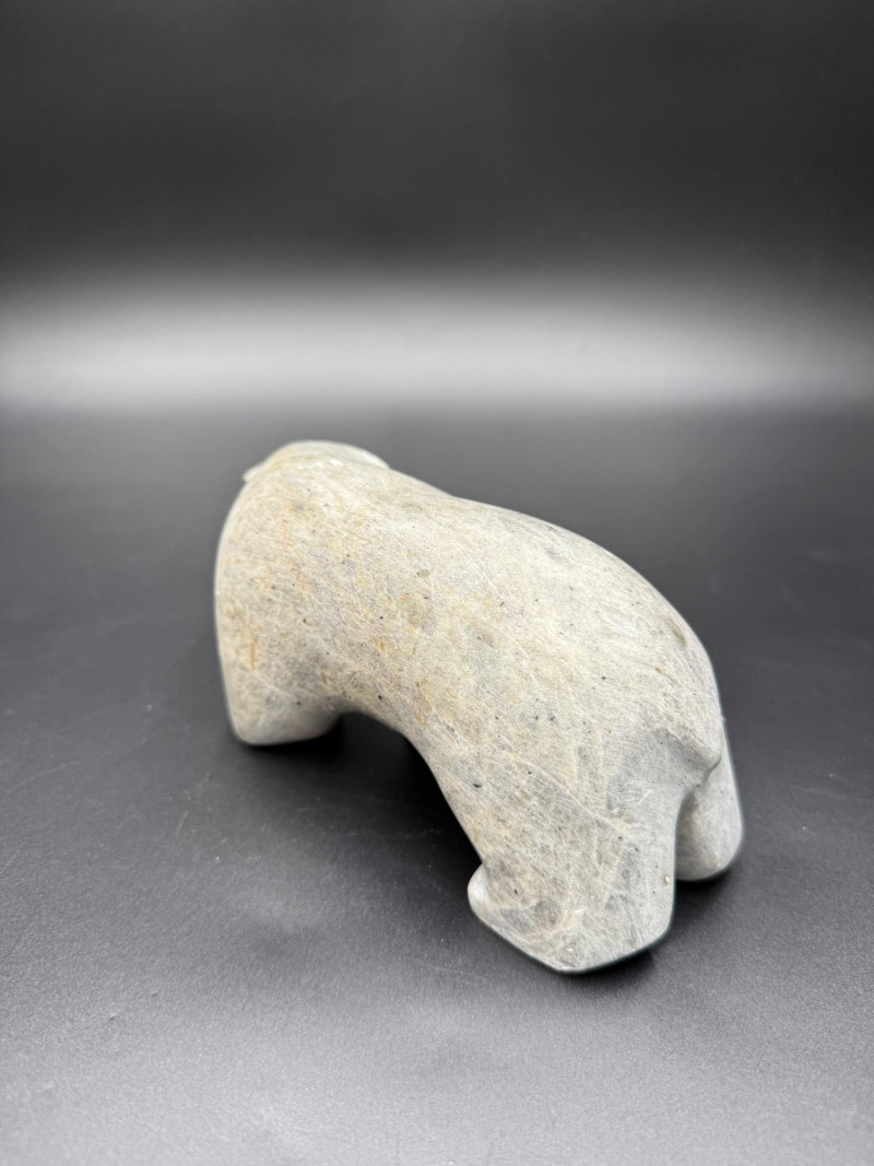 Hand-Carved Stone Polar Bear Sculpture – 7" Artisan Carving Description: Expertly shaped with an understated, timeless form, this sculpture channels the aesthetic of Northern and Indigenous carving traditions while remaining versatile enough for any sophisticated collection. The cool-toned stone reveals subtle variations and veining, emphasizing its natural origin and artisanal craftsmanship. Highlights: Hand-carved from solid stone Dimensions: 7" L x 3" W x 4" H Artist: Unknown Elegant minimalist form inspired by traditional carving styles Beautiful natural stone variations A distinctive, heirloom-quality art object Condition: Notes: